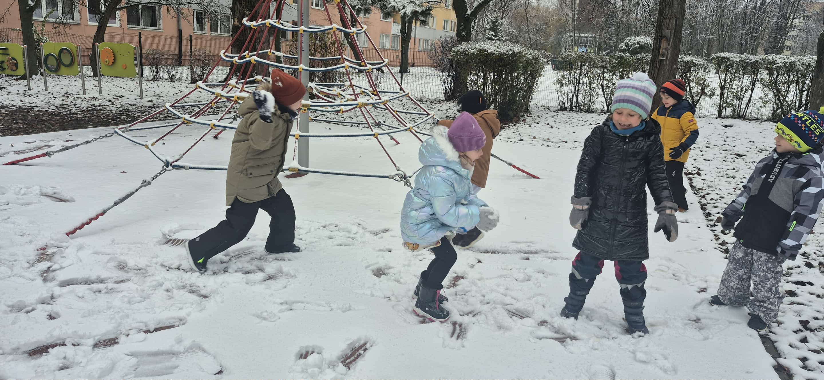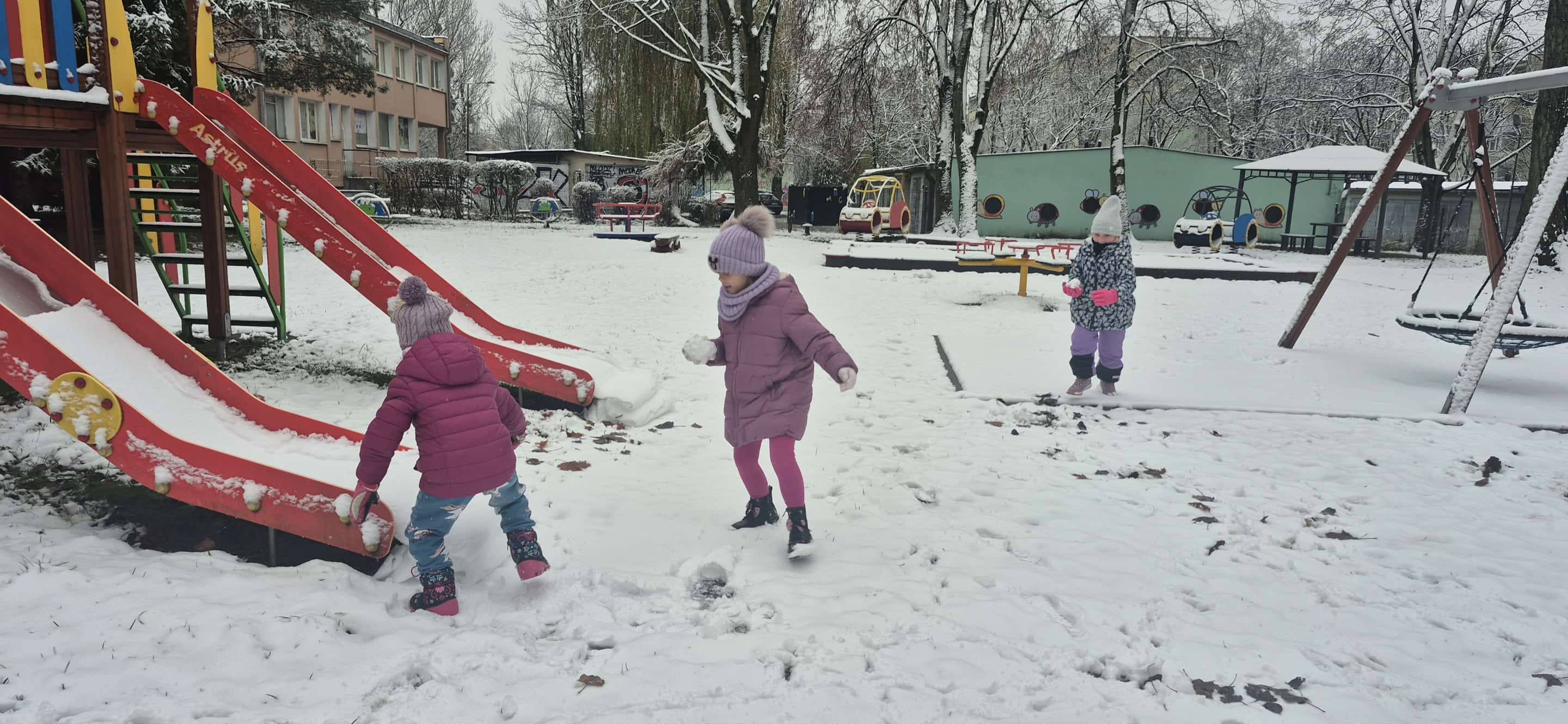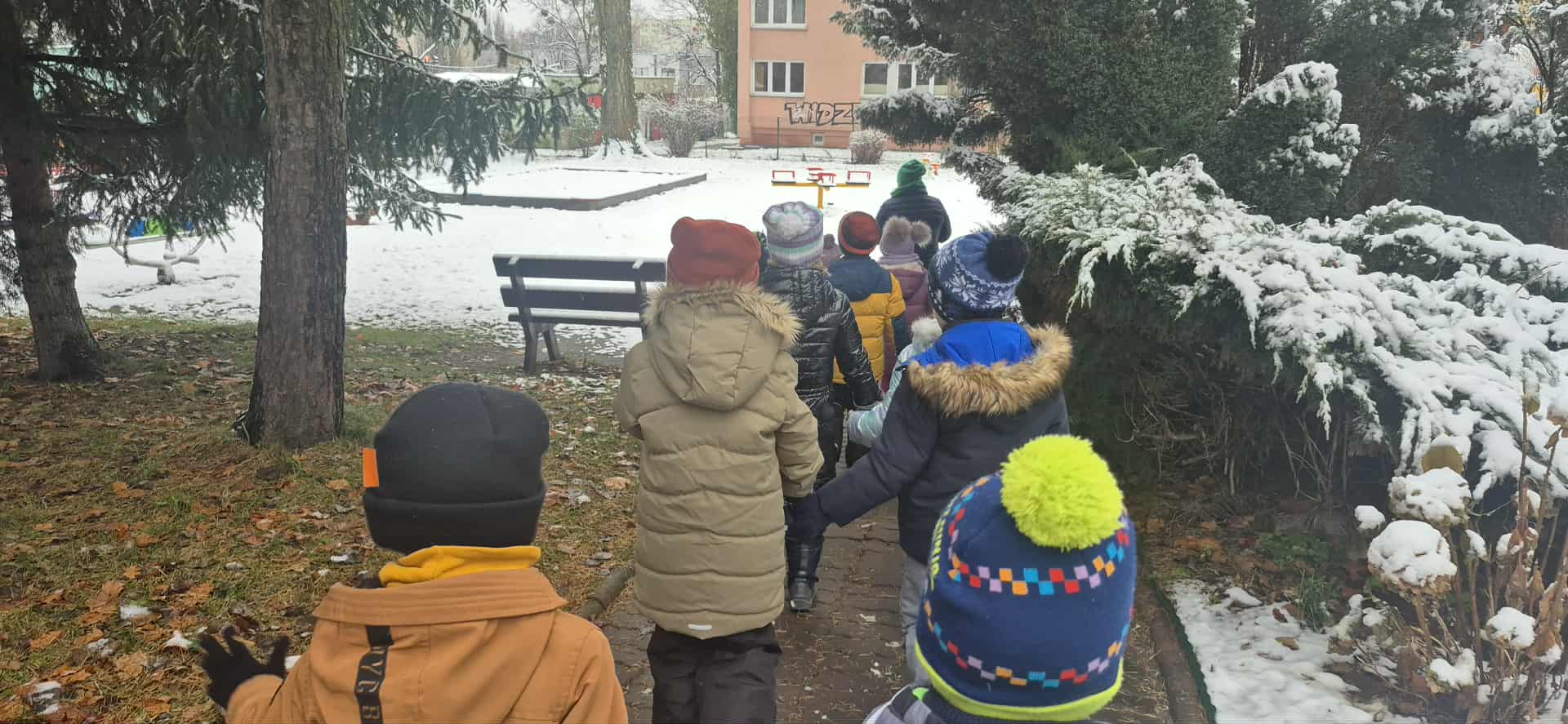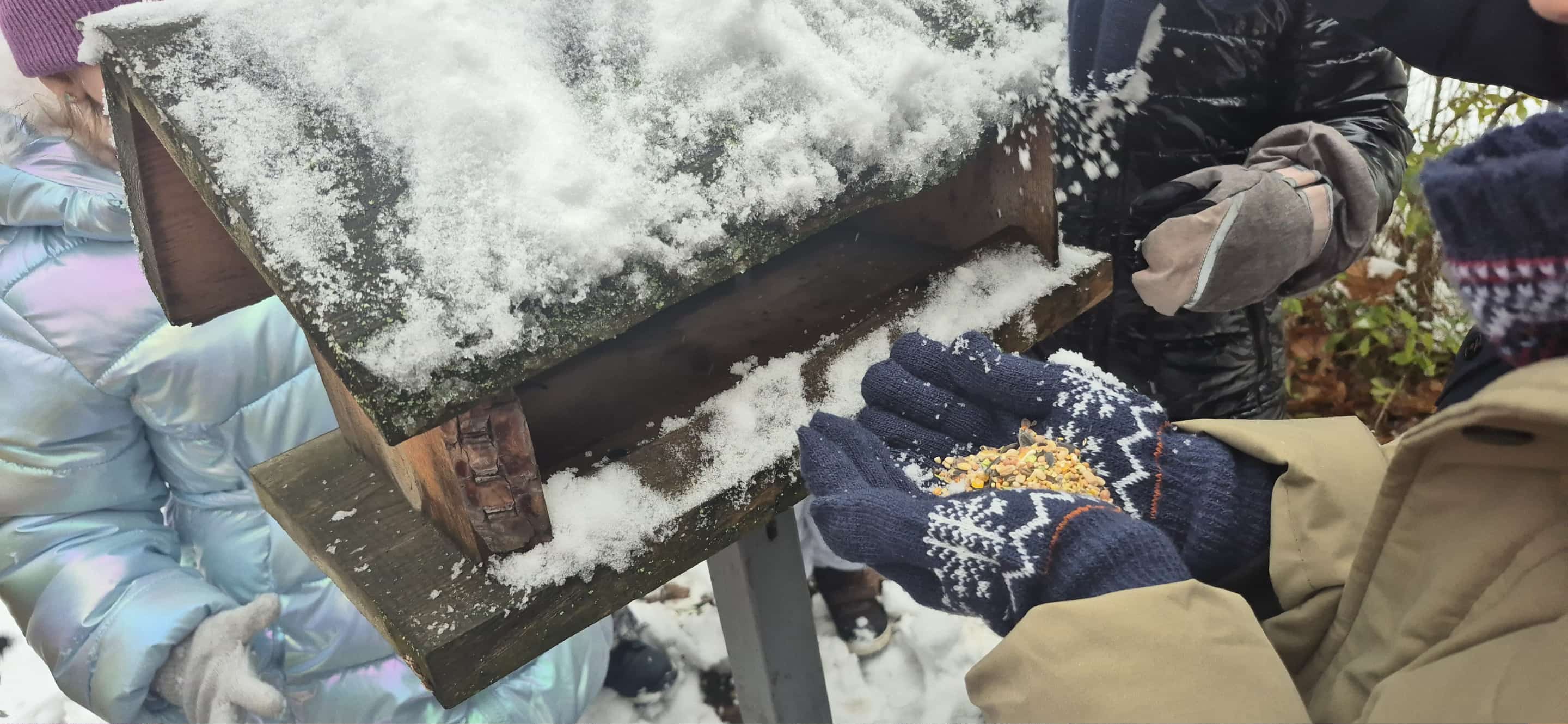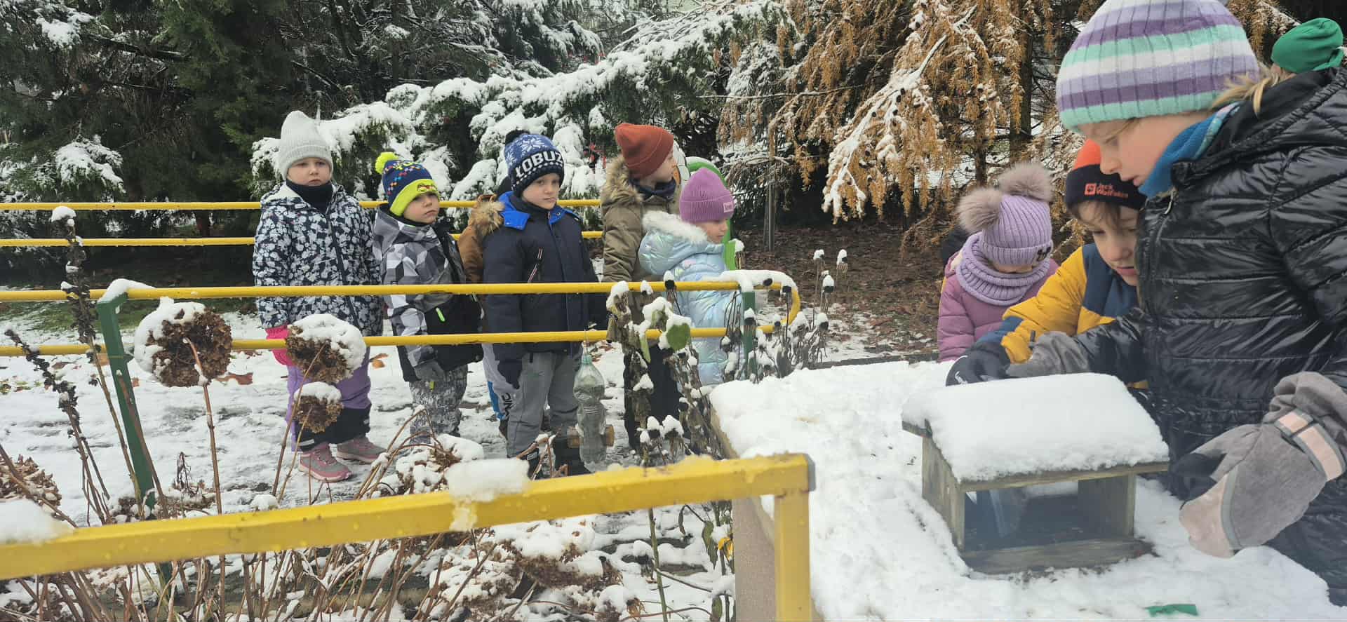 Przedszkolaki z grupy 5 rozmawiały na zajęciach dydaktycznych o tym w jaki sposób zwierzęta oraz ptaki przygotowują się do zimy. Dzieci rozpoznawały i nazywały ptaki, które odlatują na zimę do ciepłych krajów oraz te, które zostają w kraju. Dowiedziały się także o konieczności dokarmiania ptaków zimą i podczas wyjścia do przedszkolnego ogrodu dosypały ziarenka do karmników. Potem korzystały ze śnieżnej aury i bawiły się na śniegu.