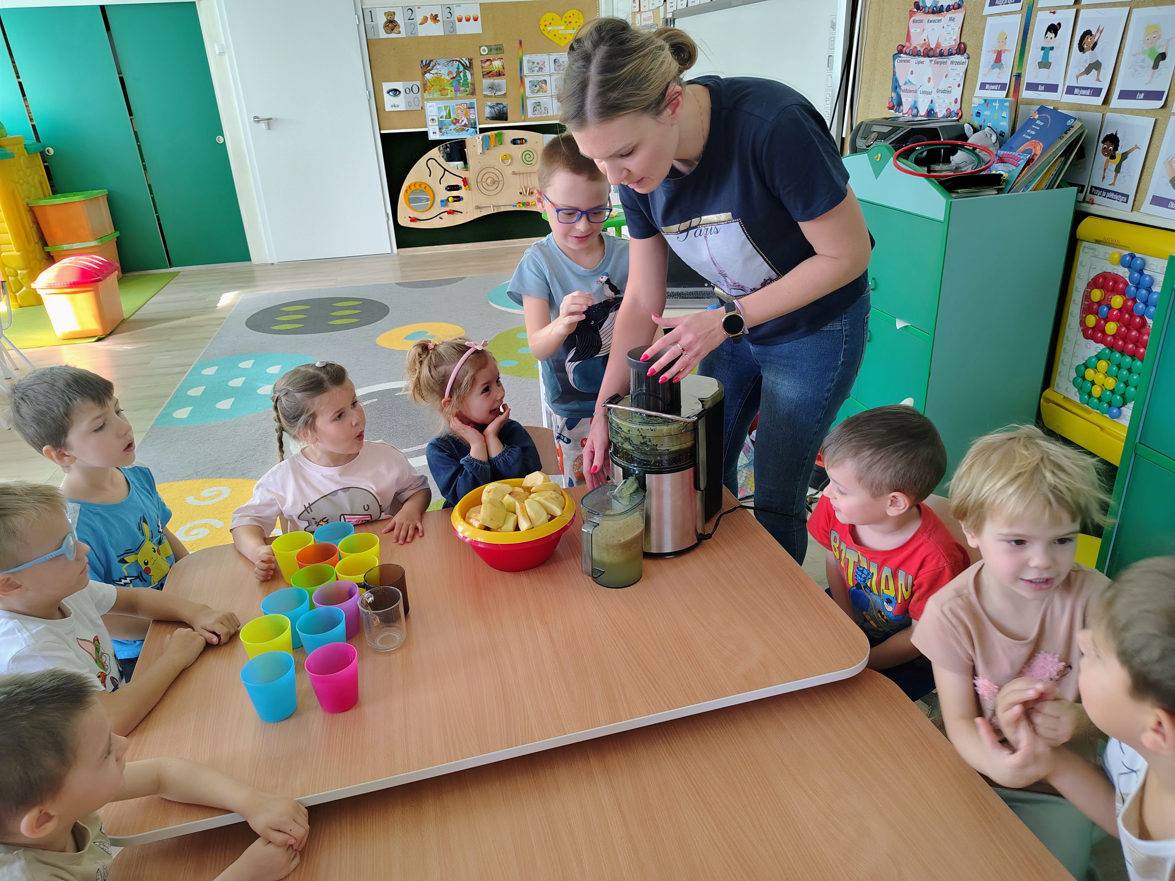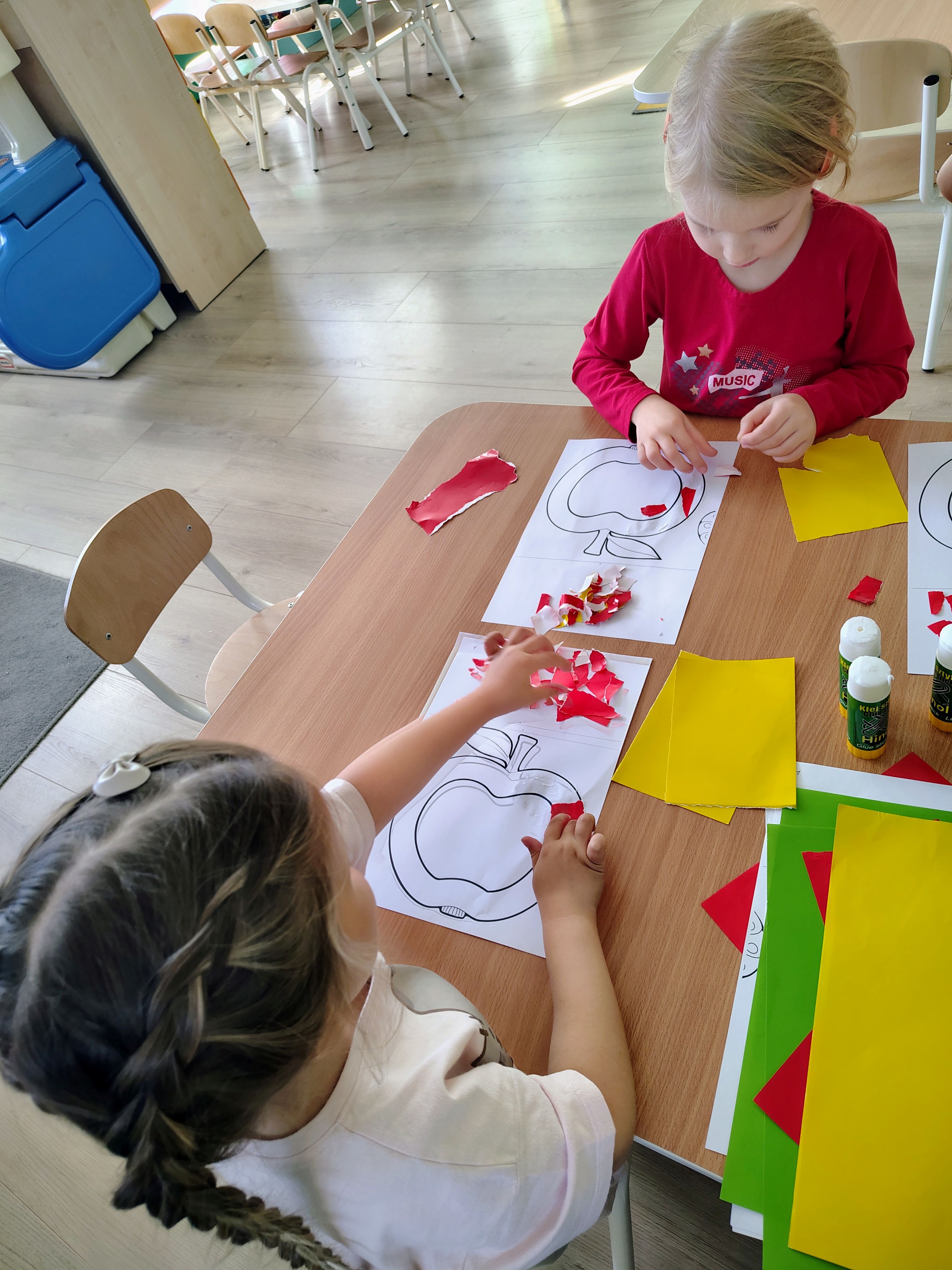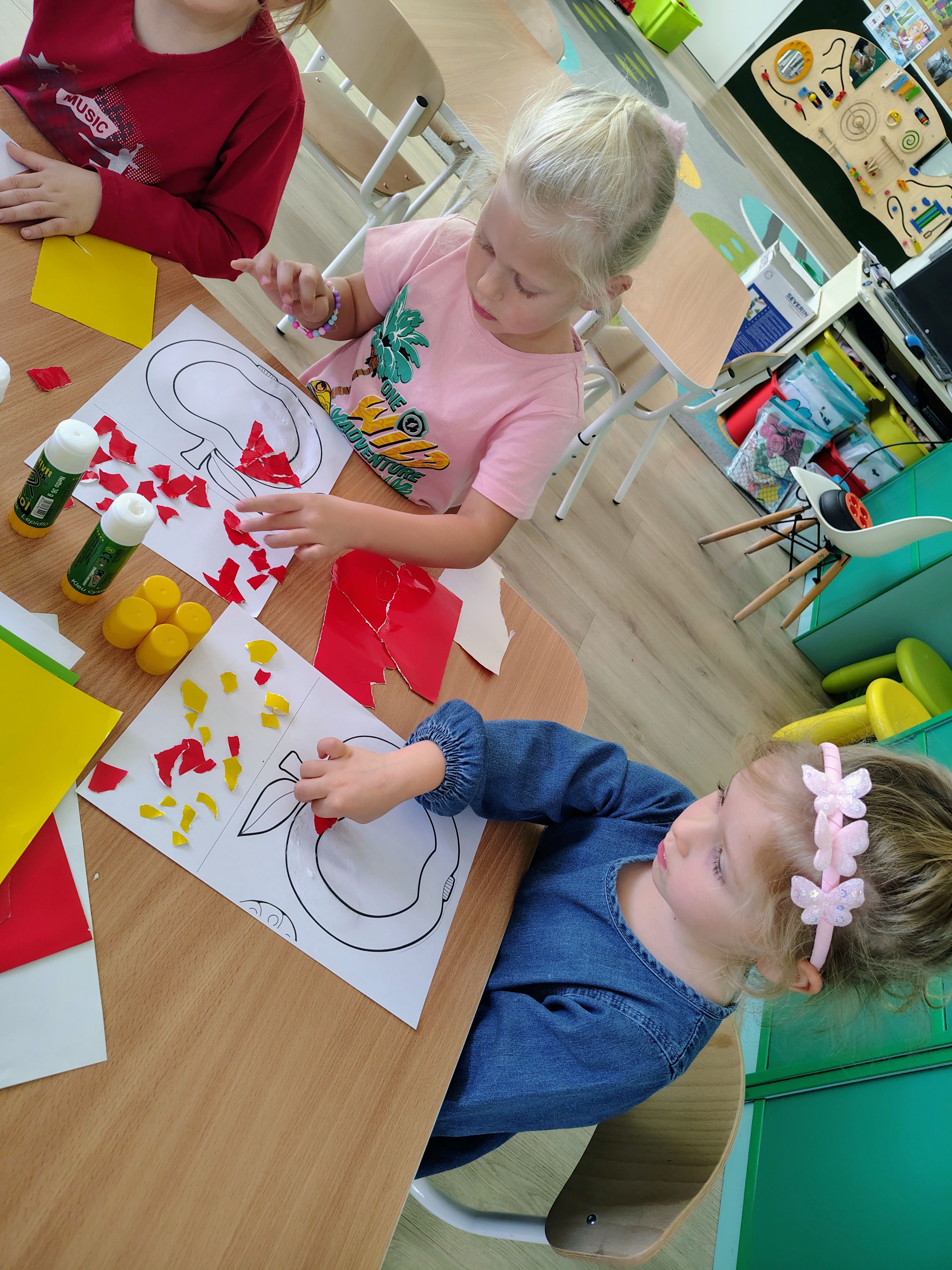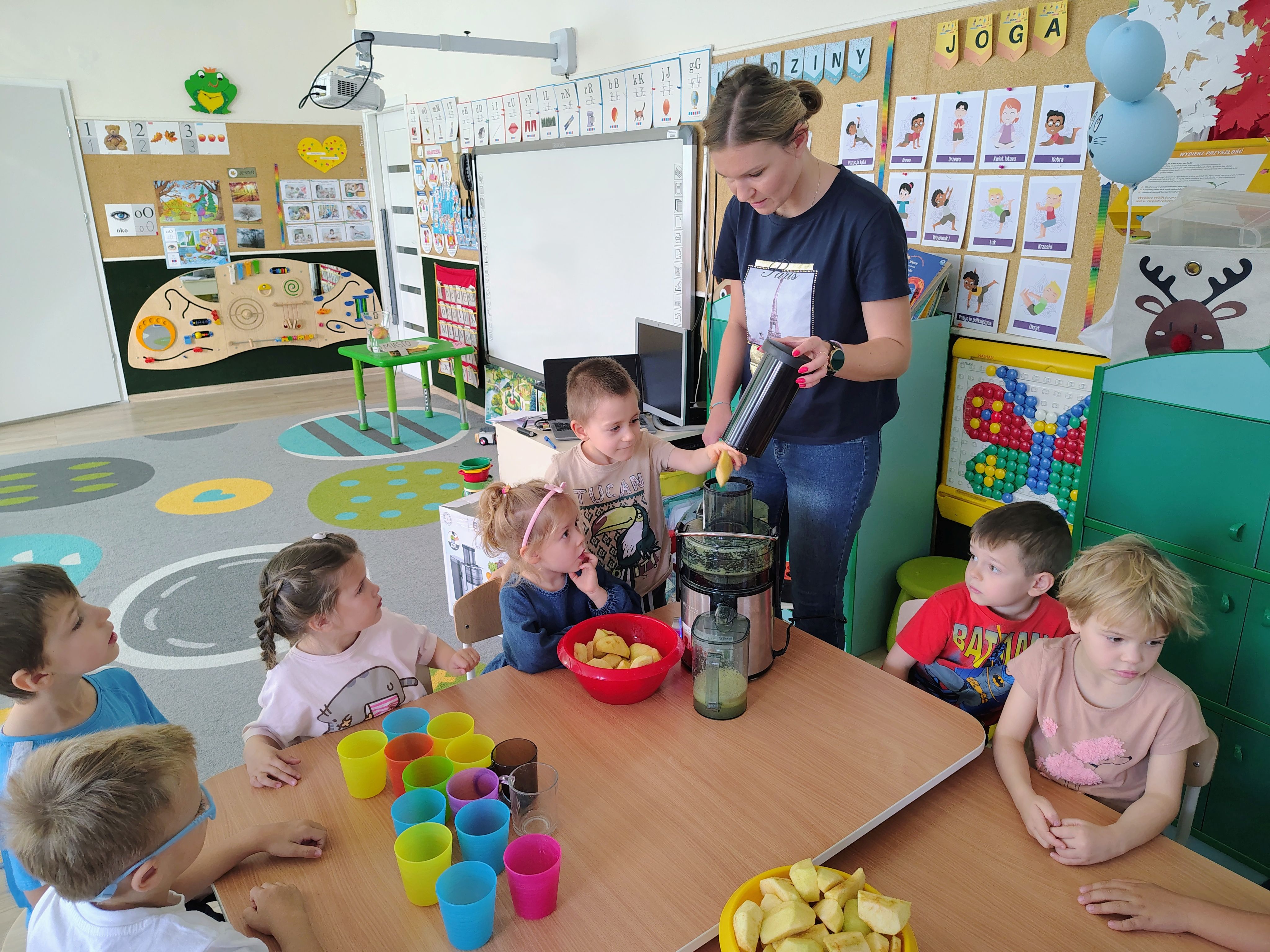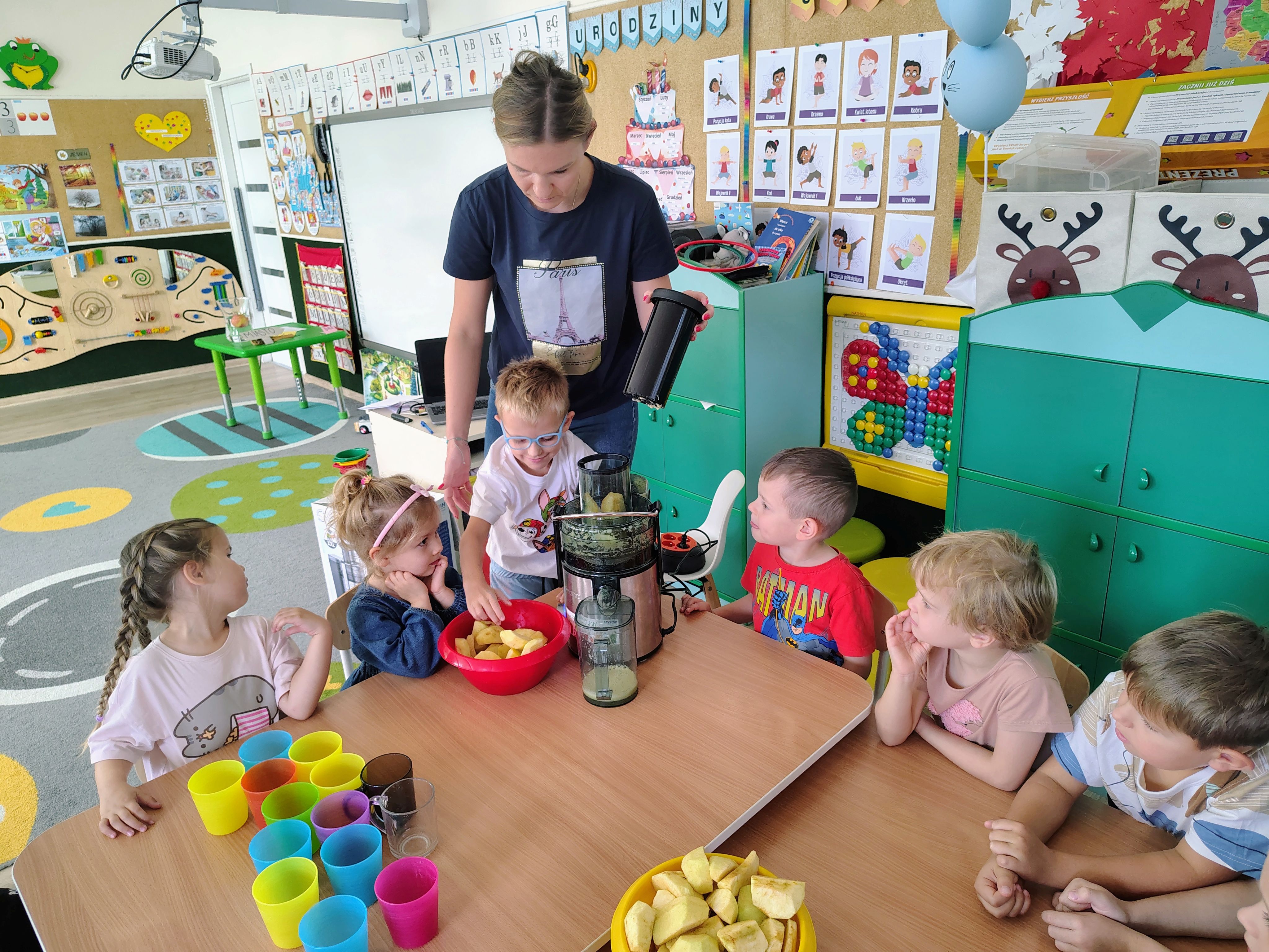 Nasze przedszkole zamieniło się w prawdziwy sad pełen radości i zdrowych smaków. Dzieci wysłuchały znanego wierszyka „Entliczek, pentliczek”, opisywały wygląd i cechy jabłek, a także poznały wiele ciekawostek na ich temat. Nie zabrakło również sportowych emocji – odbyły się zawody zręcznościowe w łapaniu jabłek oraz w wyciskaniu z nich soku. Największą atrakcją było poznanie działania sokowirówki i samodzielne przygotowanie przepysznego, naturalnego soku jabłkowego. Na zakończenie dzieci wykonały twórczą pracę plastyczną – wydzierankę i wyklejankę w kształcie jabłka, która pięknie podsumowała nasze jabłkowe święto. Był to dzień pełen uśmiechu, ruchu i zdrowych smaków – a jabłko stało się prawdziwym bohaterem!