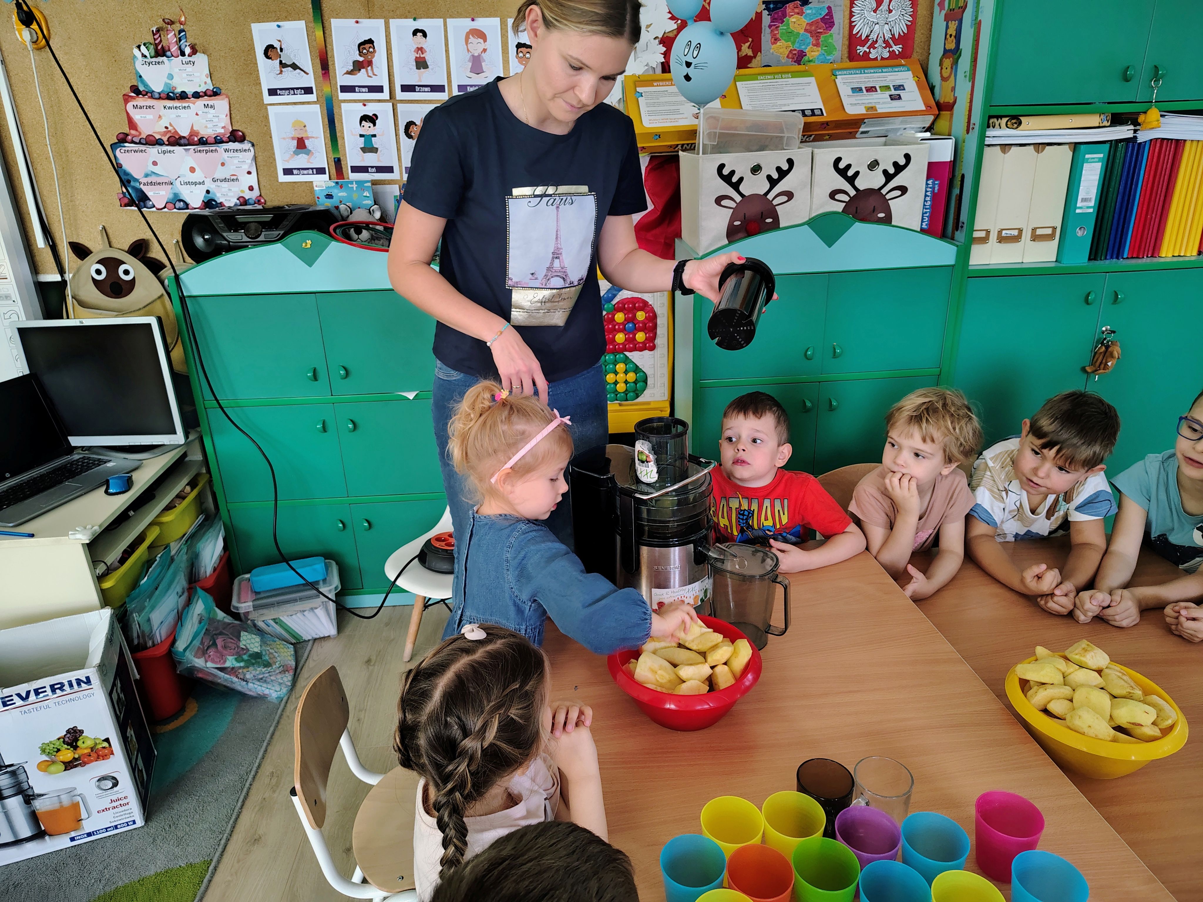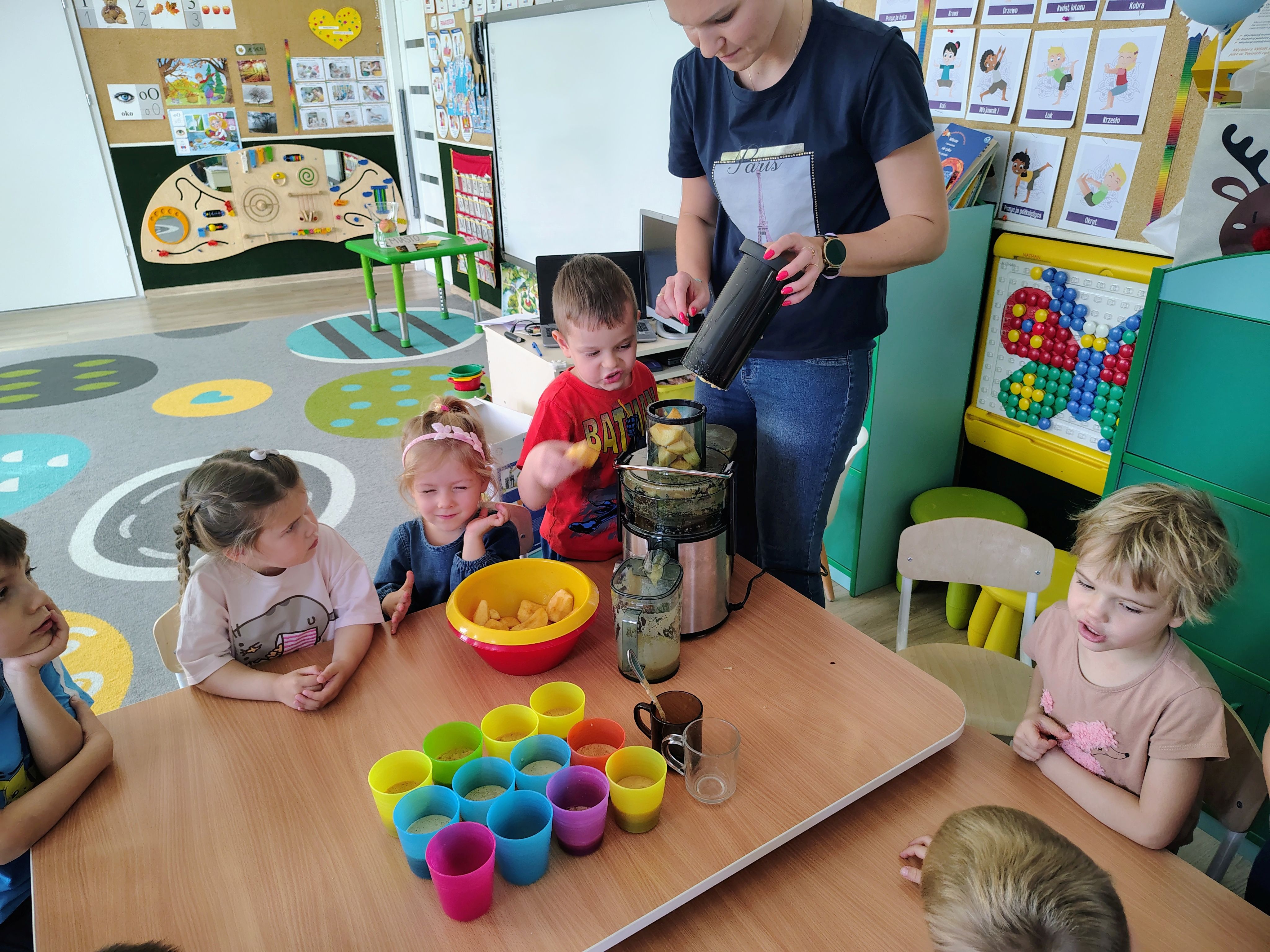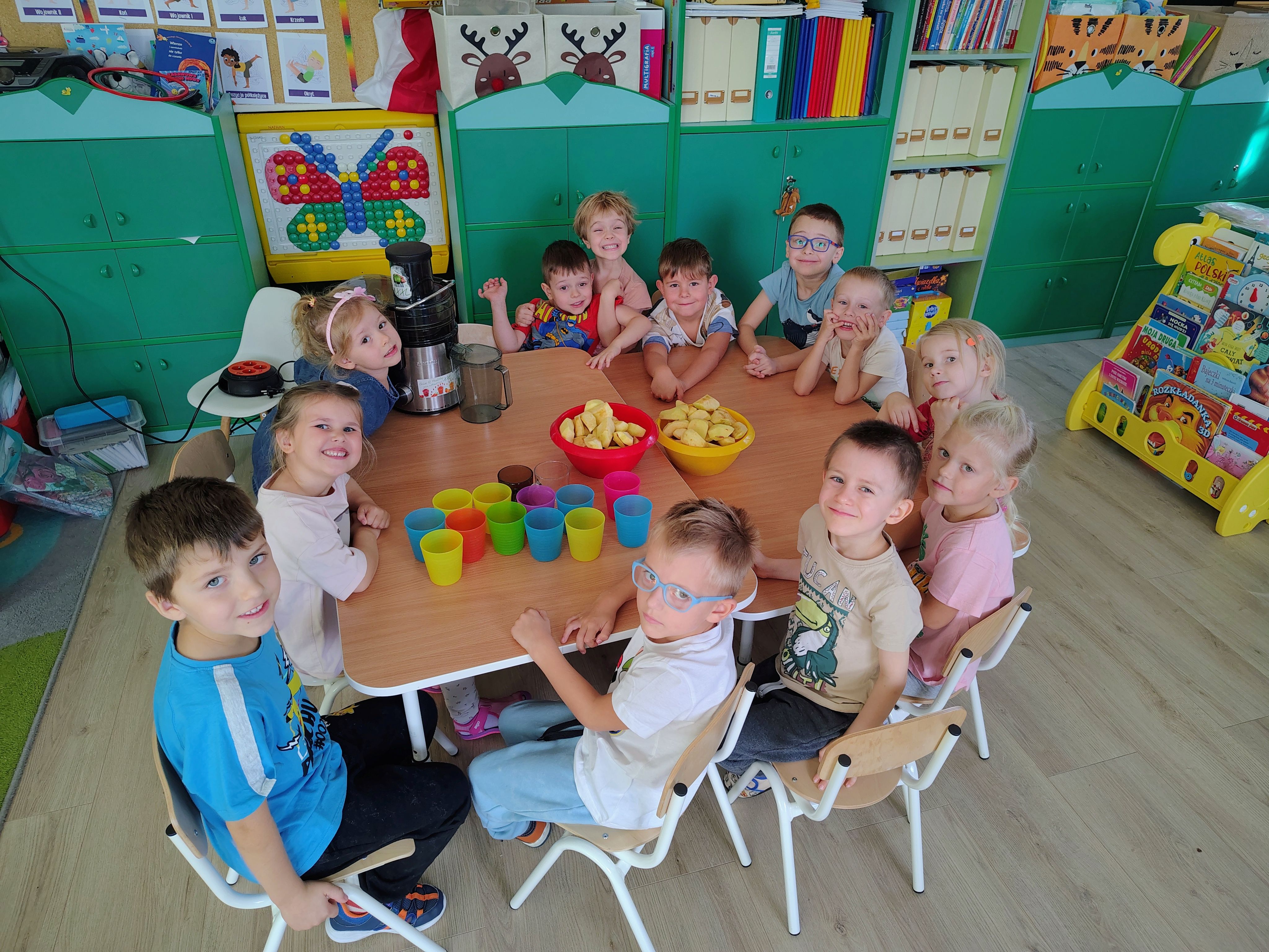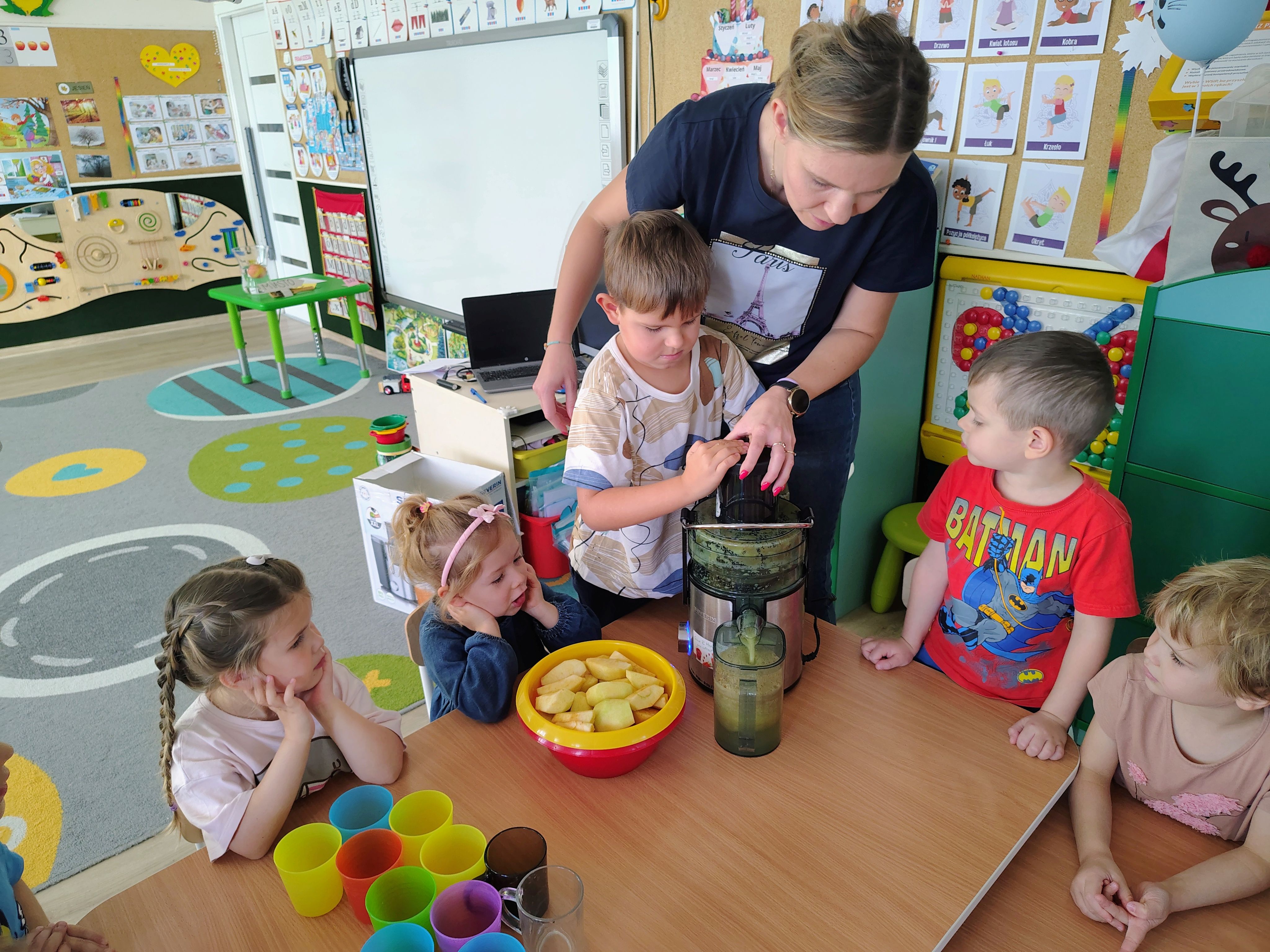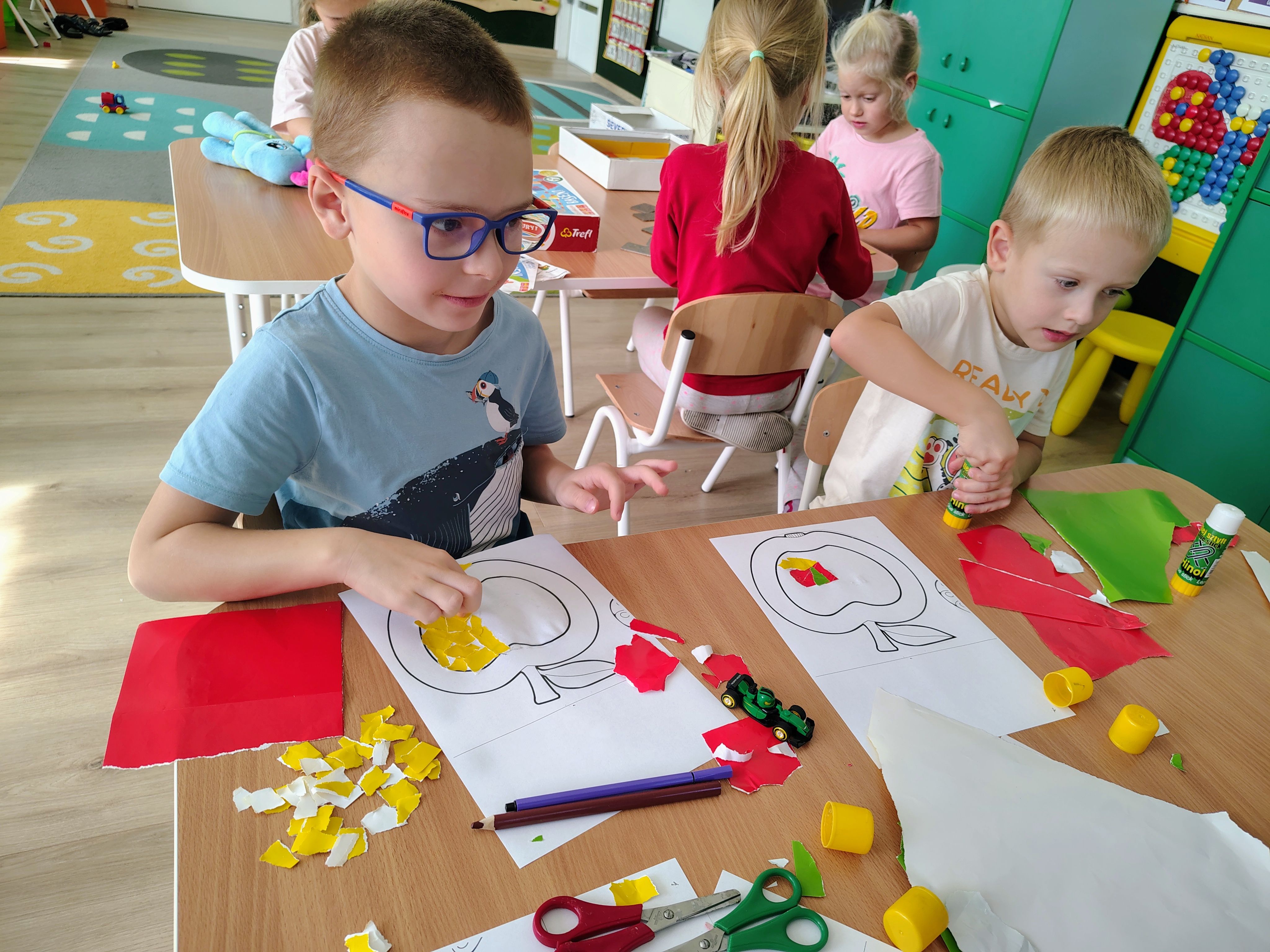 Nasze przedszkole zamieniło się w prawdziwy sad pełen radości i zdrowych smaków. Dzieci wysłuchały znanego wierszyka „Entliczek, pentliczek”, opisywały wygląd i cechy jabłek, a także poznały wiele ciekawostek na ich temat. Nie zabrakło również sportowych emocji – odbyły się zawody zręcznościowe w łapaniu jabłek oraz w wyciskaniu z nich soku. Największą atrakcją było poznanie działania sokowirówki i samodzielne przygotowanie przepysznego, naturalnego soku jabłkowego. Na zakończenie dzieci wykonały twórczą pracę plastyczną – wydzierankę i wyklejankę w kształcie jabłka, która pięknie podsumowała nasze jabłkowe święto. Był to dzień pełen uśmiechu, ruchu i zdrowych smaków – a jabłko stało się prawdziwym bohaterem!