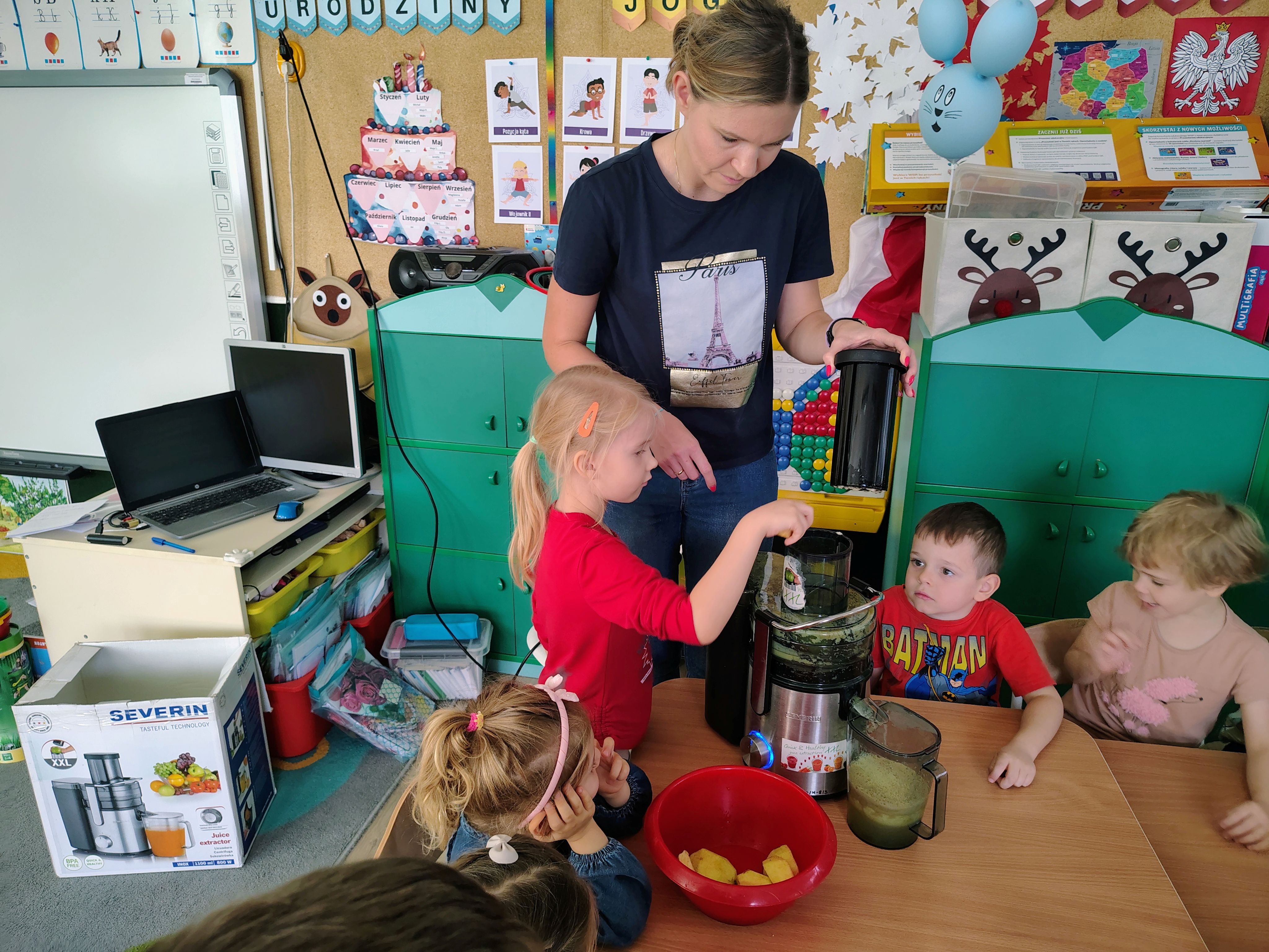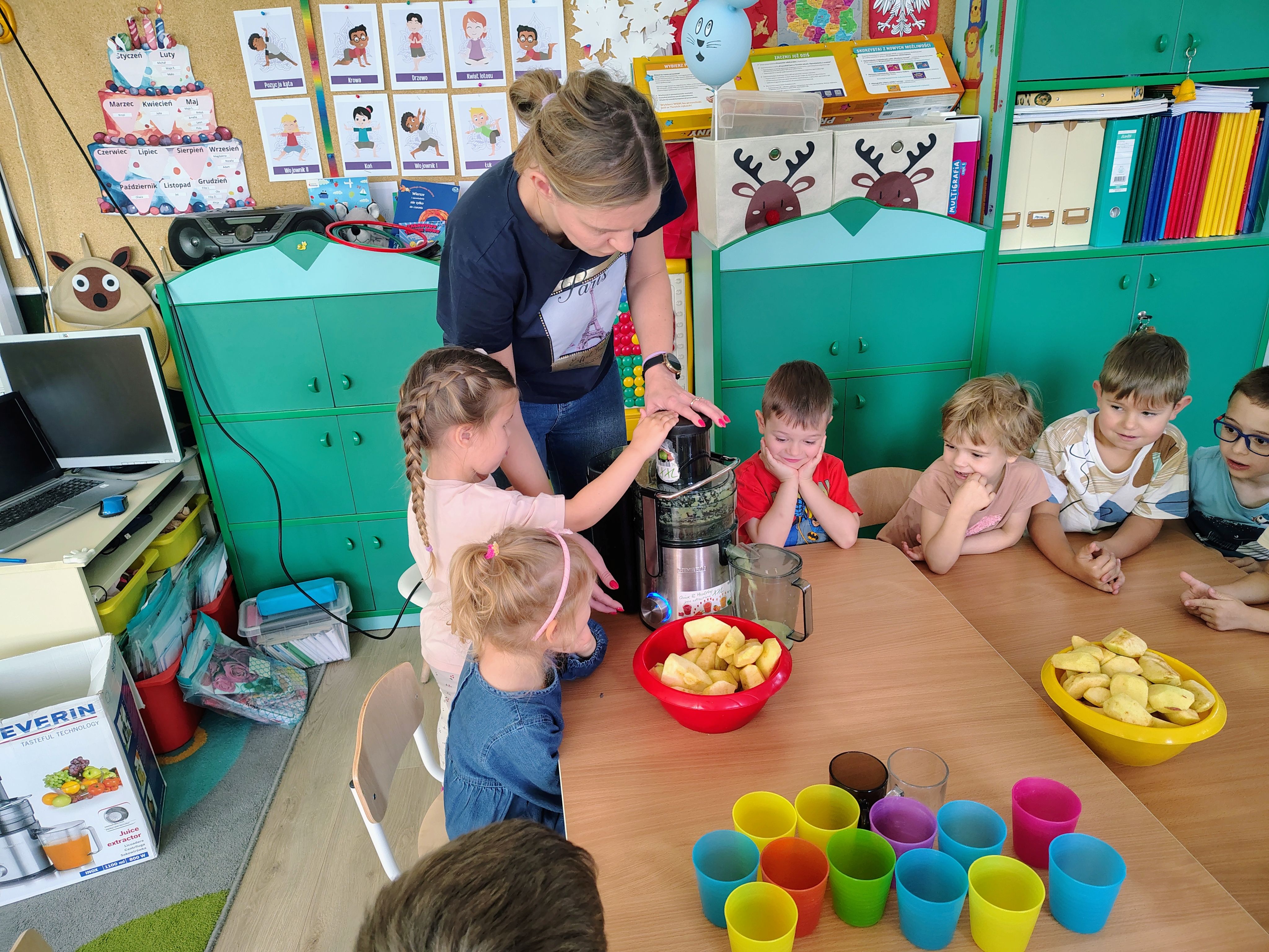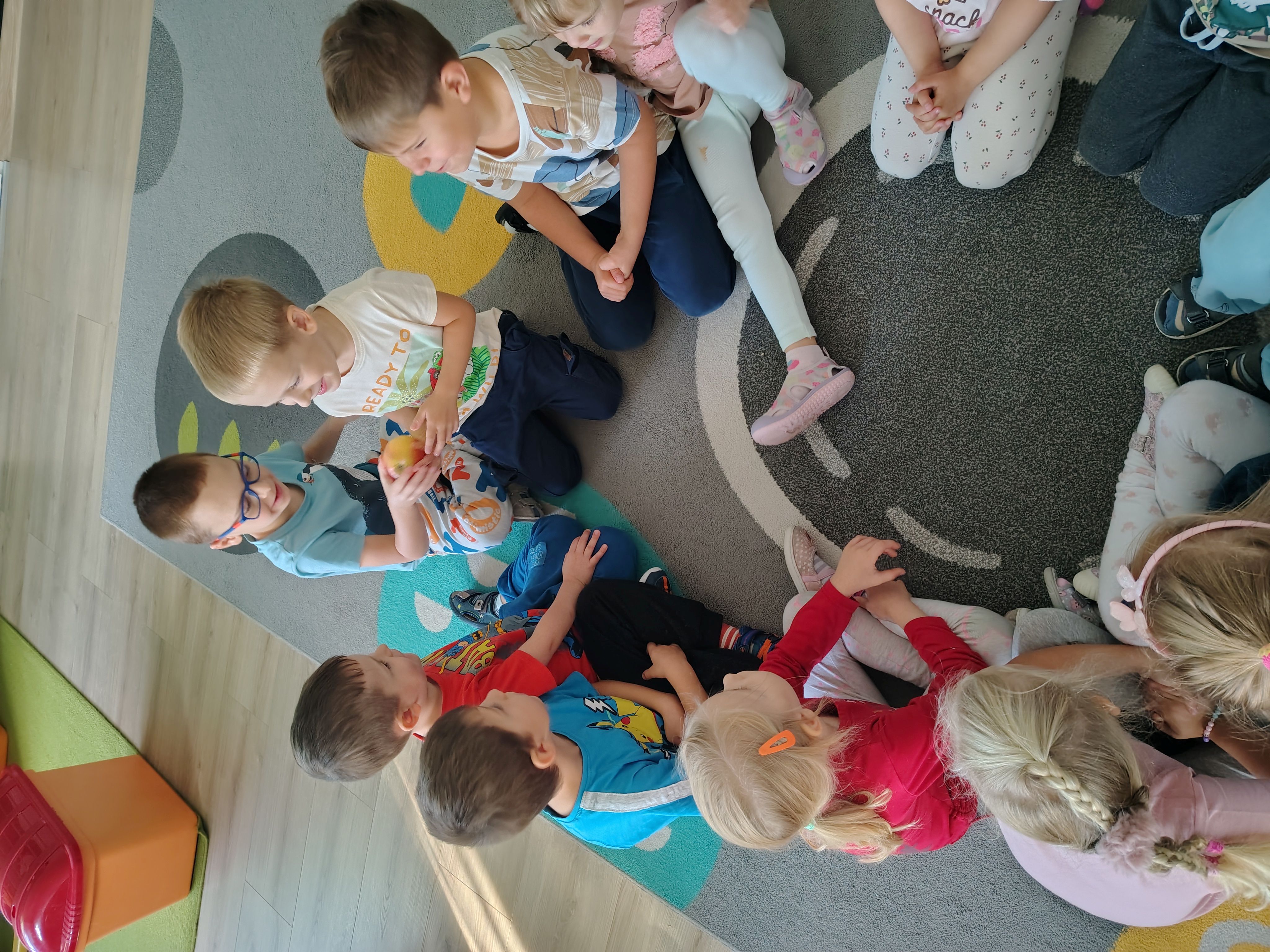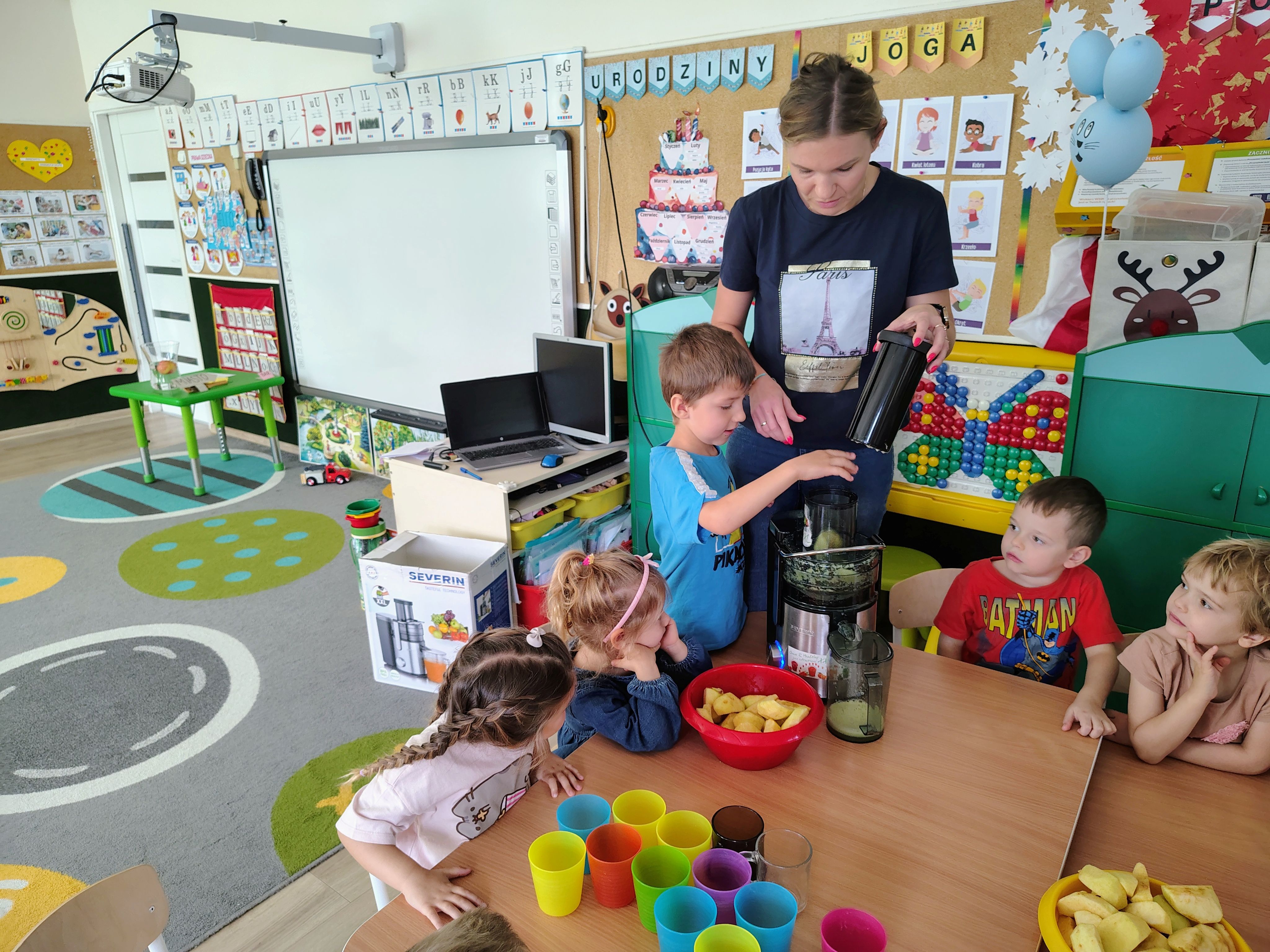 Nasze przedszkole zamieniło się w prawdziwy sad pełen radości i zdrowych smaków. Dzieci wysłuchały znanego wierszyka „Entliczek, pentliczek”, opisywały wygląd i cechy jabłek, a także poznały wiele ciekawostek na ich temat. Nie zabrakło również sportowych emocji – odbyły się zawody zręcznościowe w łapaniu jabłek oraz w wyciskaniu z nich soku. Największą atrakcją było poznanie działania sokowirówki i samodzielne przygotowanie przepysznego, naturalnego soku jabłkowego. Na zakończenie dzieci wykonały twórczą pracę plastyczną – wydzierankę i wyklejankę w kształcie jabłka, która pięknie podsumowała nasze jabłkowe święto. Był to dzień pełen uśmiechu, ruchu i zdrowych smaków – a jabłko stało się prawdziwym bohaterem!
