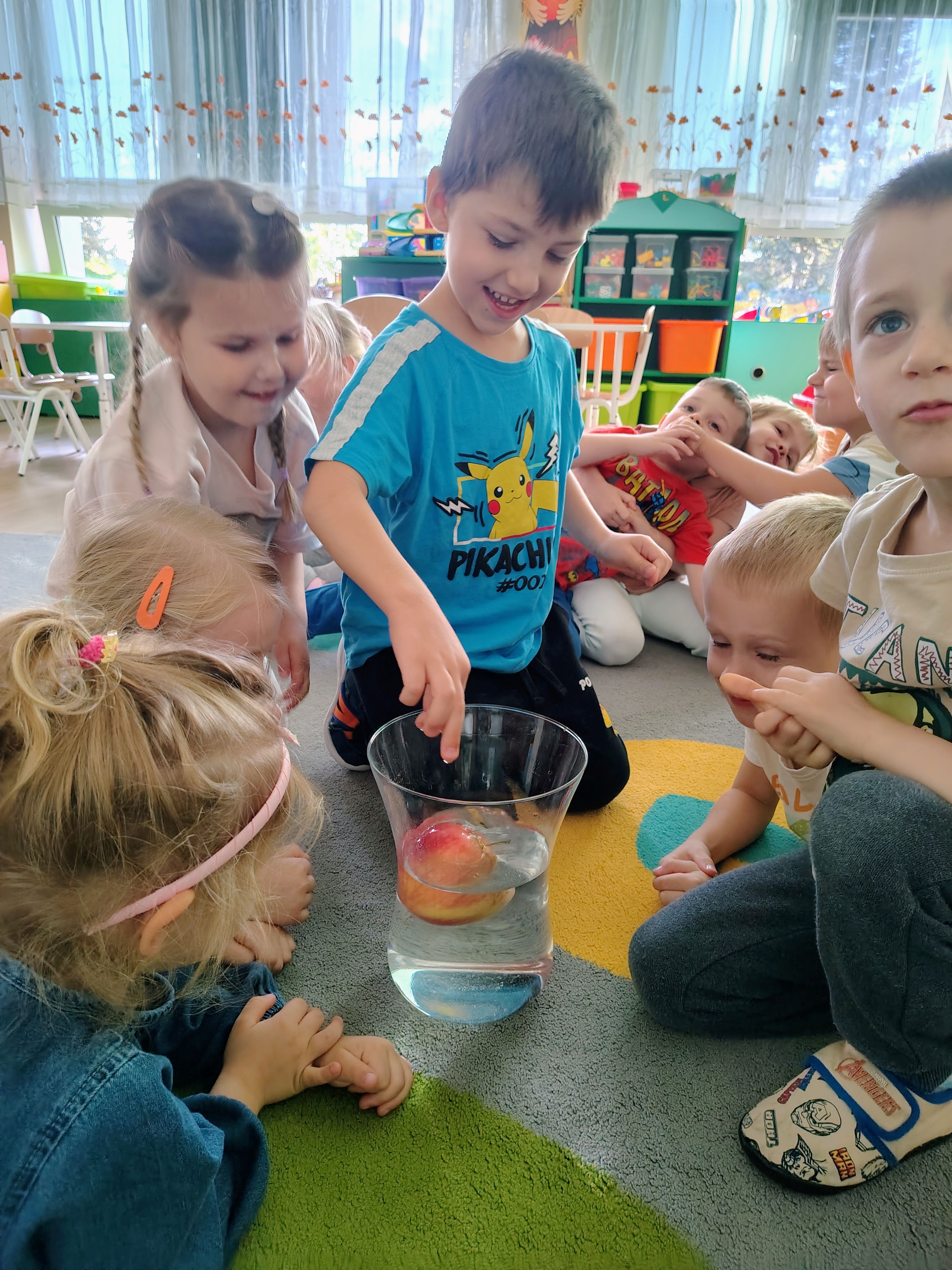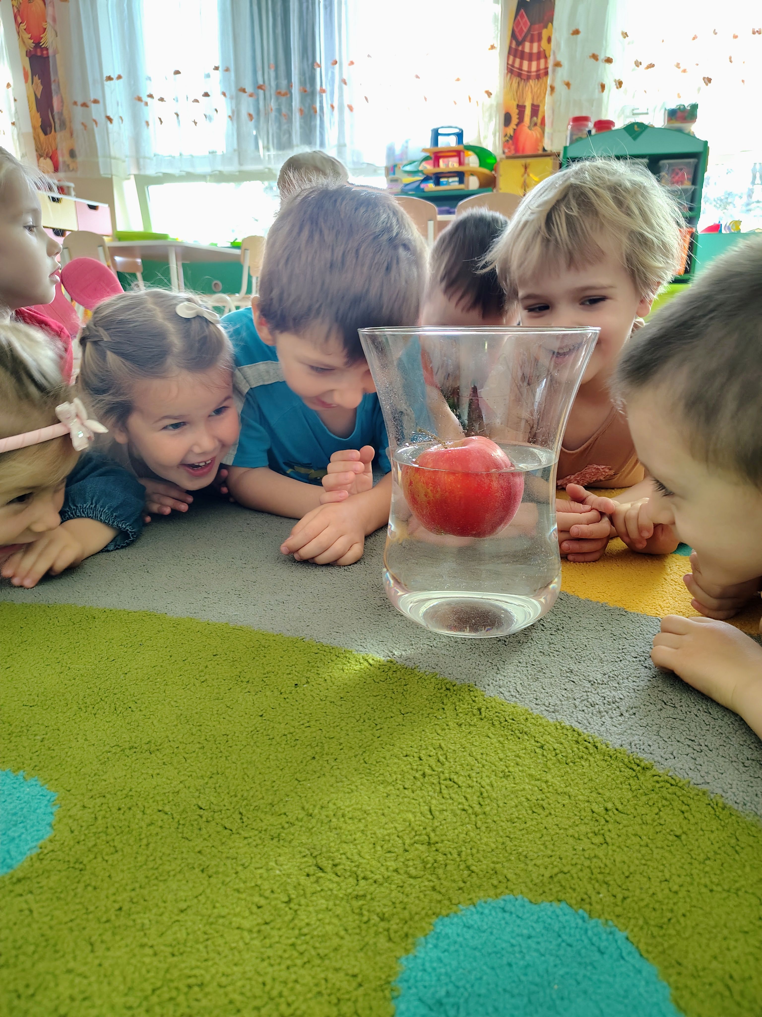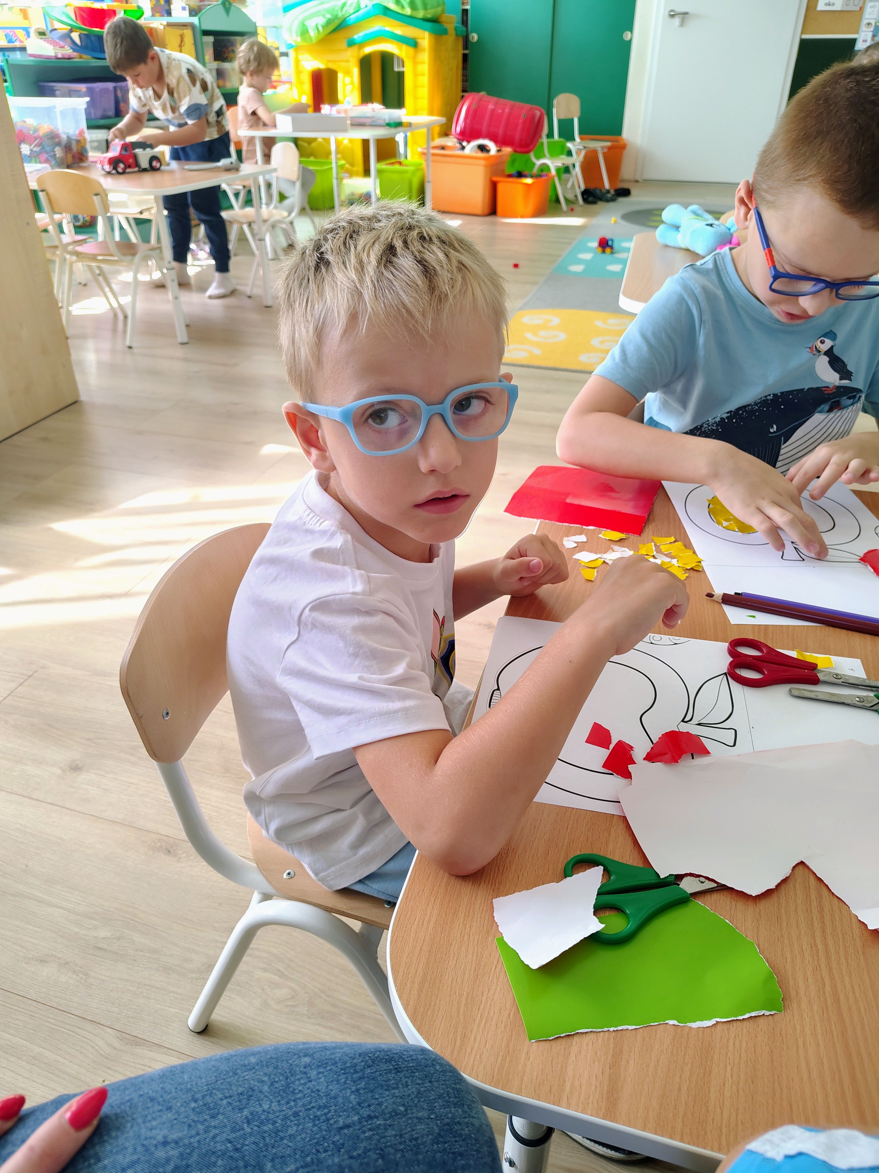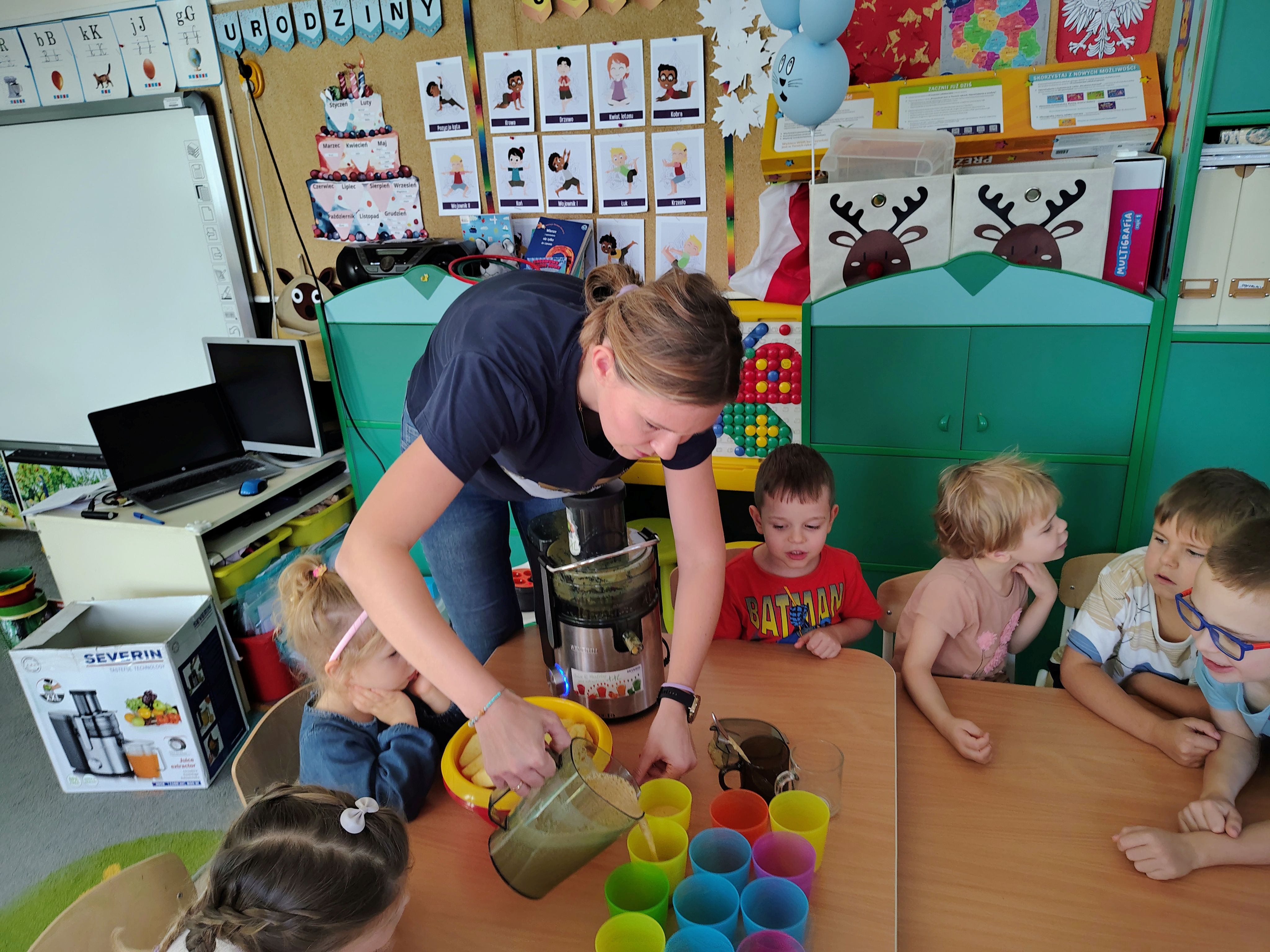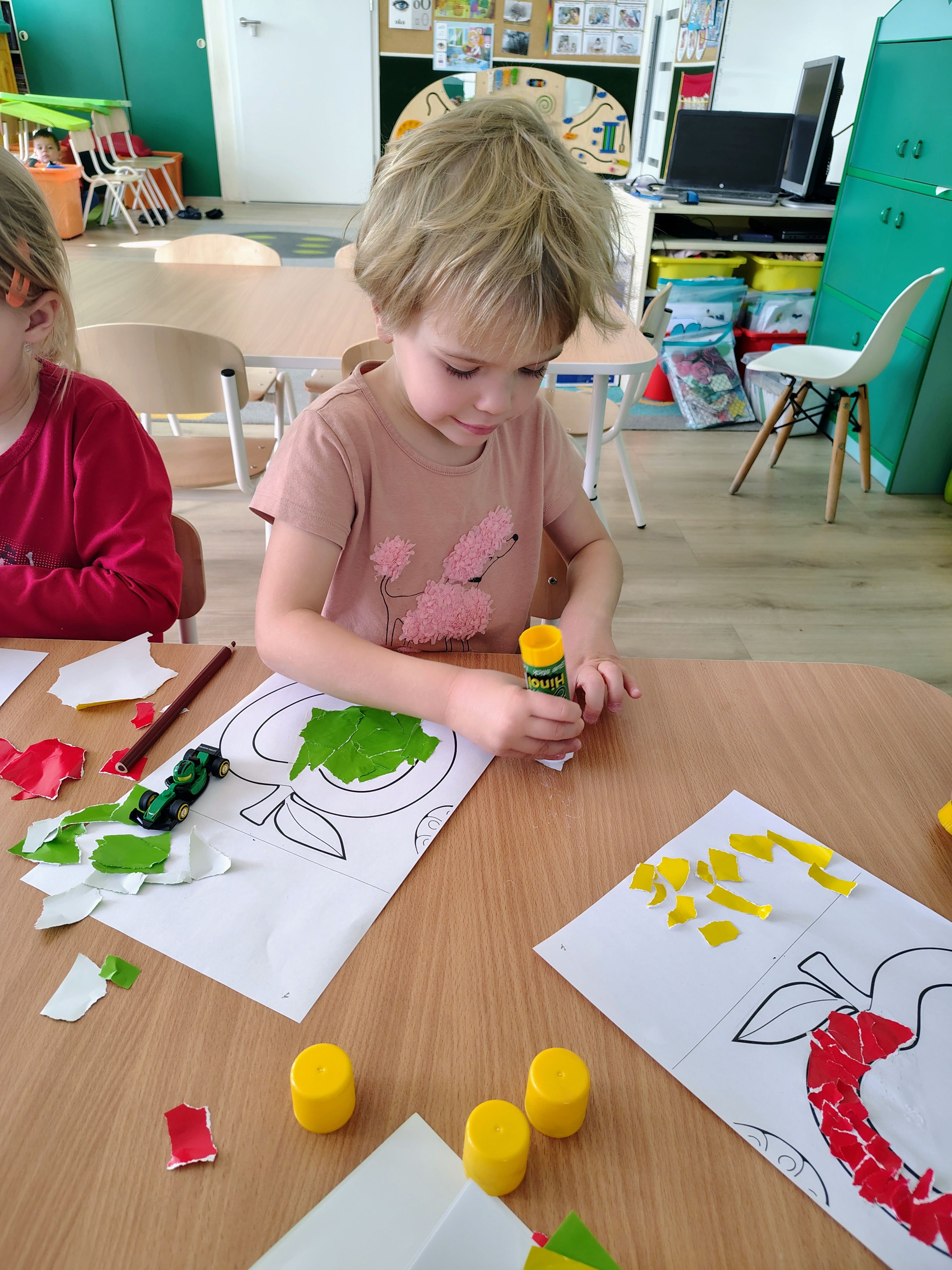 Nasze przedszkole zamieniło się w prawdziwy sad pełen radości i zdrowych smaków. Dzieci wysłuchały znanego wierszyka „Entliczek, pentliczek”, opisywały wygląd i cechy jabłek, a także poznały wiele ciekawostek na ich temat. Nie zabrakło również sportowych emocji – odbyły się zawody zręcznościowe w łapaniu jabłek oraz w wyciskaniu z nich soku. Największą atrakcją było poznanie działania sokowirówki i samodzielne przygotowanie przepysznego, naturalnego soku jabłkowego. Na zakończenie dzieci wykonały twórczą pracę plastyczną – wydzierankę i wyklejankę w kształcie jabłka, która pięknie podsumowała nasze jabłkowe święto. Był to dzień pełen uśmiechu, ruchu i zdrowych smaków – a jabłko stało się prawdziwym bohaterem!