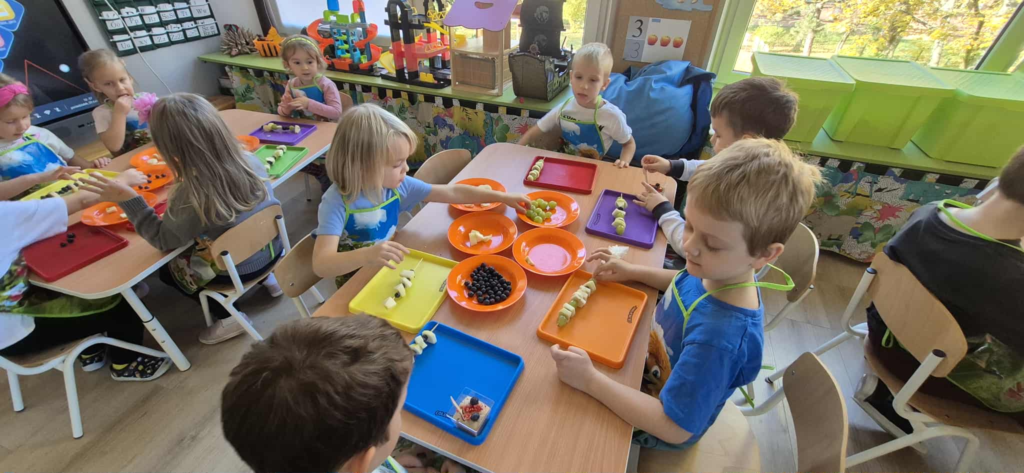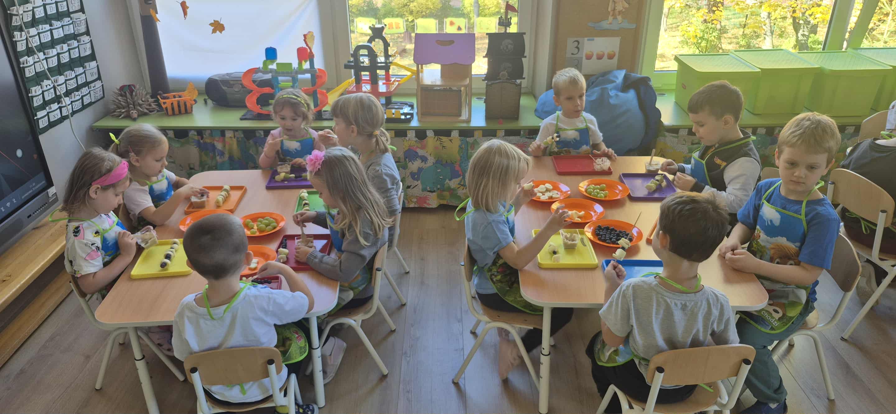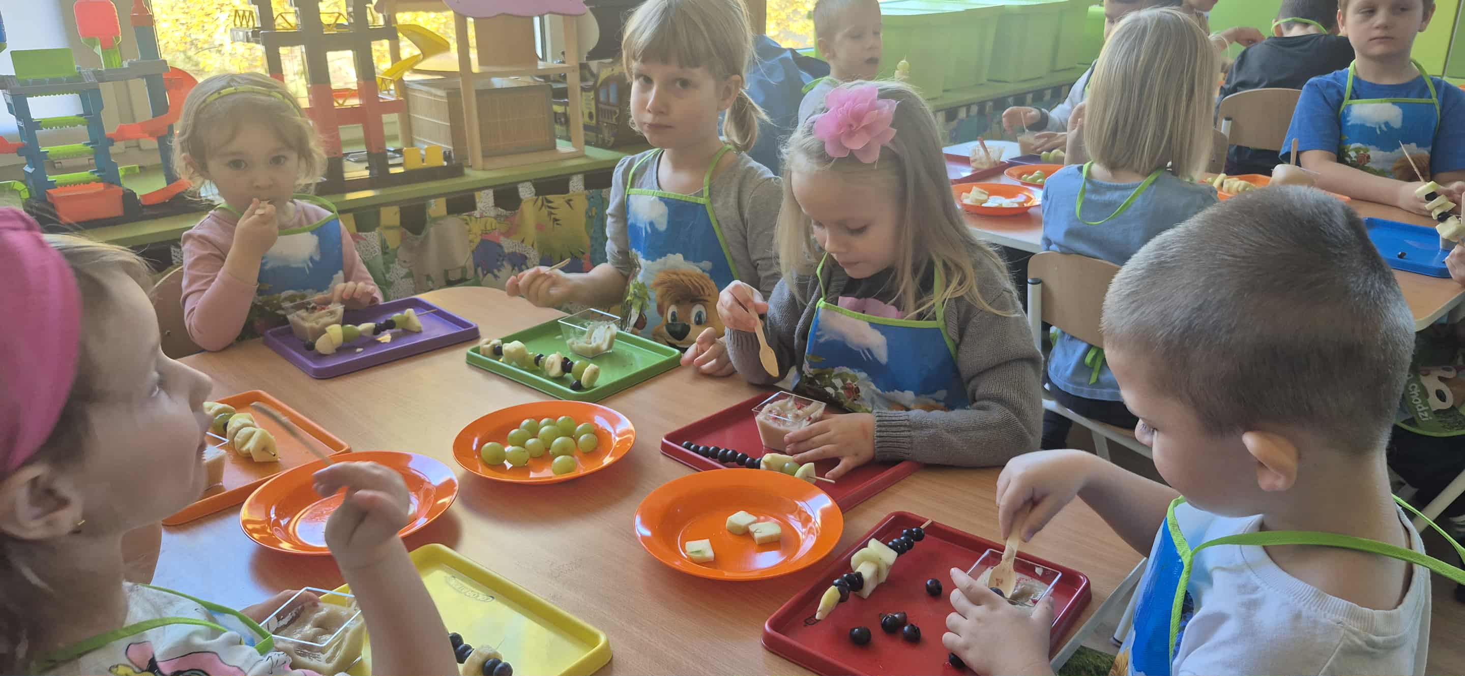 Przedszkolaki z grupy 5 w ramach innowacji pedagogicznej pt. "Nietypowe święta w przedszkolu" obchodziły "Dzień Warzyw i Owoców". Dzieci rozpoznawały owoce i warzywa, segregowały je na poszczególne grupy, grały w warzywne bingo, dyskutowały o tym, że owoce i warzywa są bardzo zdrowe i należy je jeść codziennie. Wykonały także samodzielnie owocowe szaszłyki oraz zajadały się pysznym musem owocowym przygotowanym przez Panie nauczycielki.