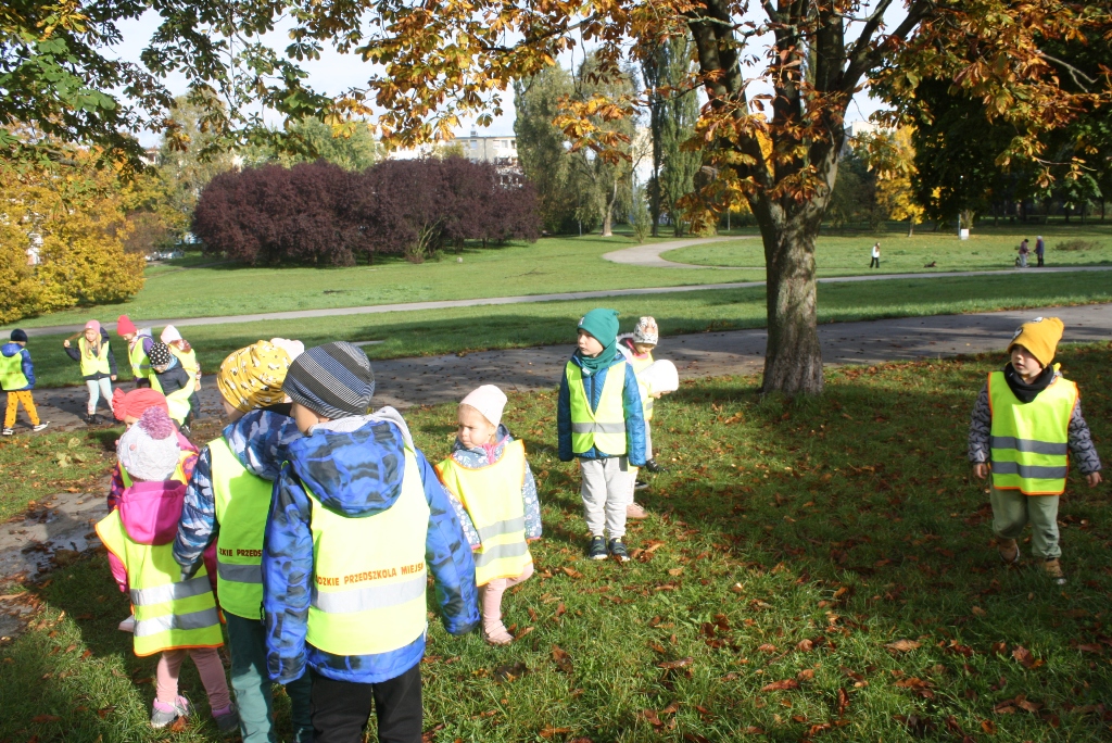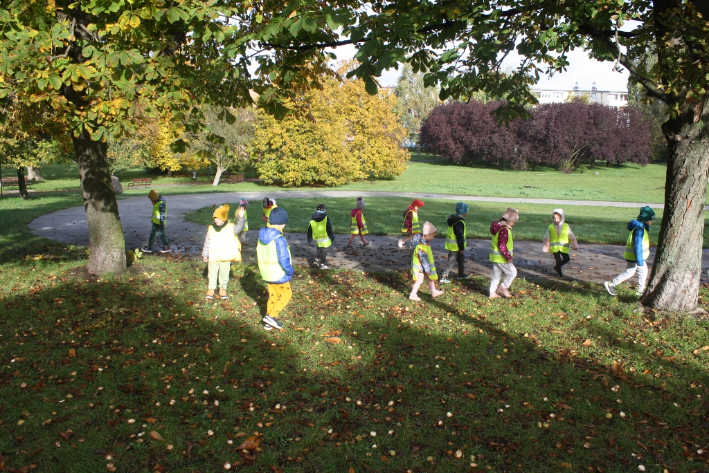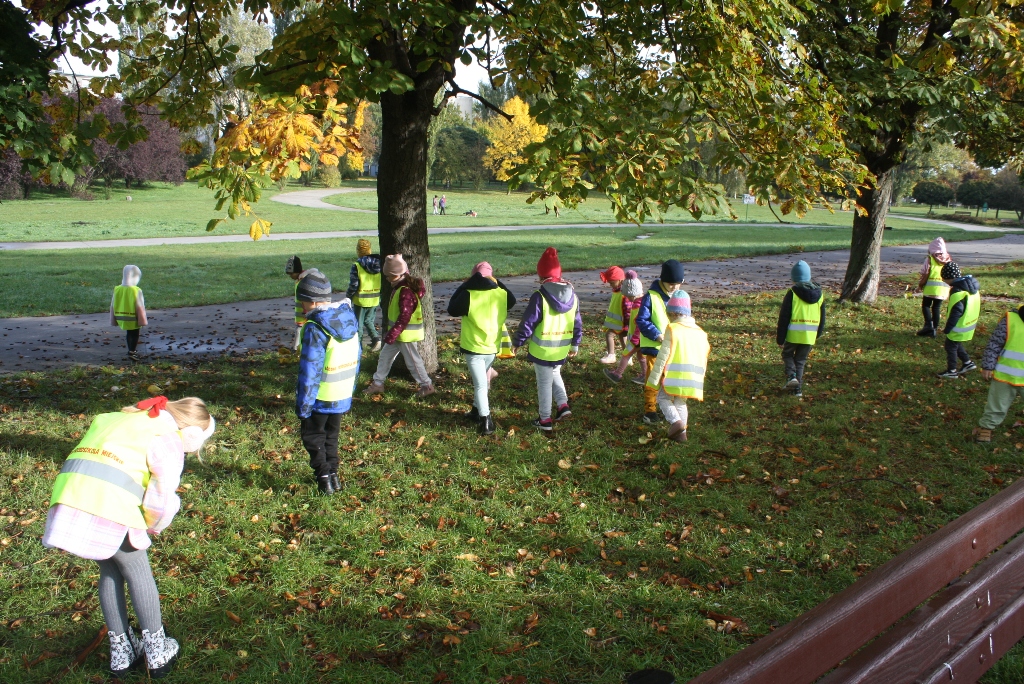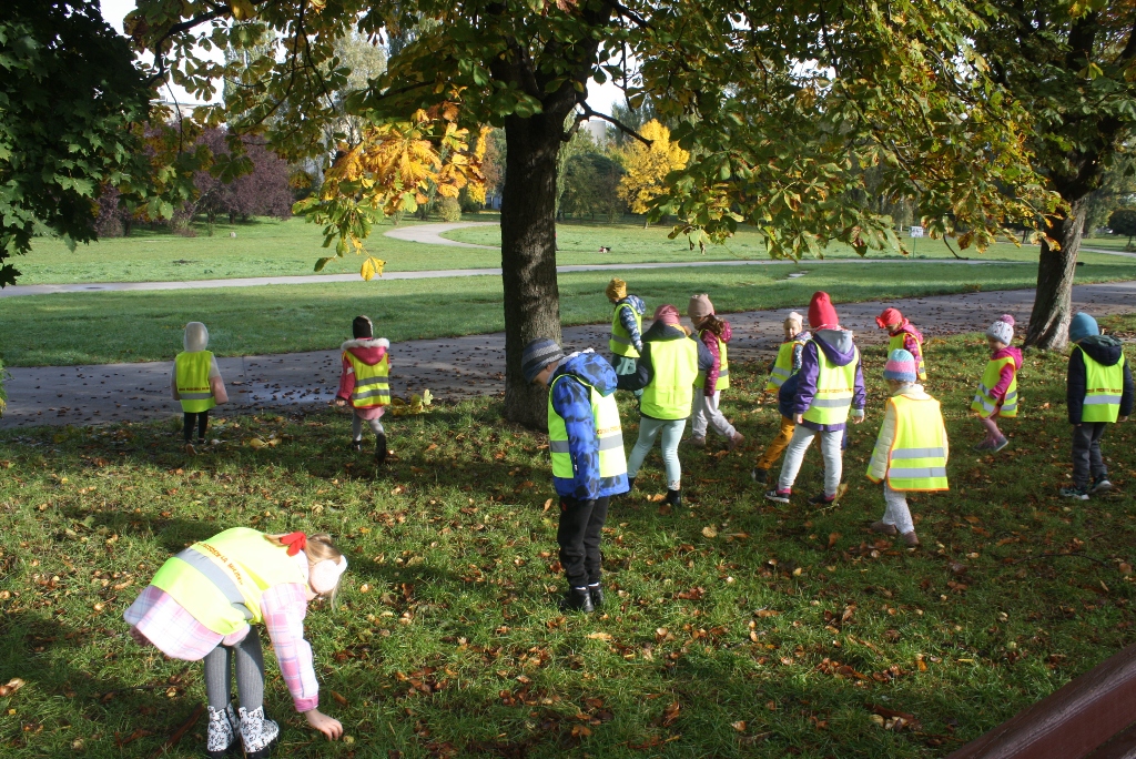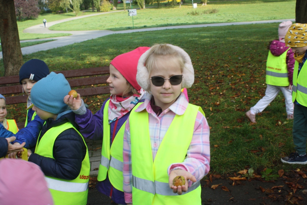 Piękne promienie słońca przebijające się od rana przez nieliczne chmurki zachęciły nas do wyjścia do pobliskiego Parku Podolskiego. Dzieci poznawały nazwy drzew, rozpoznawały ich owoce oraz kształt liści. Wszyscy zbieraliśmy dary jakie oferuje nam jesień: kolorowe liście, żołędzie, kasztany oraz orzeszki. Spotkaliśmy także stałe mieszkanki, wiewiórki, które dostały od nas drugie śniadanie w postaci pysznych orzeszków laskowych.