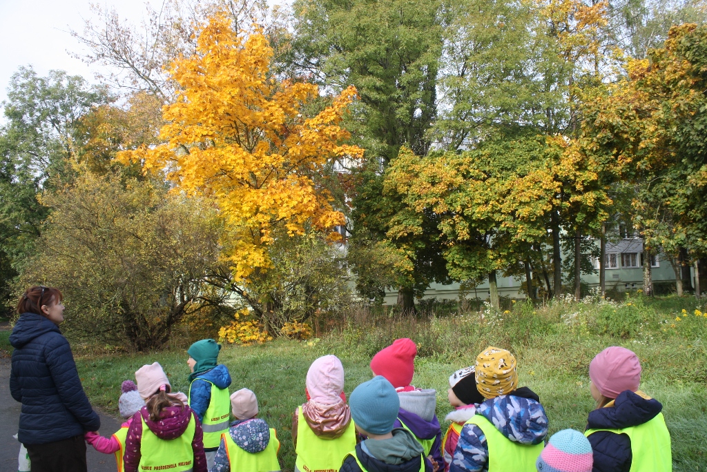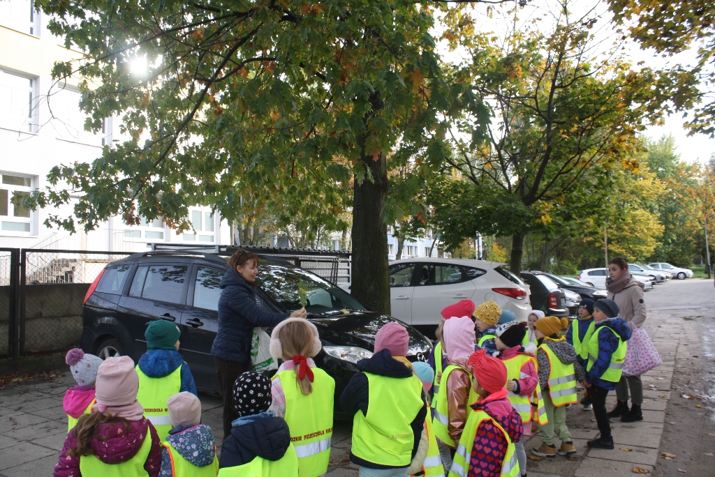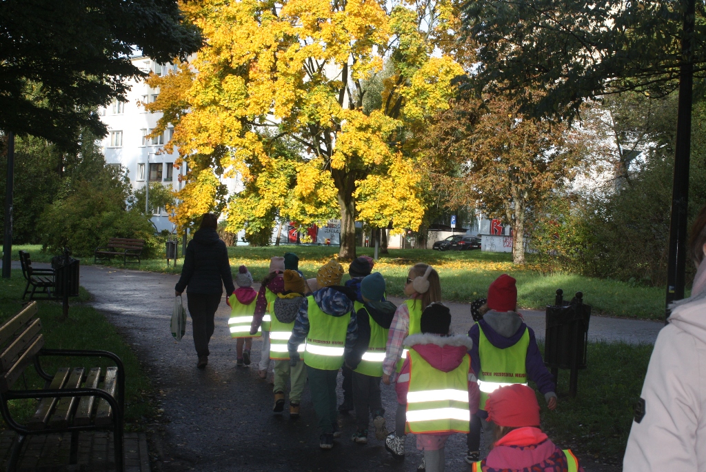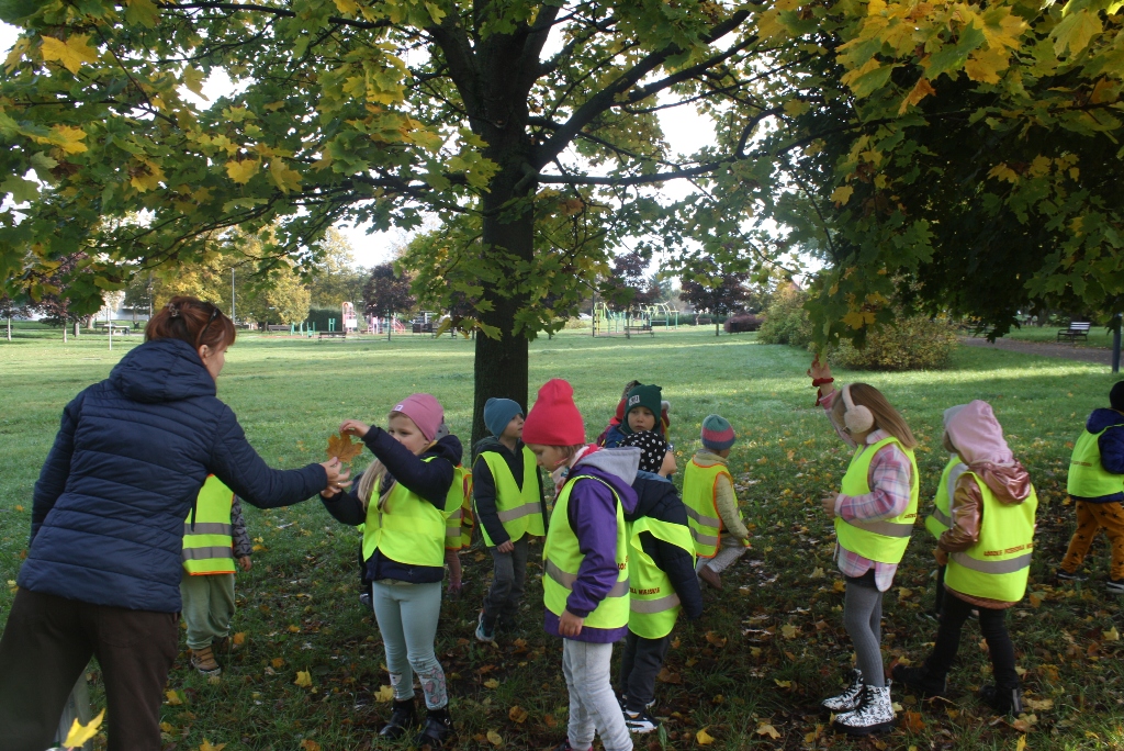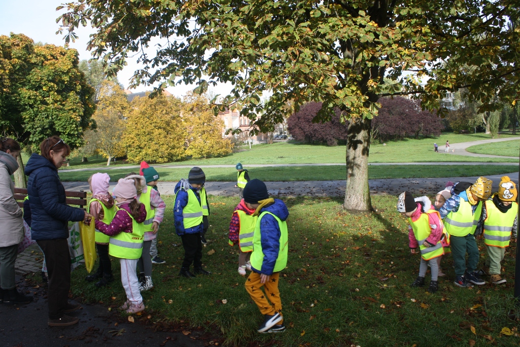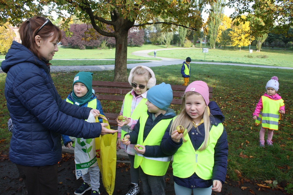 Piękne promienie słońca przebijające się od rana przez nieliczne chmurki zachęciły nas do wyjścia do pobliskiego Parku Podolskiego. Dzieci poznawały nazwy drzew, rozpoznawały ich owoce oraz kształt liści. Wszyscy zbieraliśmy dary jakie oferuje nam jesień: kolorowe liście, żołędzie, kasztany oraz orzeszki. Spotkaliśmy także stałe mieszkanki, wiewiórki, które dostały od nas drugie śniadanie w postaci pysznych orzeszków laskowych.