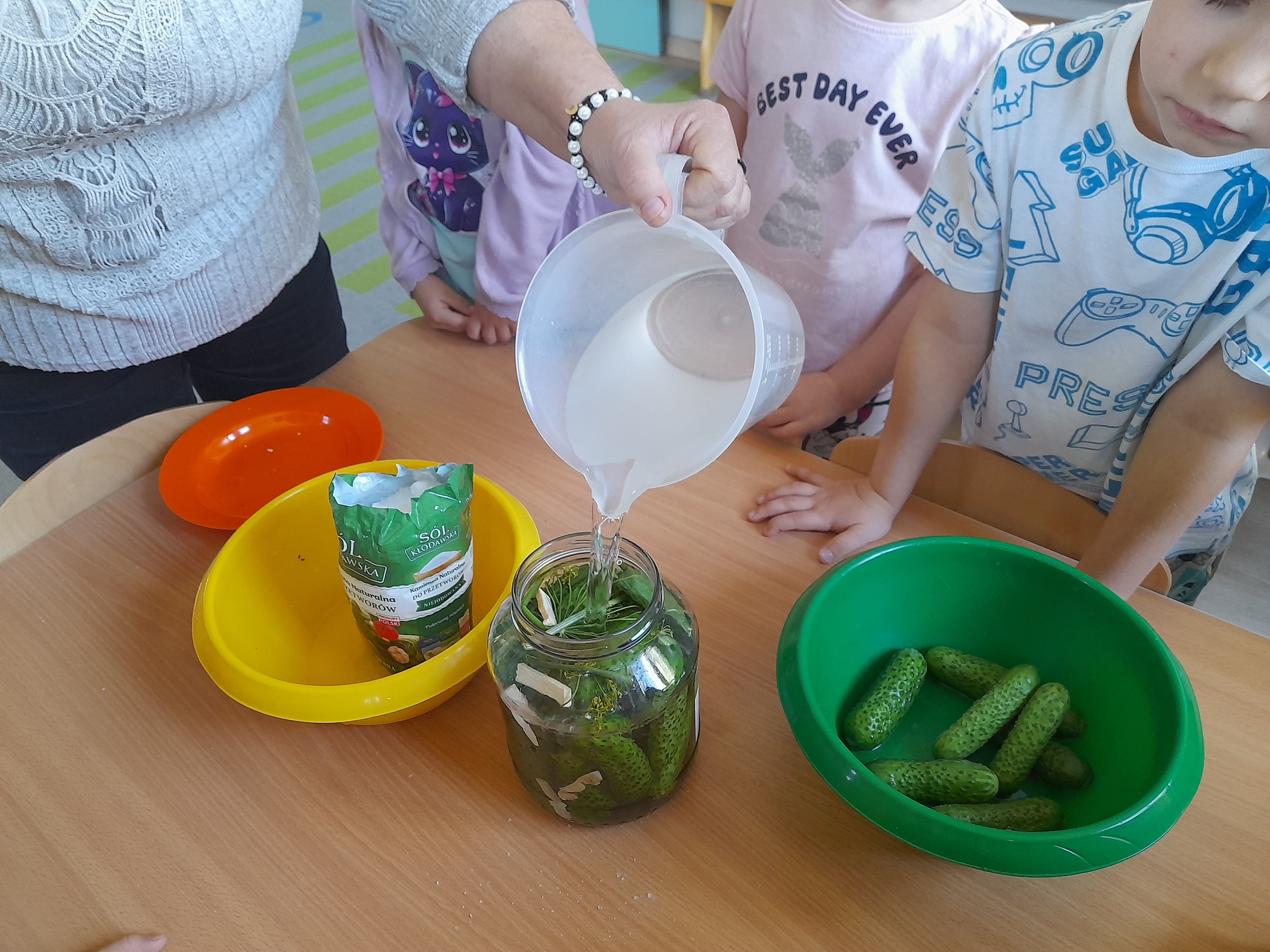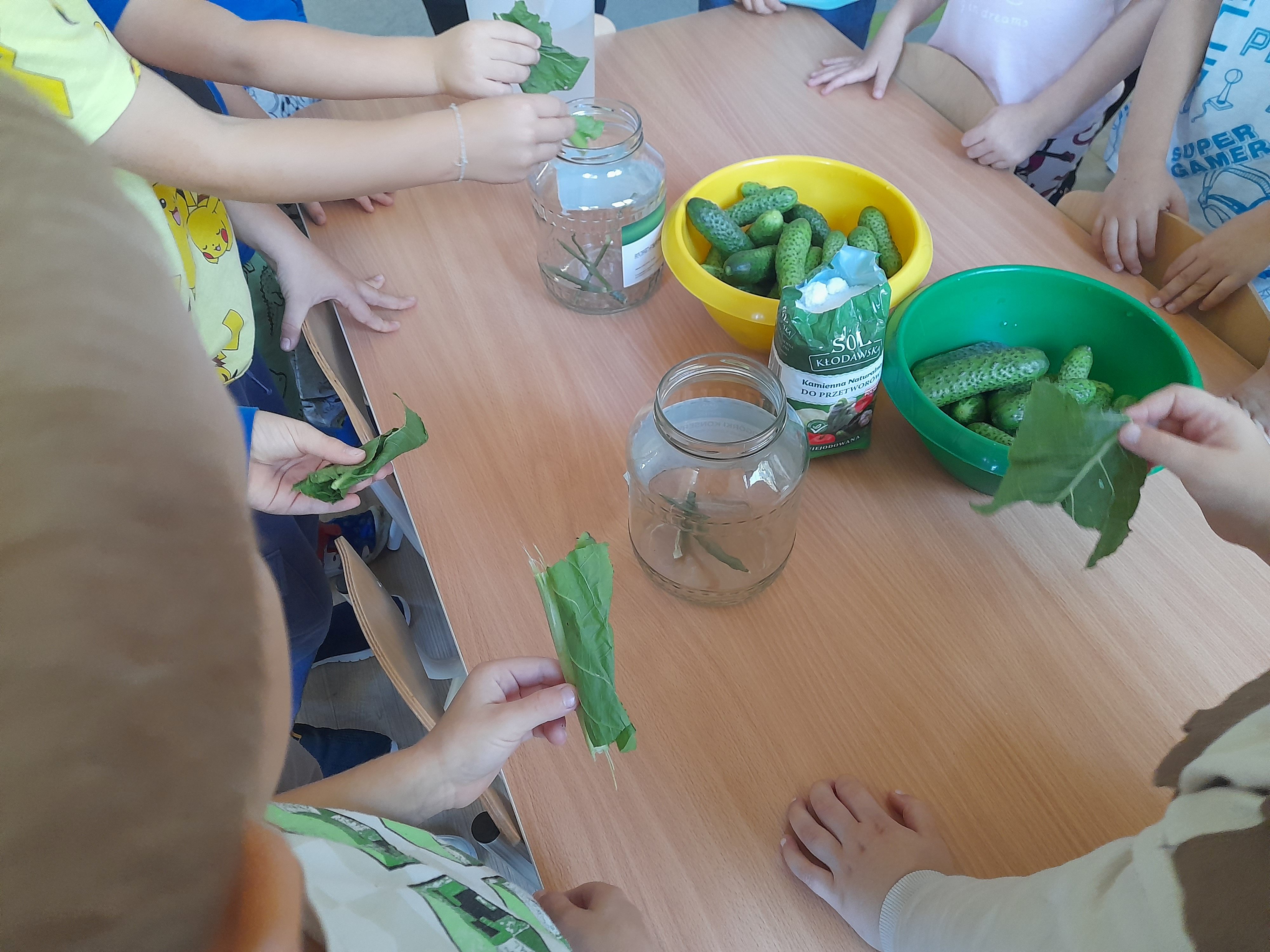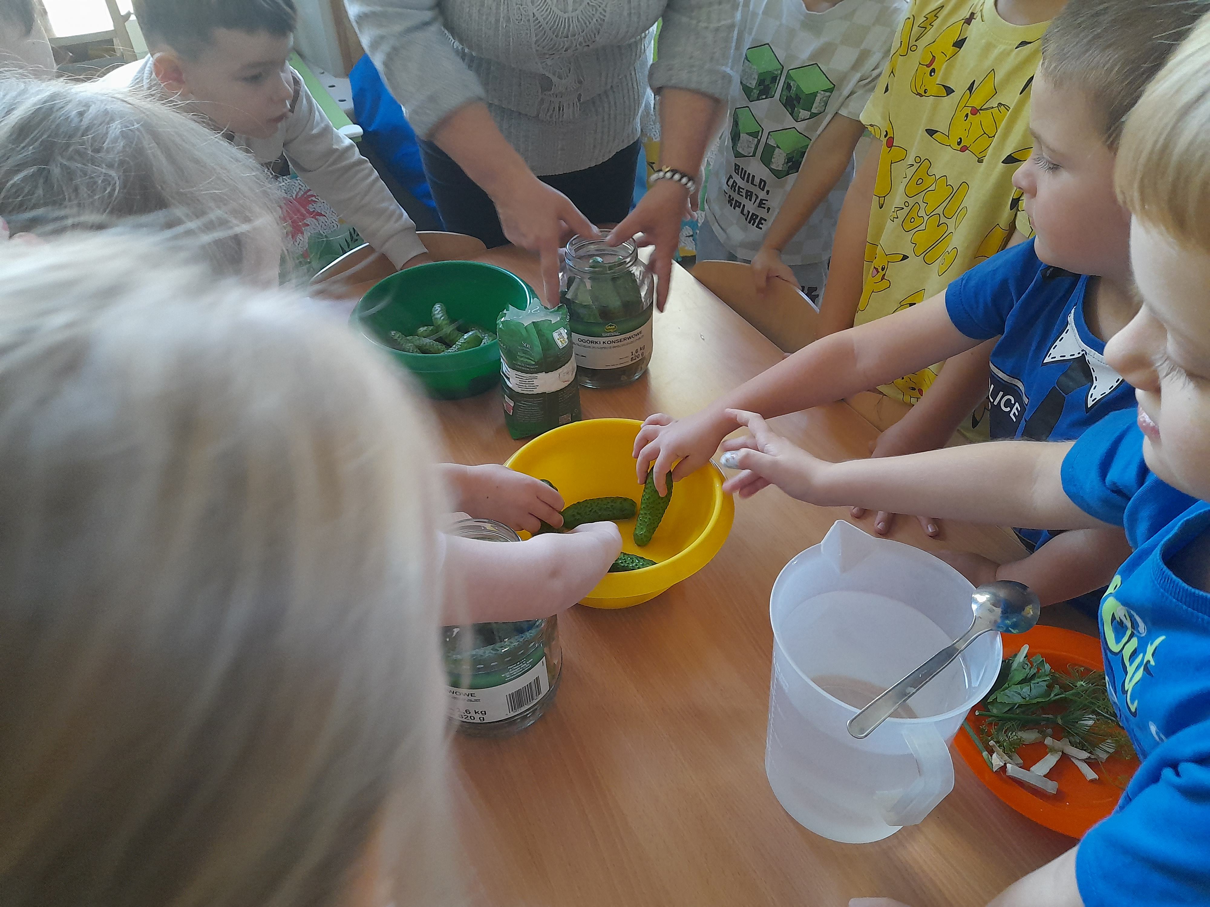 Przedszkolaki z grupy 5 ukisiły swoje ogórki. Dzieci wkładały ogórki do słoików oraz dodawały wszystkie potrzebne składniki. Zadanie to sprawiło im mnóstwo radości oraz satysfakcji.