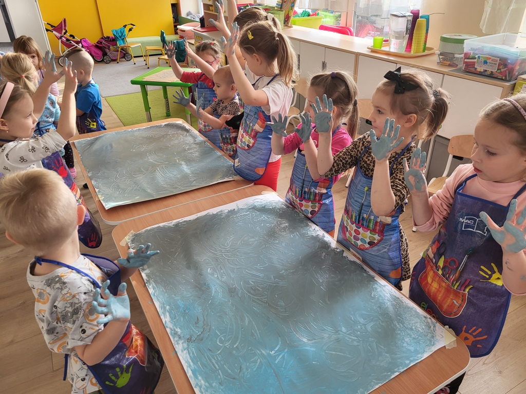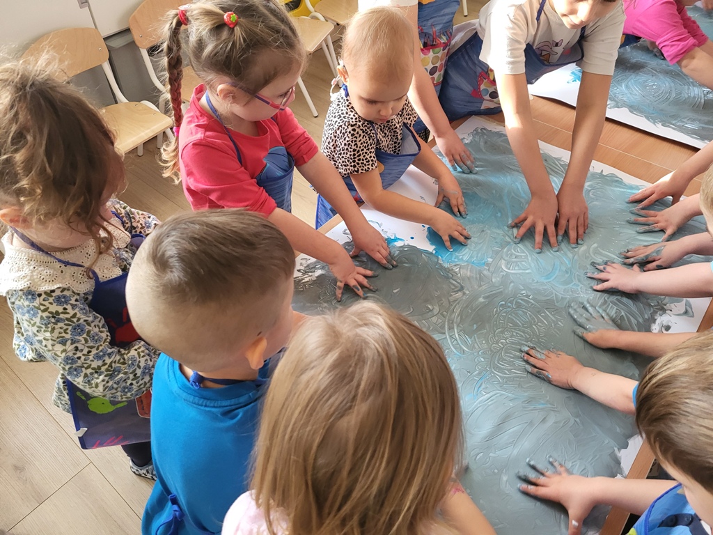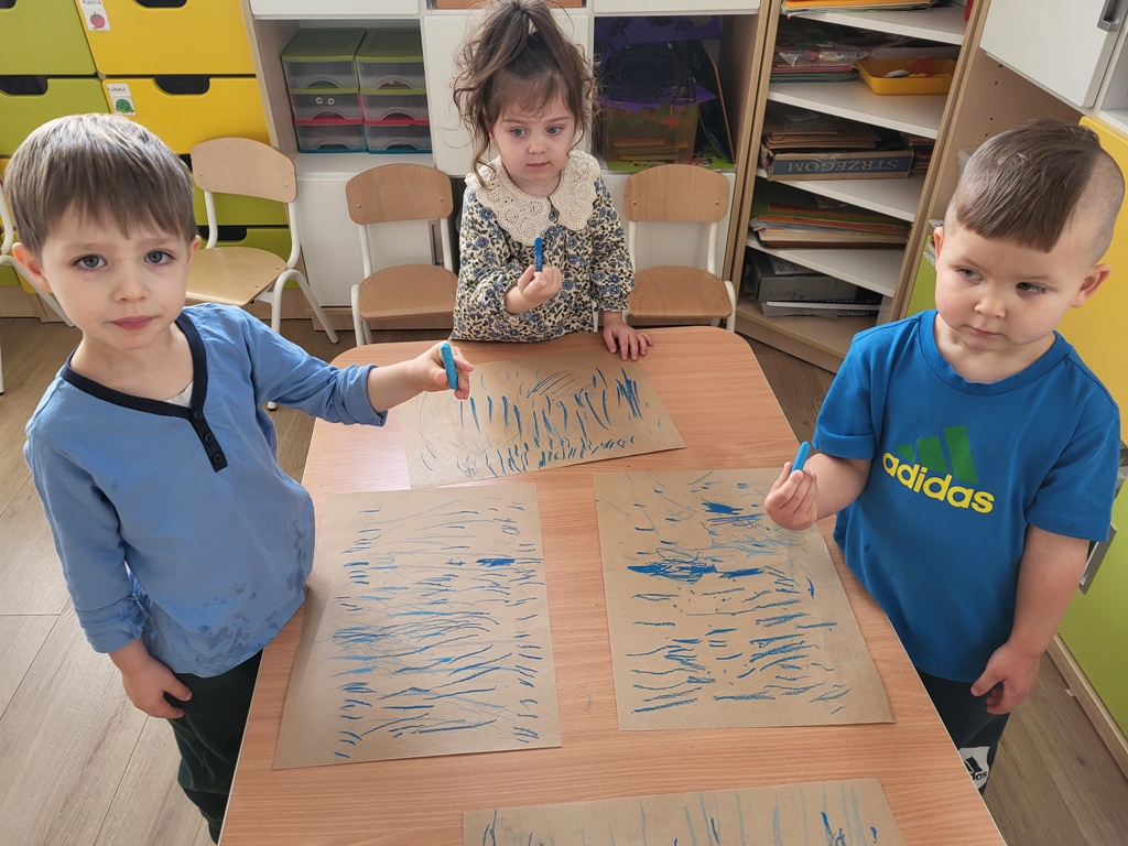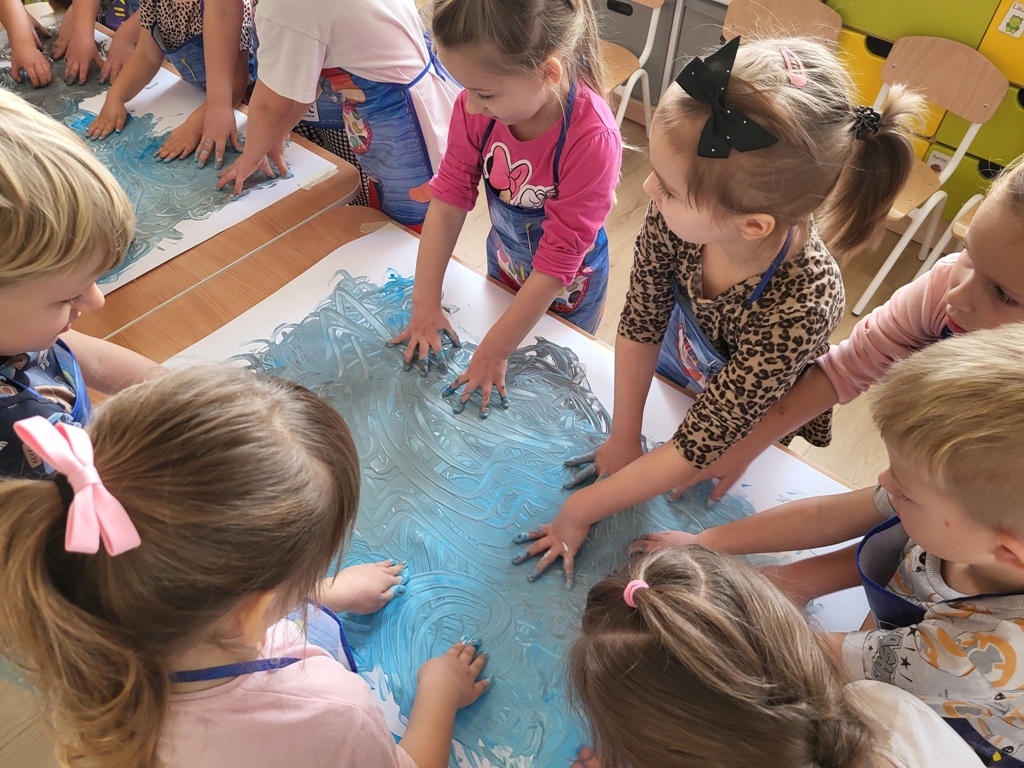 Nasze dłonie, kredki i farby wyczarowują obraz do muzyki.
