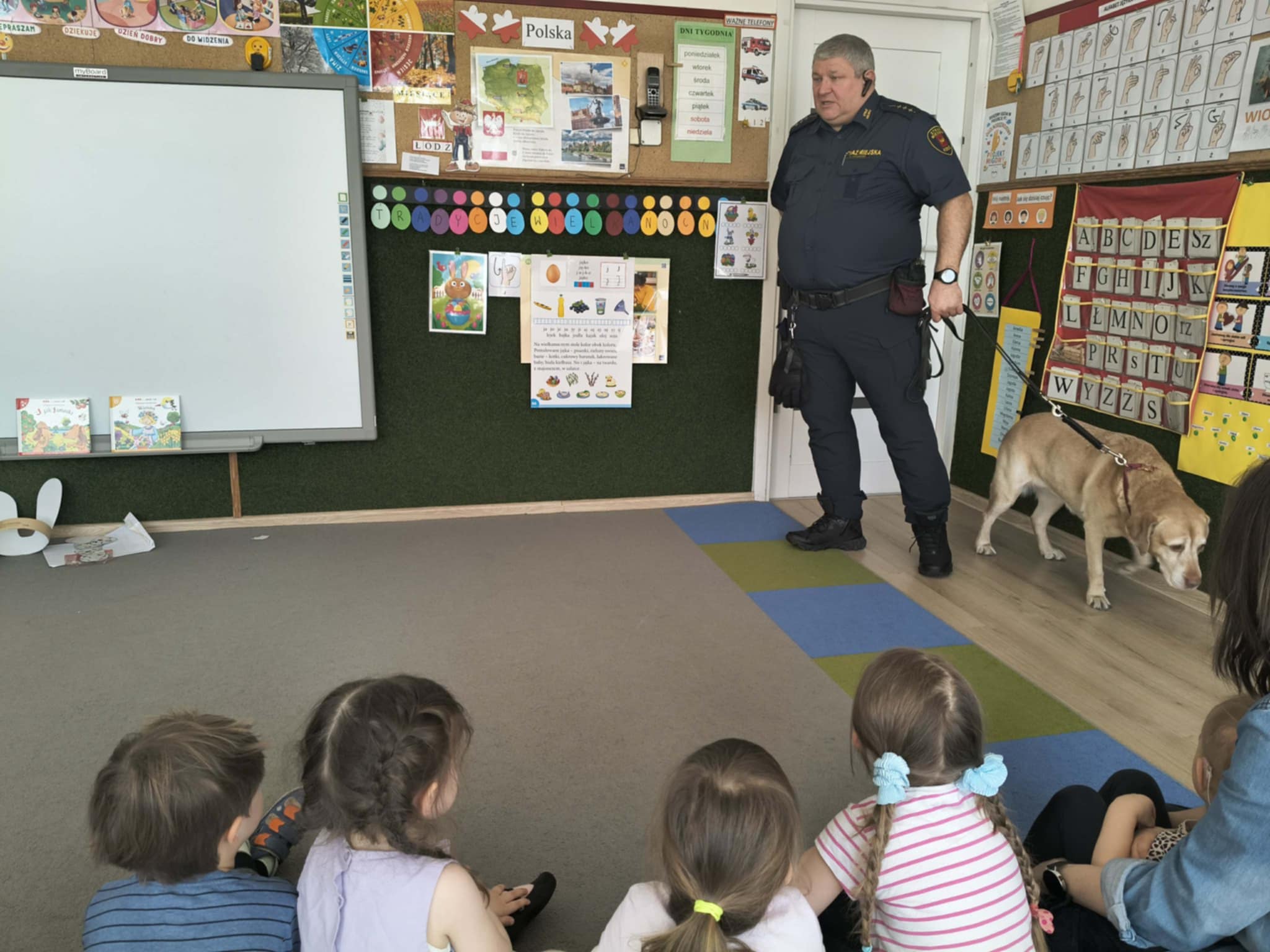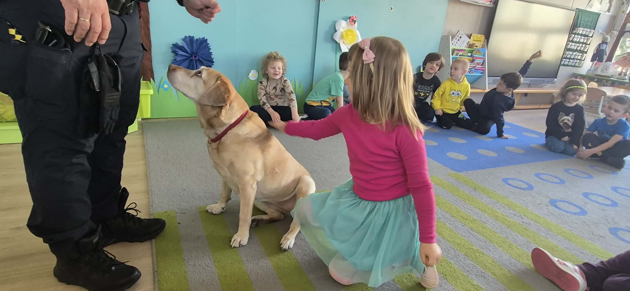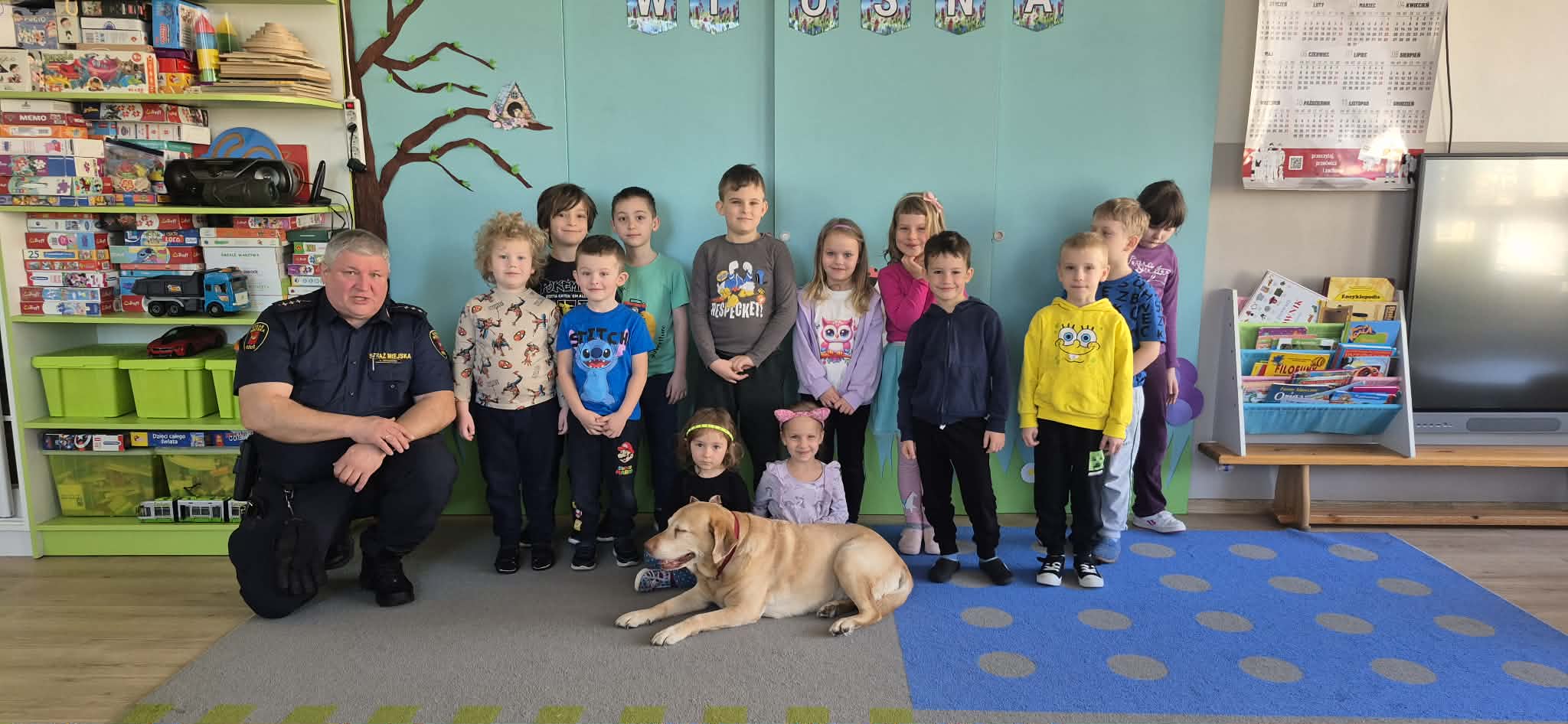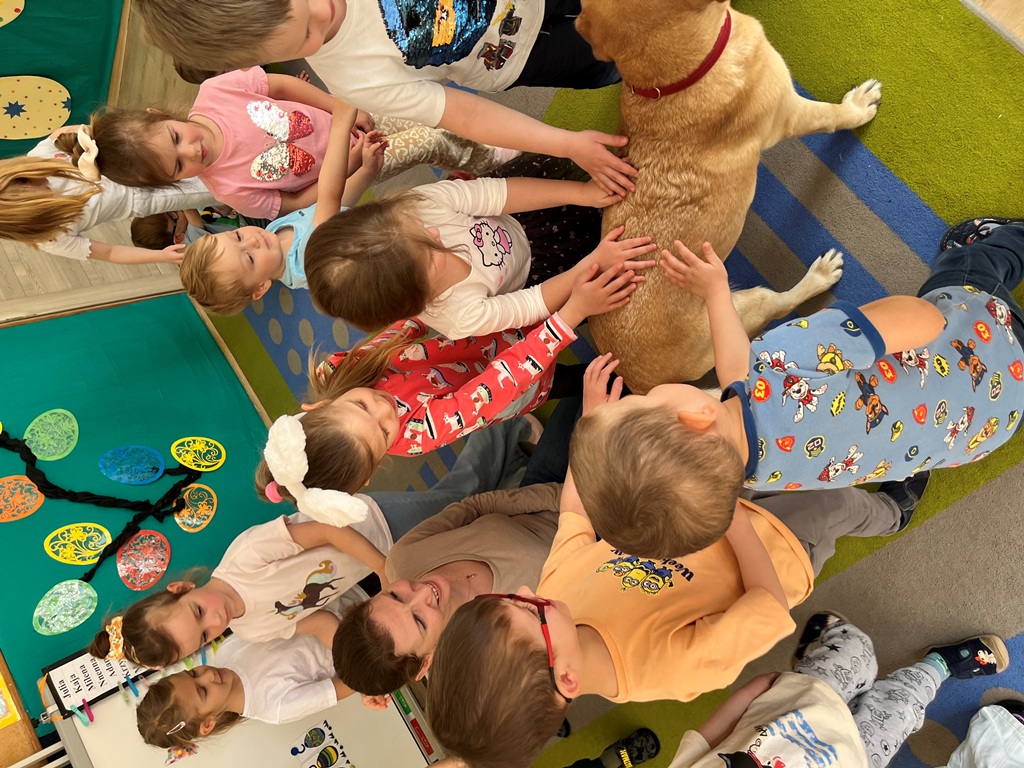 W naszym przedszkolu gościliśmy wyjątkowych gości - pracownika Straży Miejskiej wraz z jego czworonożną towarzyszką Koką. Dzieci podczas wizyty dowiedziały się, jak bezpiecznie zachowywać się podczas spotkań z nowymi zwierzętami. Gość w przystępny i ciekawy sposób tłumaczył, jak należy podchodzić do psa, czego unikać oraz jak odczytywać sygnały wysyłane przez zwierzę, aby kontakt był bezpieczny dla obu stron.