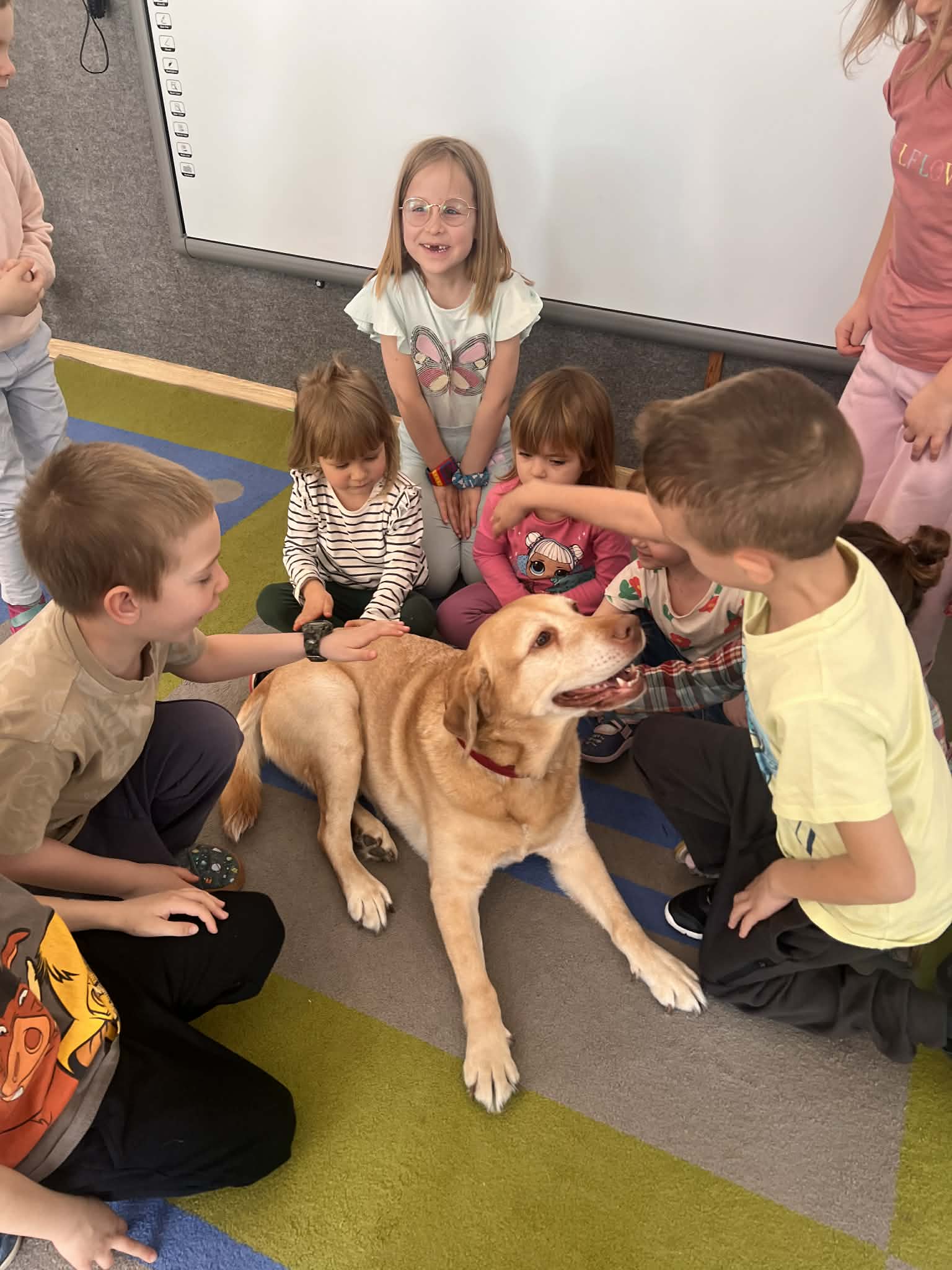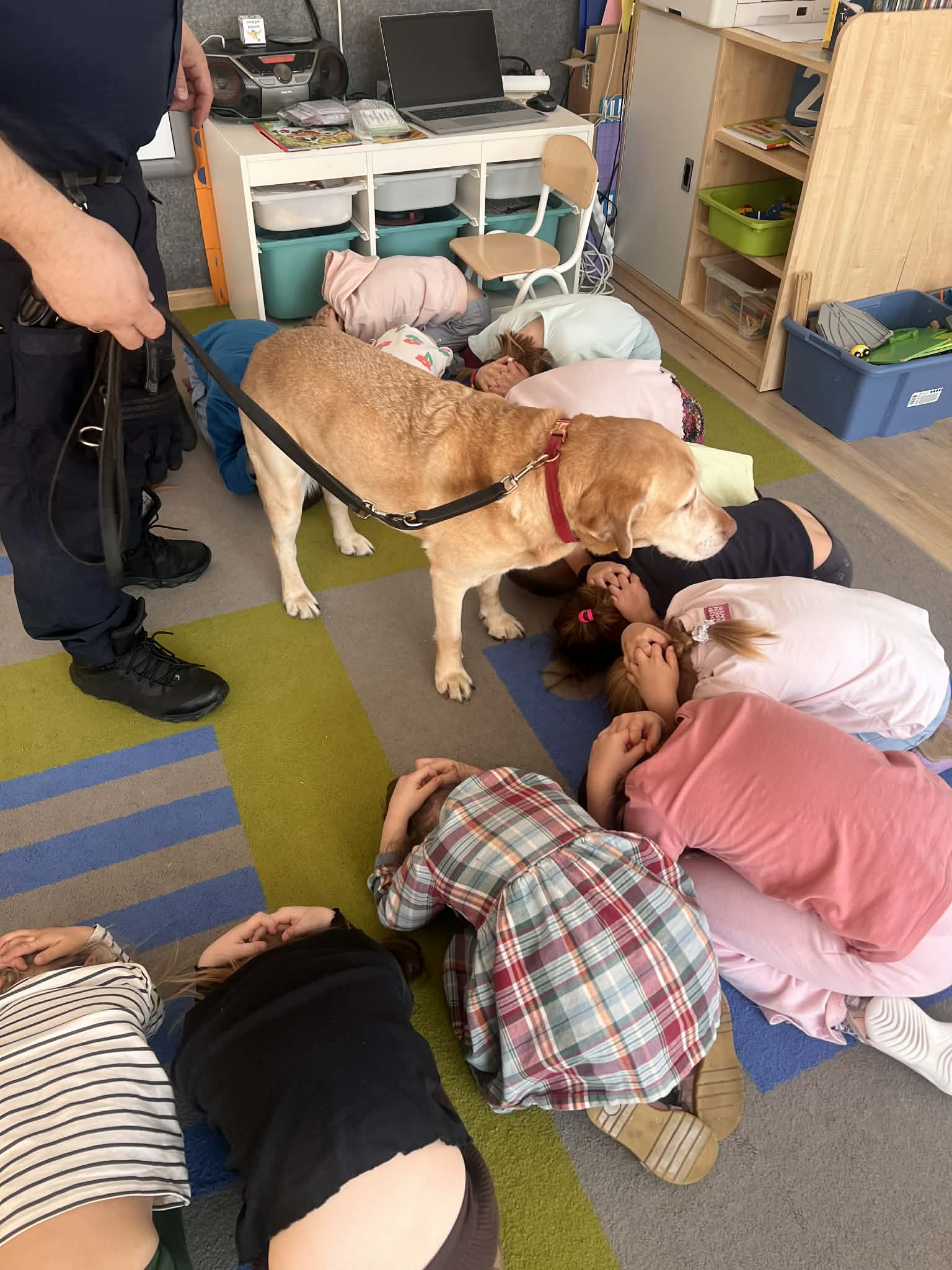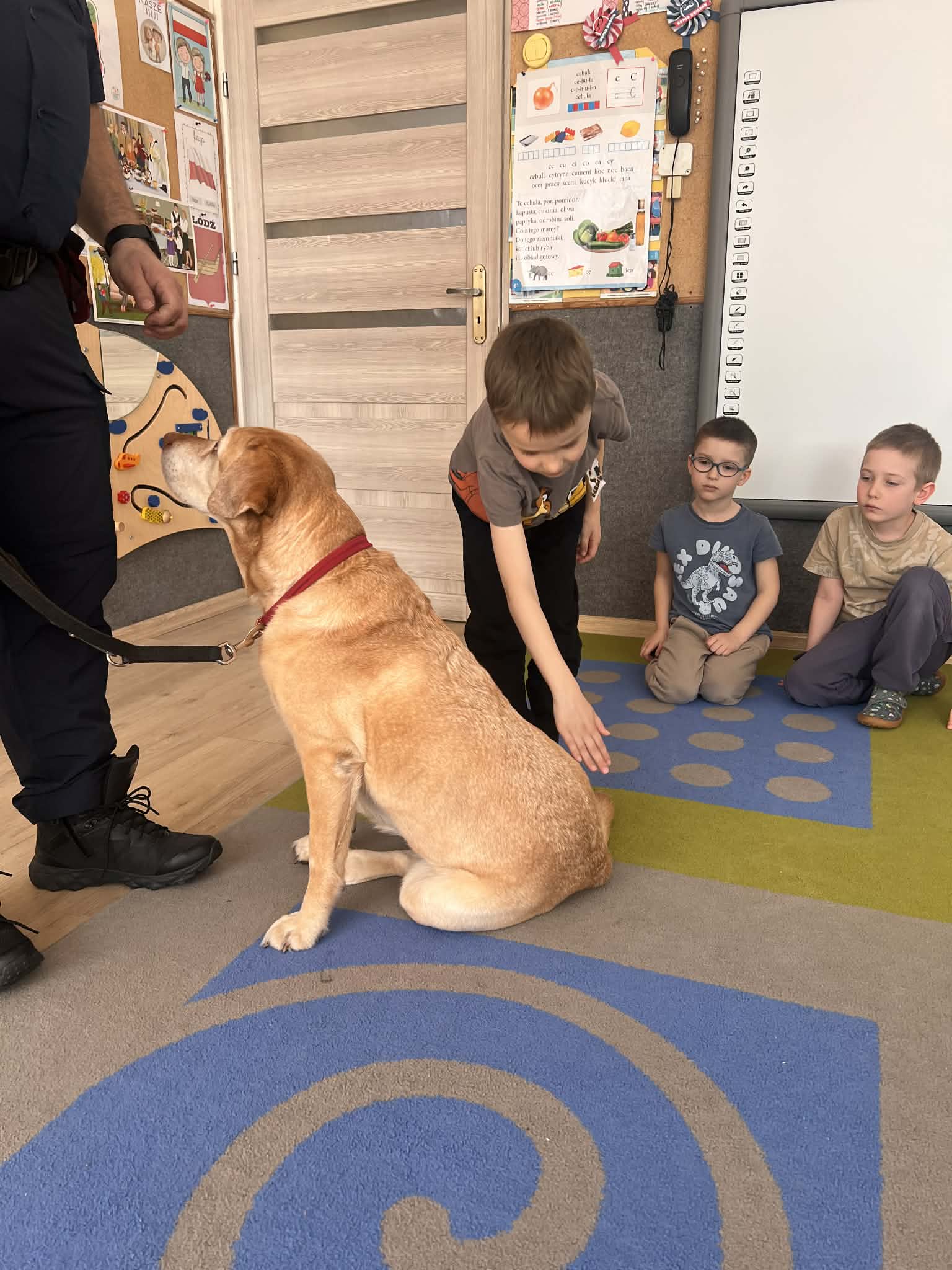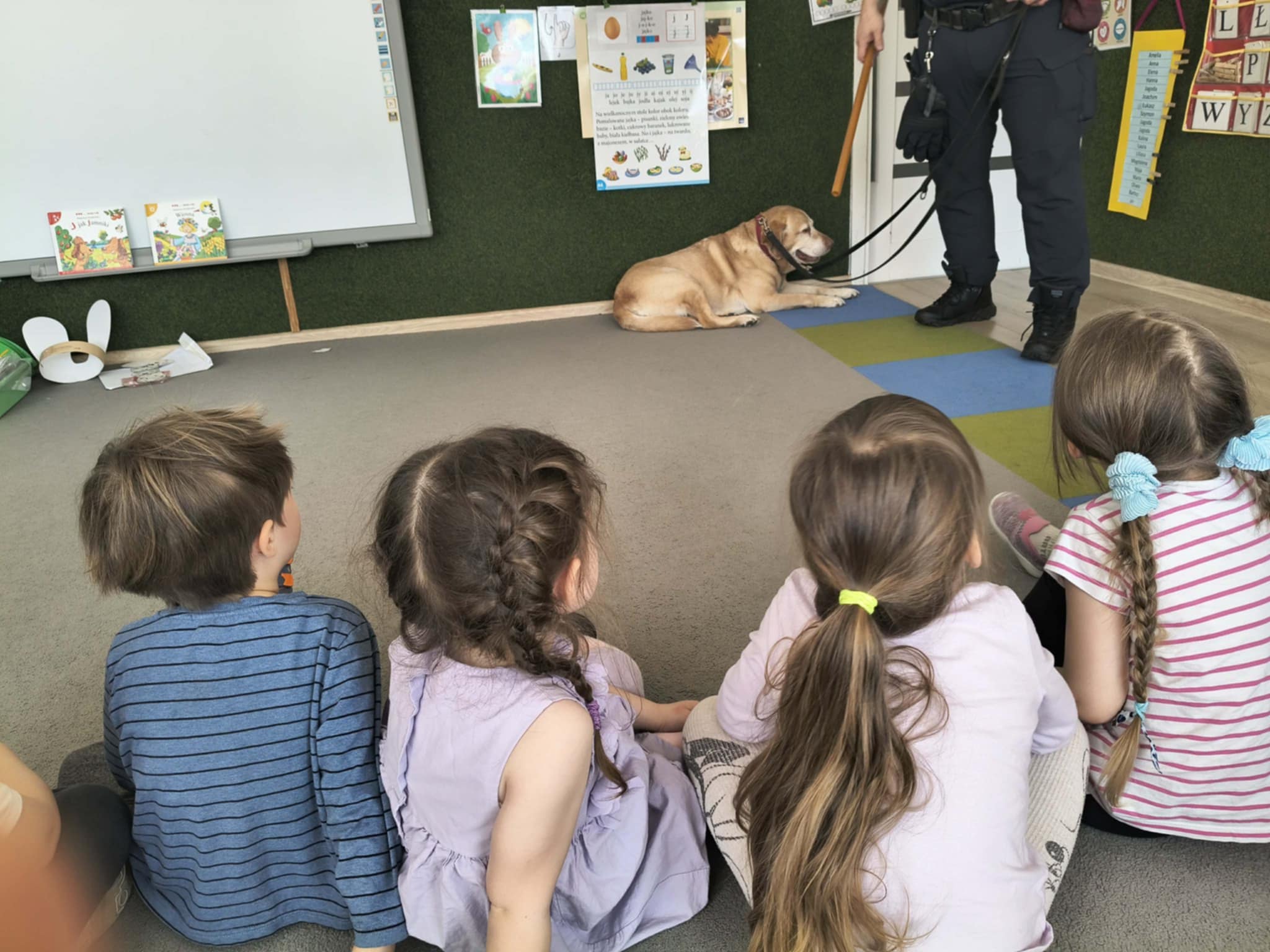 W naszym przedszkolu gościliśmy wyjątkowych gości - pracownika Straży Miejskiej wraz z jego czworonożną towarzyszką Koką. Dzieci podczas wizyty dowiedziały się, jak bezpiecznie zachowywać się podczas spotkań z nowymi zwierzętami. Gość w przystępny i ciekawy sposób tłumaczył, jak należy podchodzić do psa, czego unikać oraz jak odczytywać sygnały wysyłane przez zwierzę, aby kontakt był bezpieczny dla obu stron.