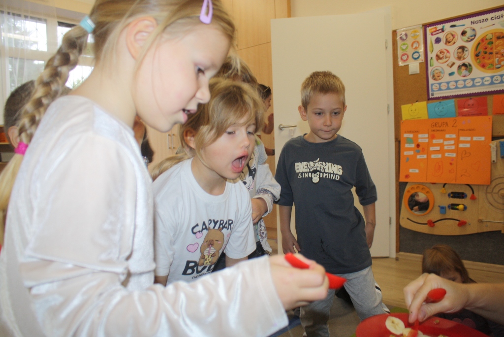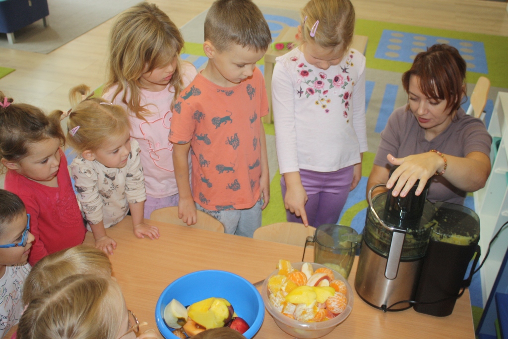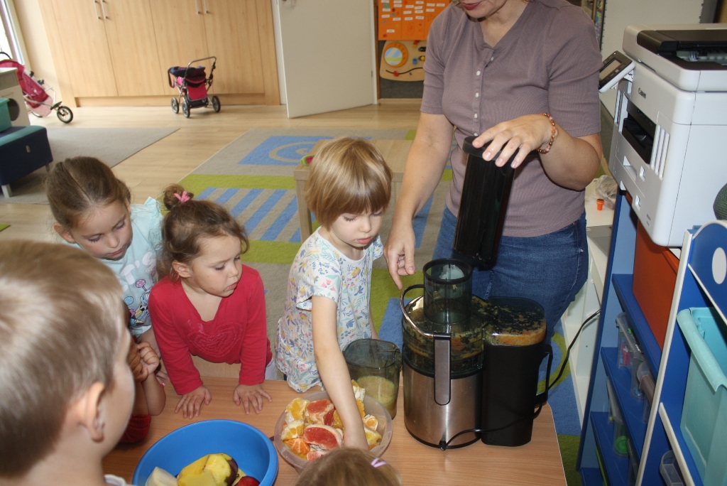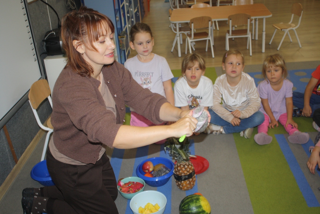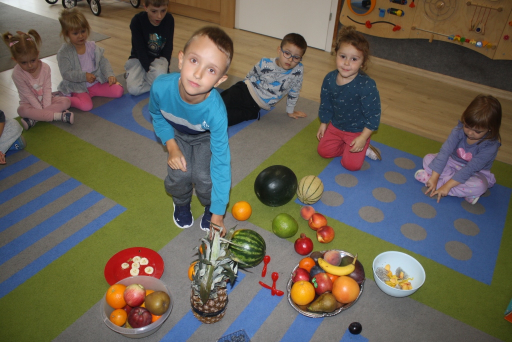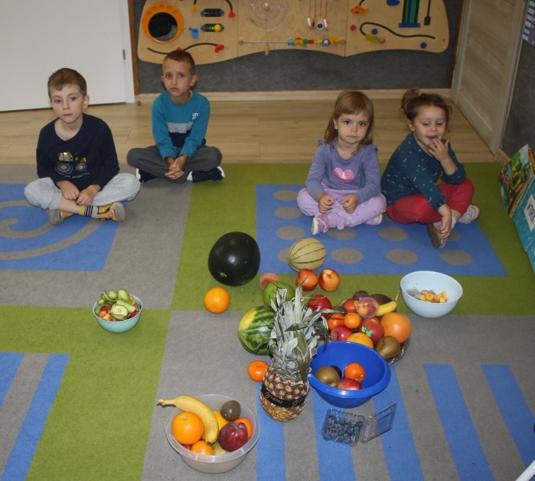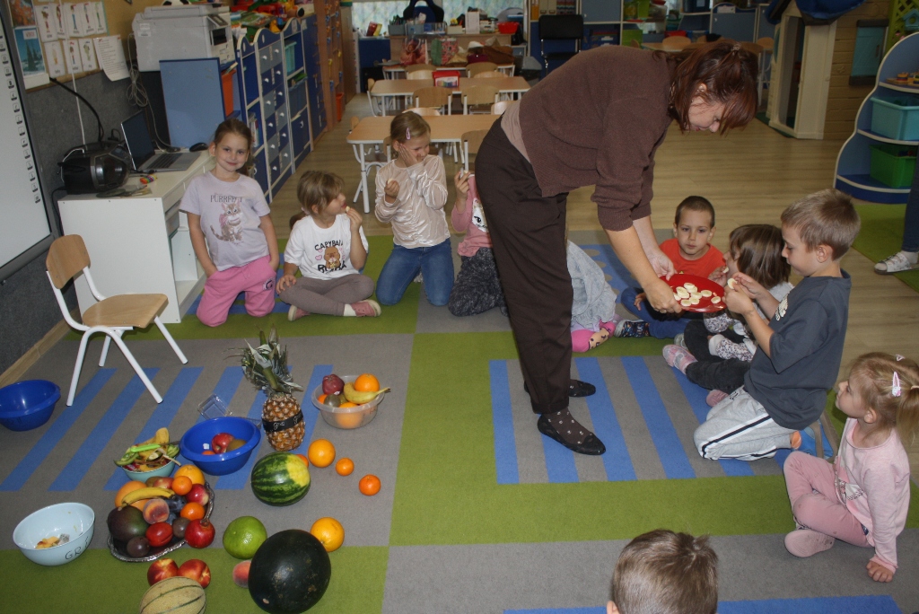 Tydzień owocowy rozpoczął się poznaniem i nazwaniem owoców polskich i egzotycznych. Dzieci poznawały smaki i zapachy tych przysmaków. Rozwiązywały zagadki dotykowe i smakowe. Oprócz kosztowania całych owoców wykonaliśmy również pyszny i zdrowy sok wieloowocowy. Było smacznie.