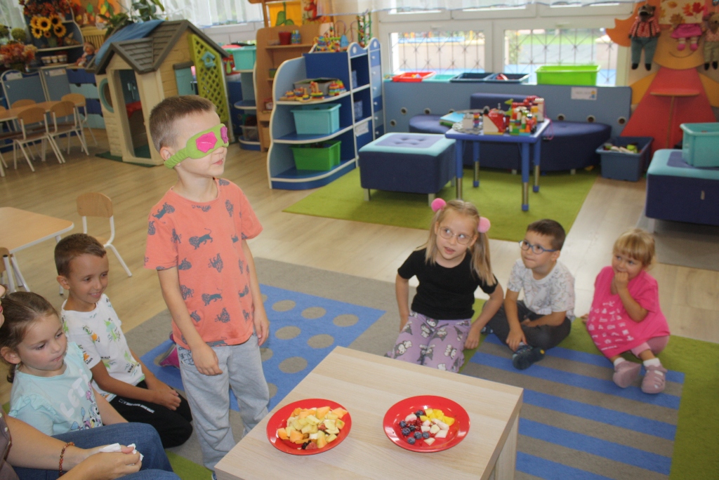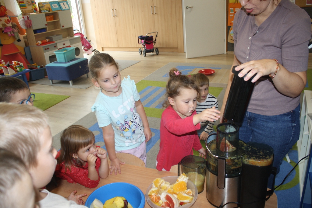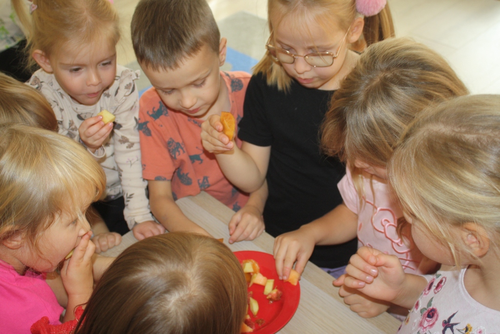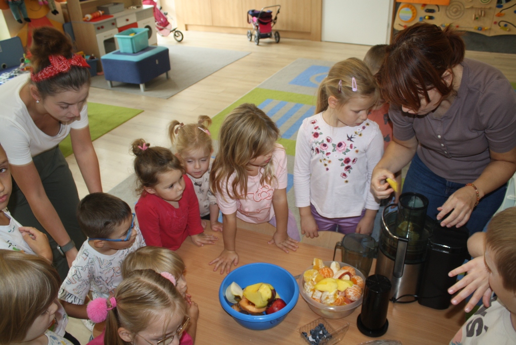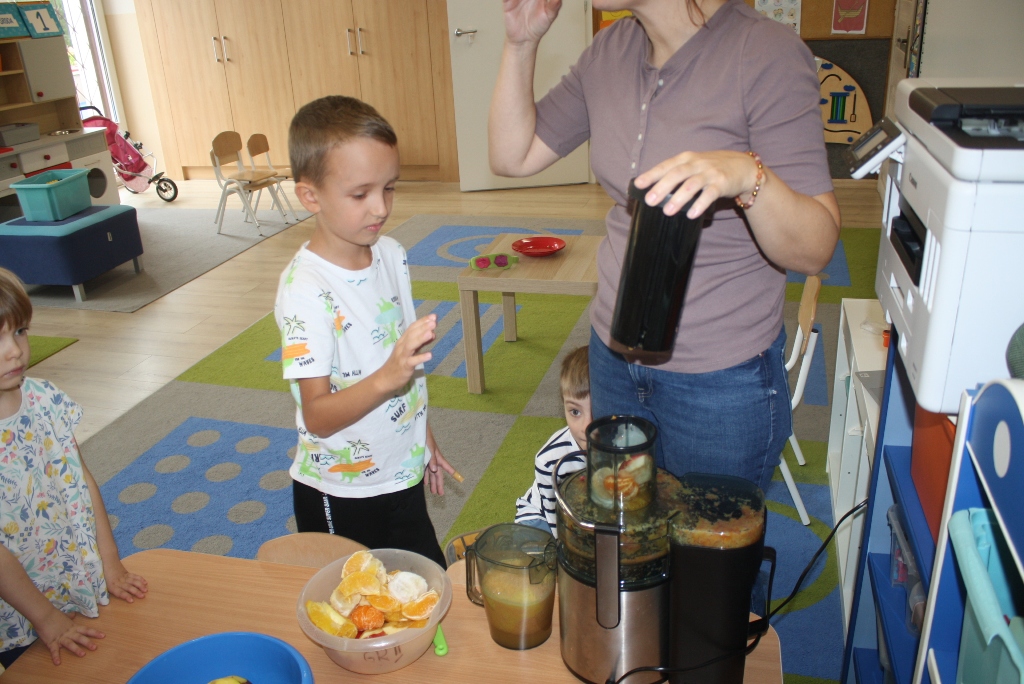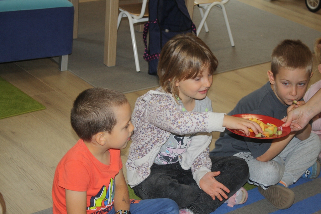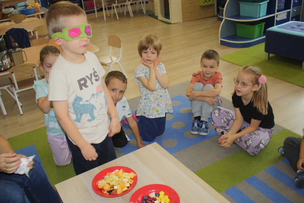 Tydzień owocowy rozpoczął się poznaniem i nazwaniem owoców polskich i egzotycznych. Dzieci poznawały smaki i zapachy tych przysmaków. Rozwiązywały zagadki dotykowe i smakowe. Oprócz kosztowania całych owoców wykonaliśmy również pyszny i zdrowy sok wieloowocowy. Było smacznie.