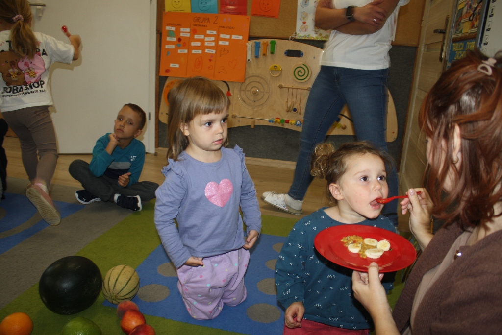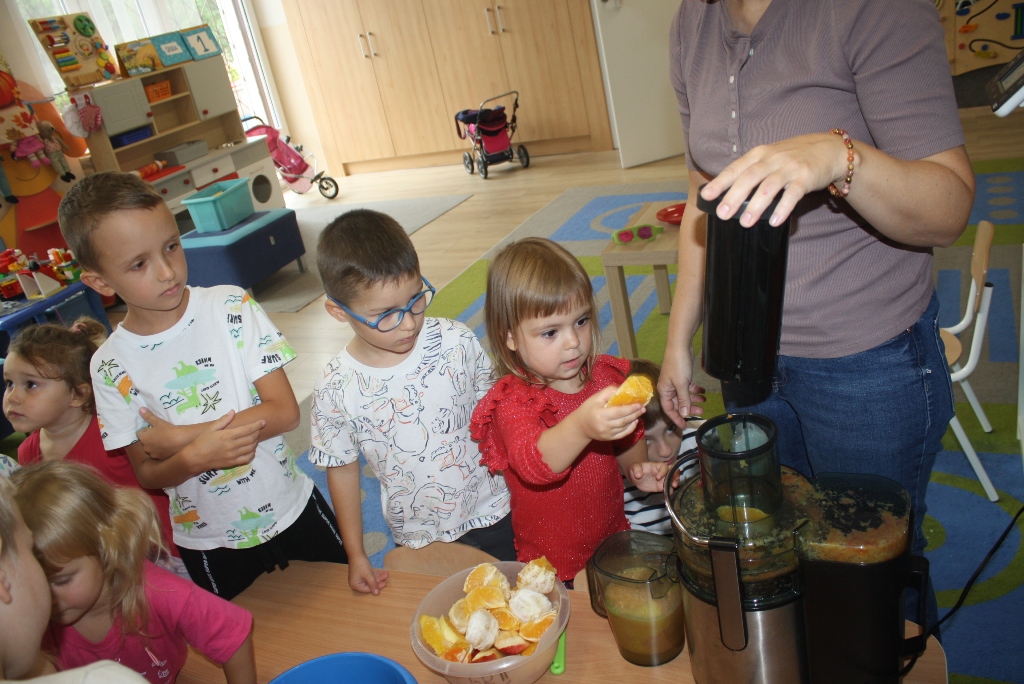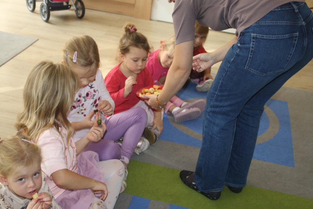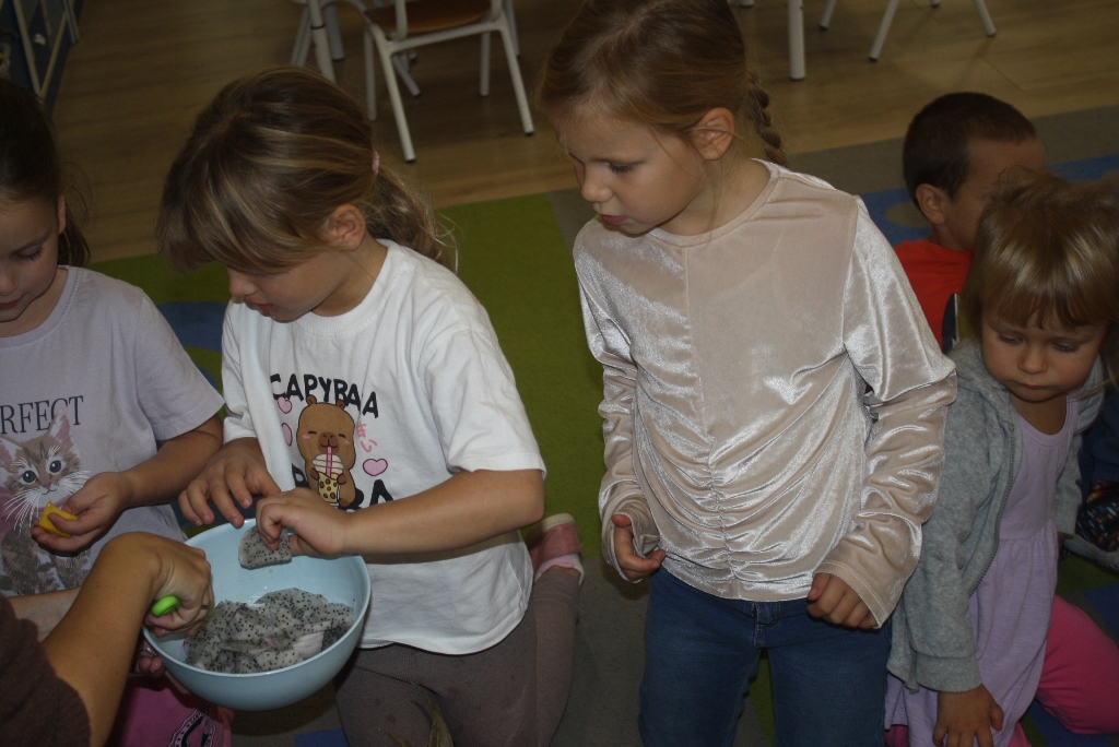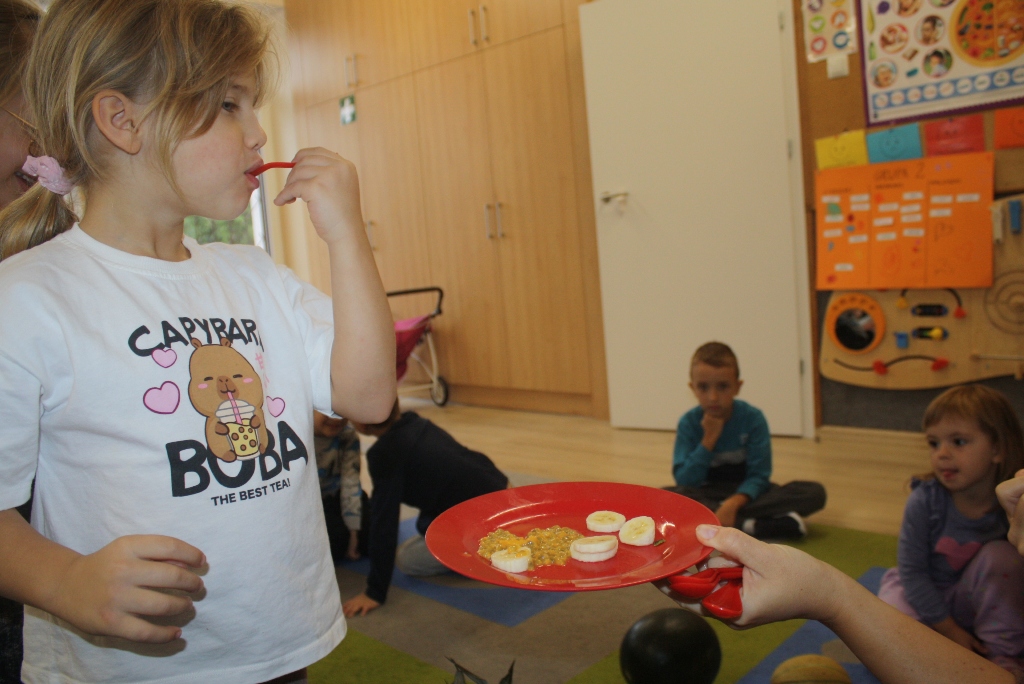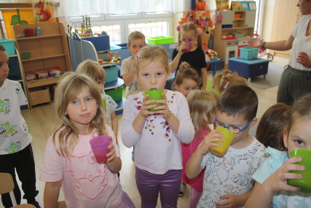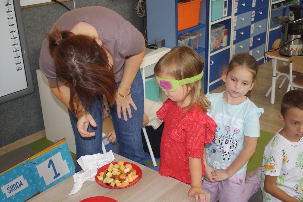 Tydzień owocowy rozpoczął się poznaniem i nazwaniem owoców polskich i egzotycznych. Dzieci poznawały smaki i zapachy tych przysmaków. Rozwiązywały zagadki dotykowe i smakowe. Oprócz kosztowania całych owoców wykonaliśmy również pyszny i zdrowy sok wieloowocowy. Było smacznie.