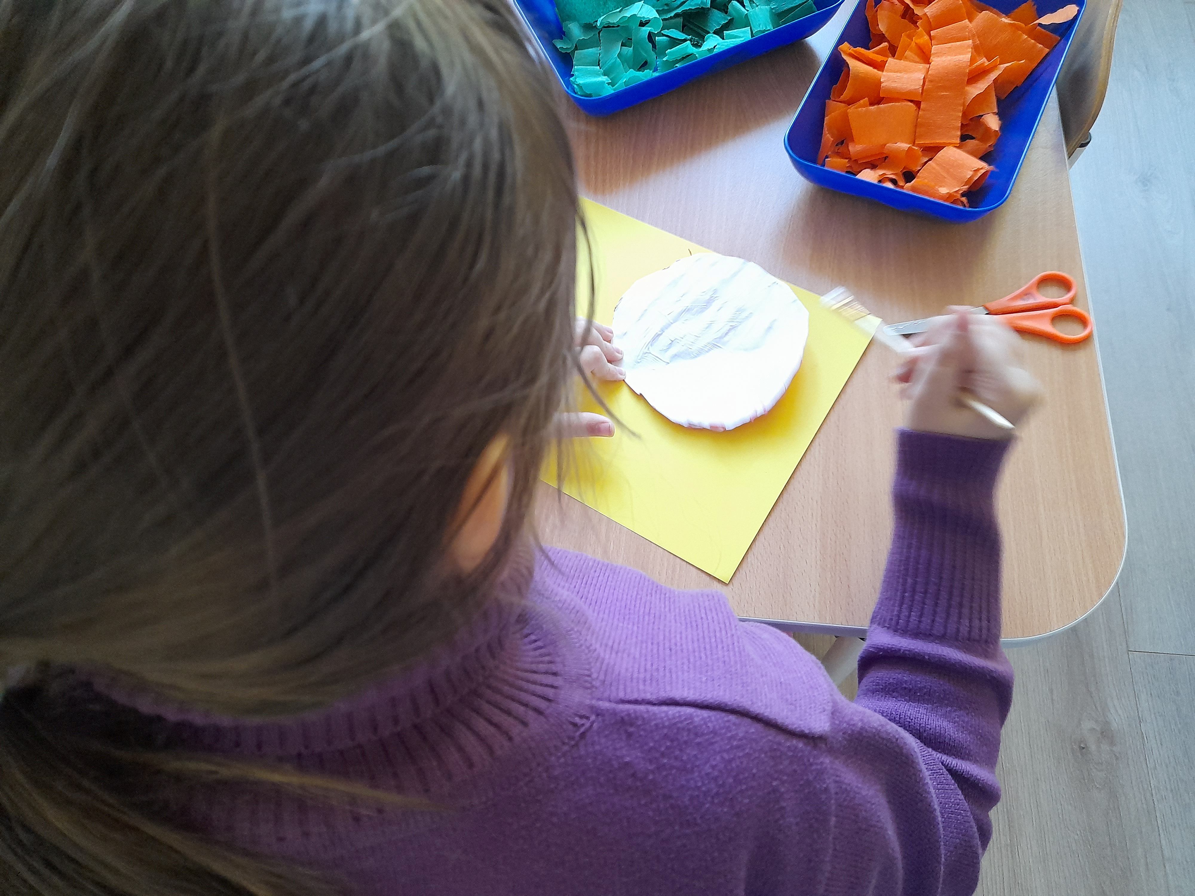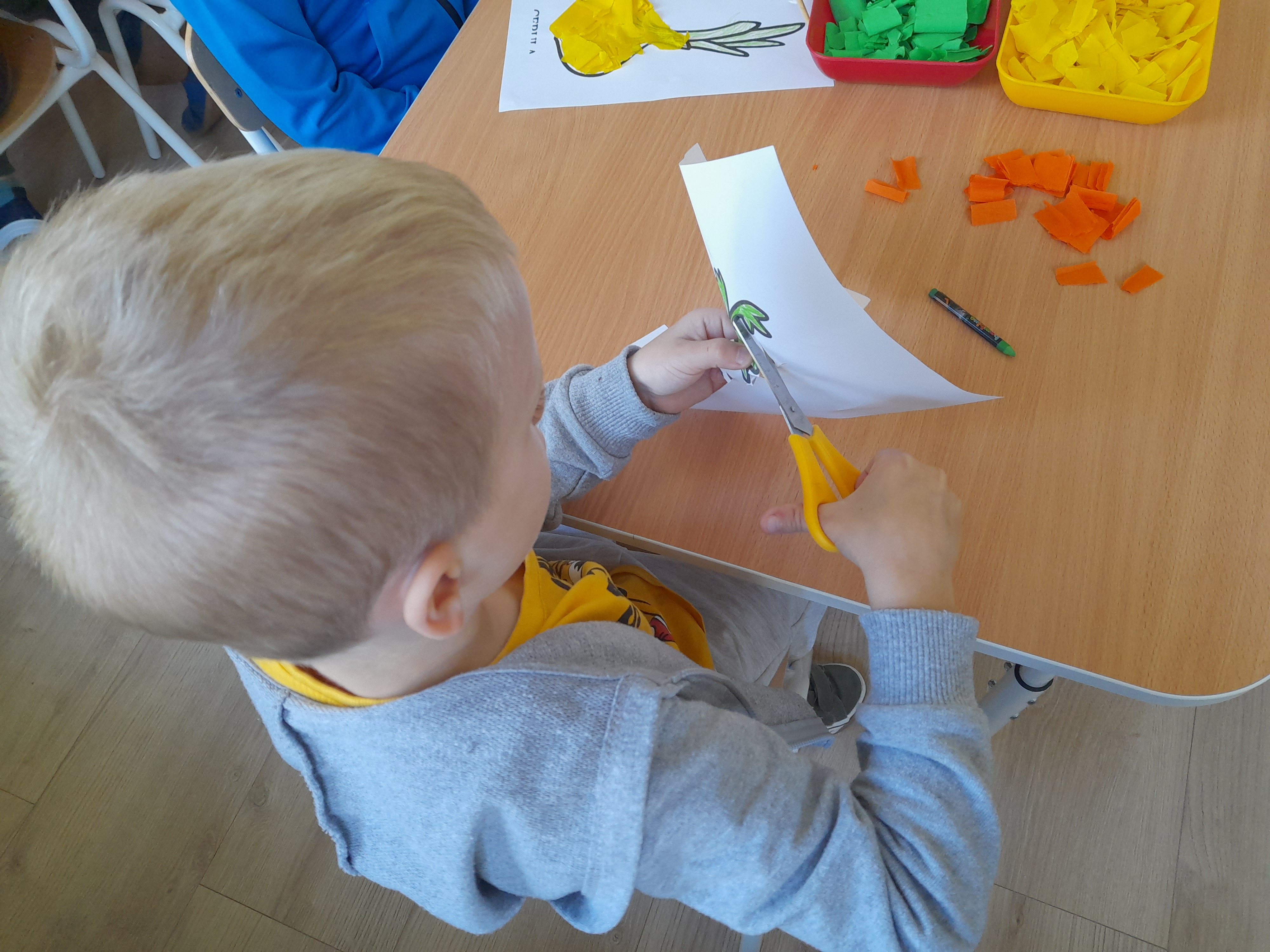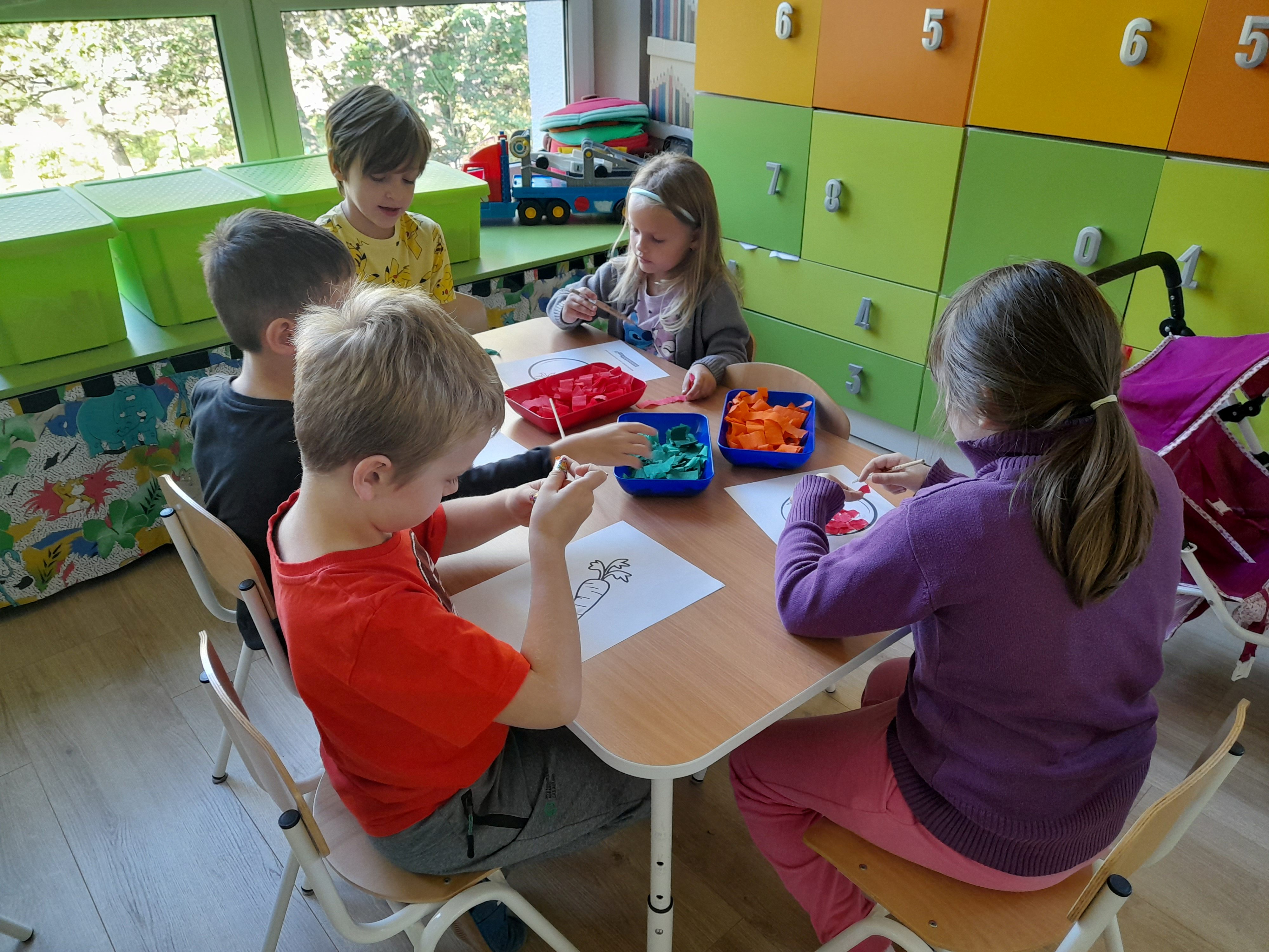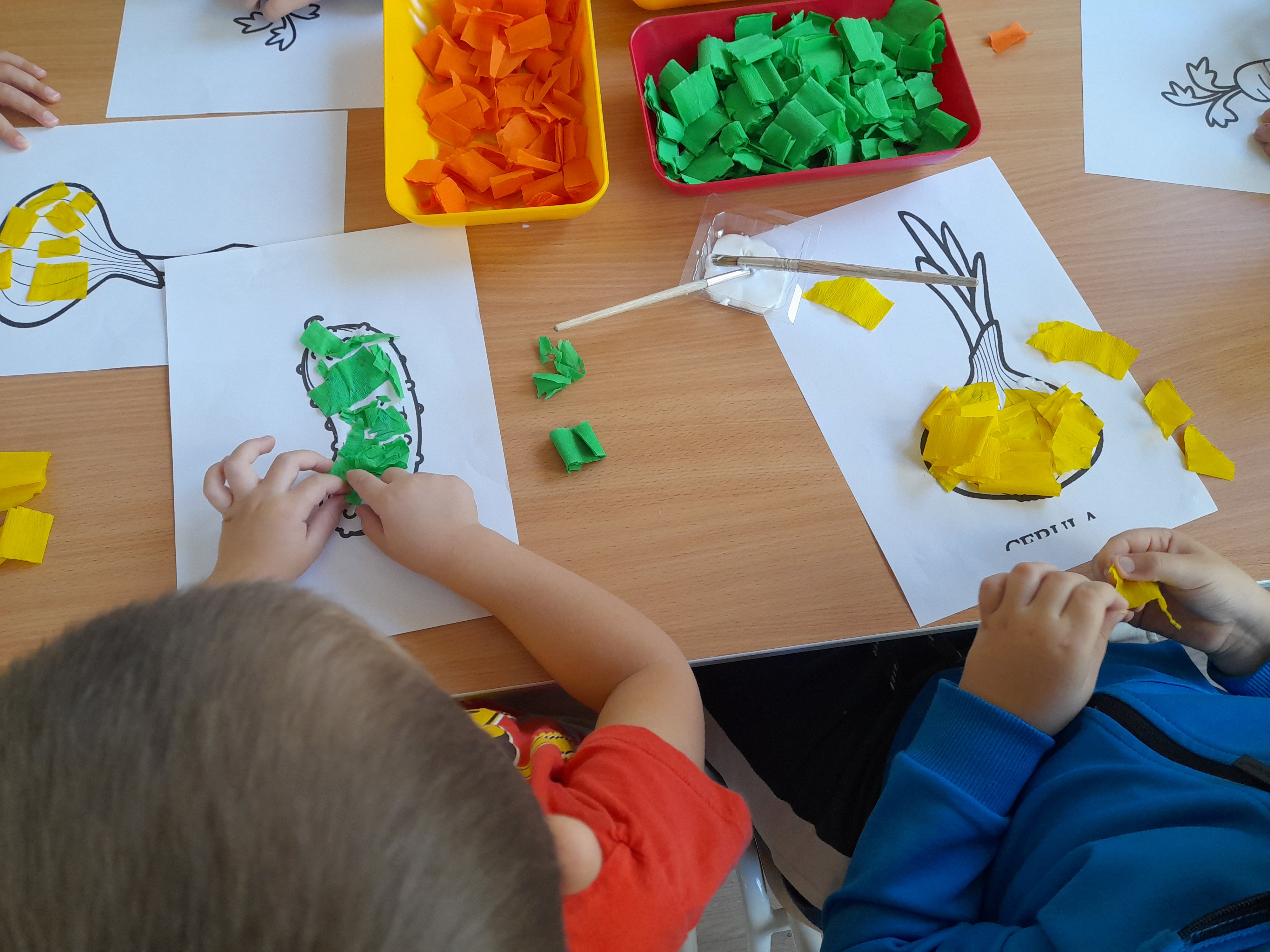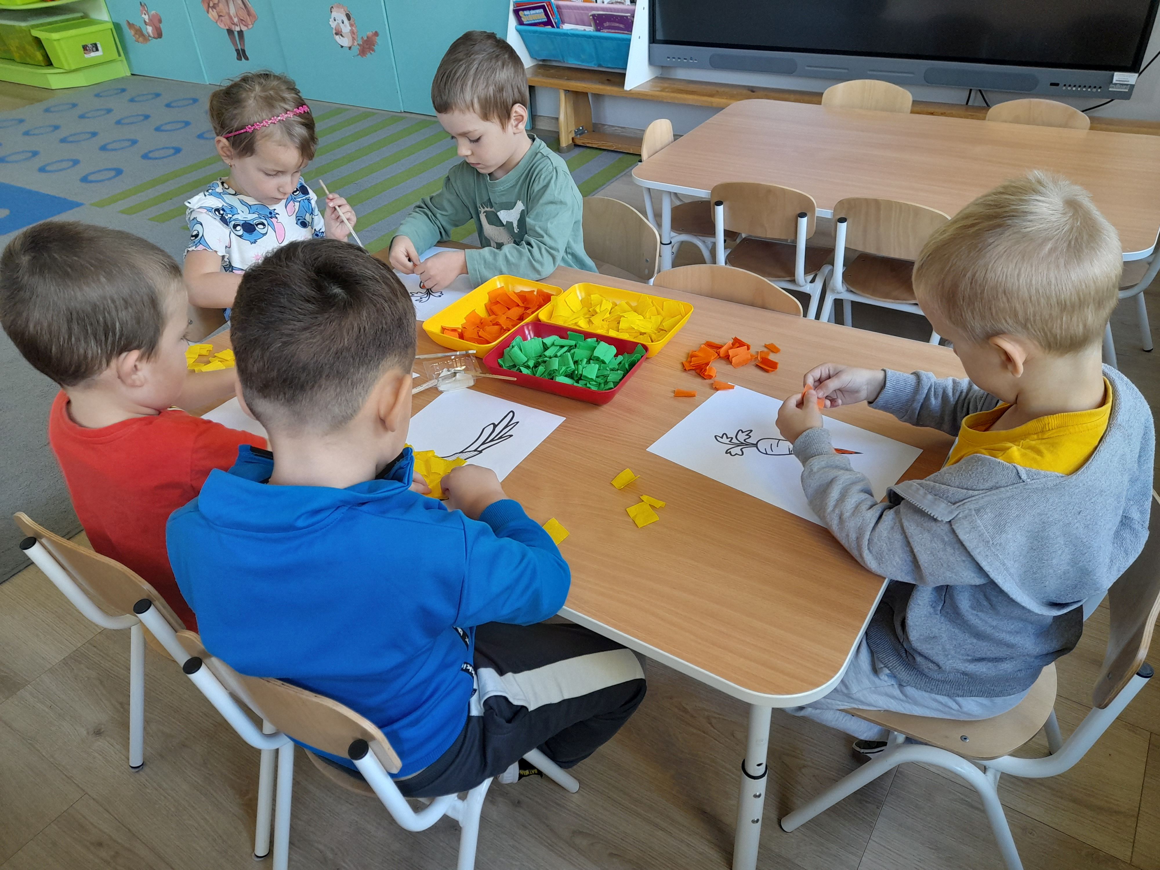 Dzieci z grupy 5 wykonały pracę plastyczno-techniczną związaną z warzywami. Najpierw wyklejały kawałkami bibuły warzywa a następnie wycięły je i przykleiły na kolorowe kartki papieru. Dzieci były bardzo zadowolone z efektów swoich prac.