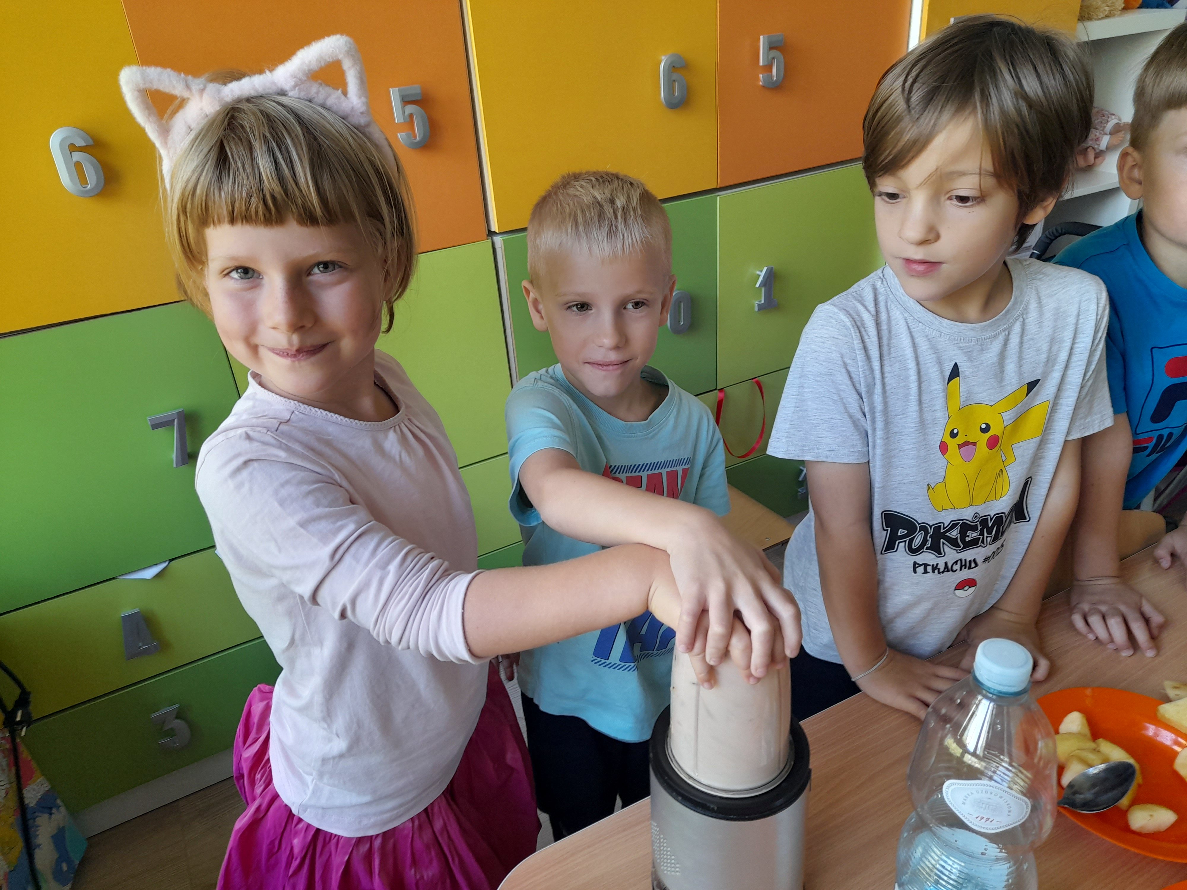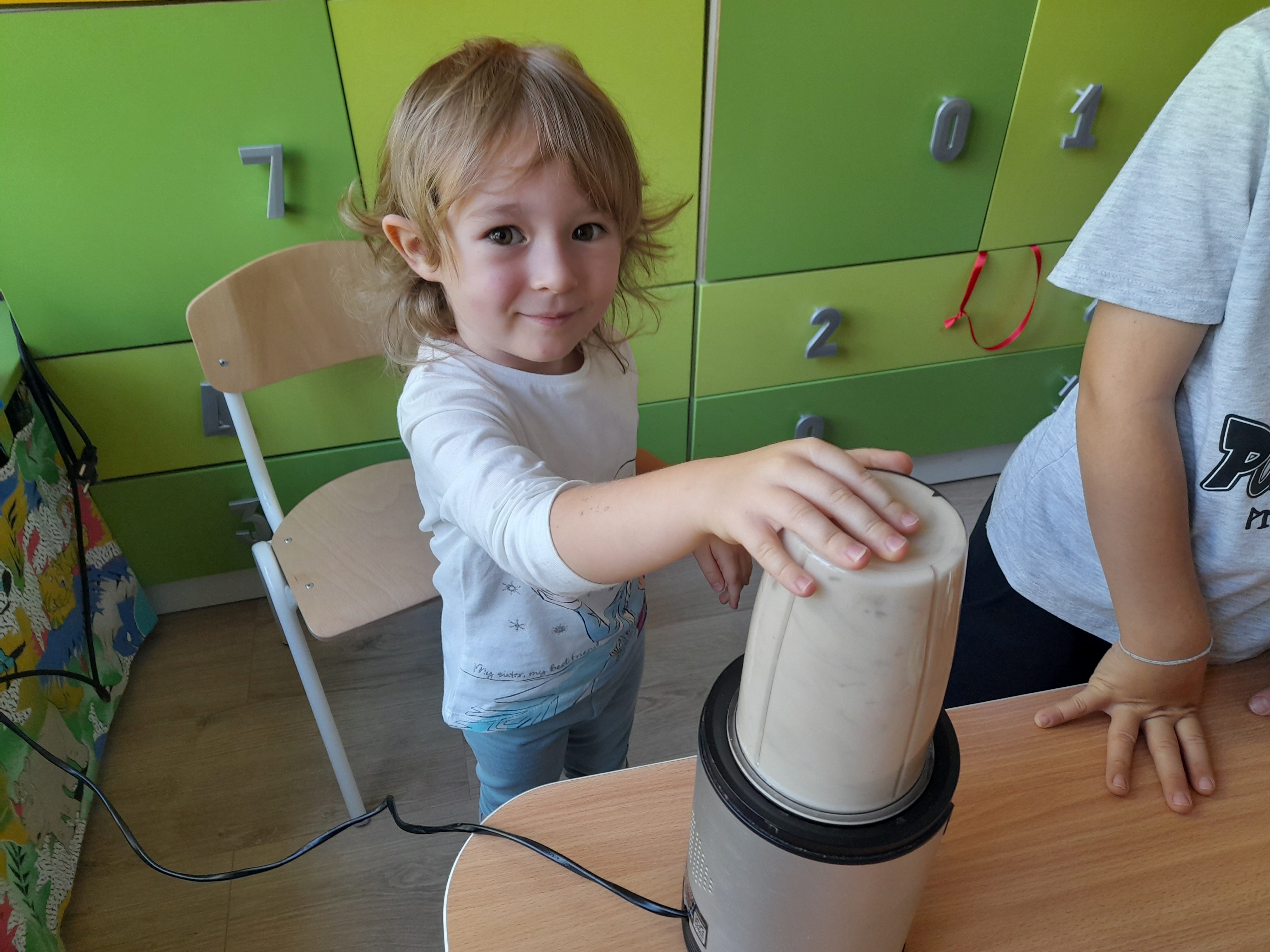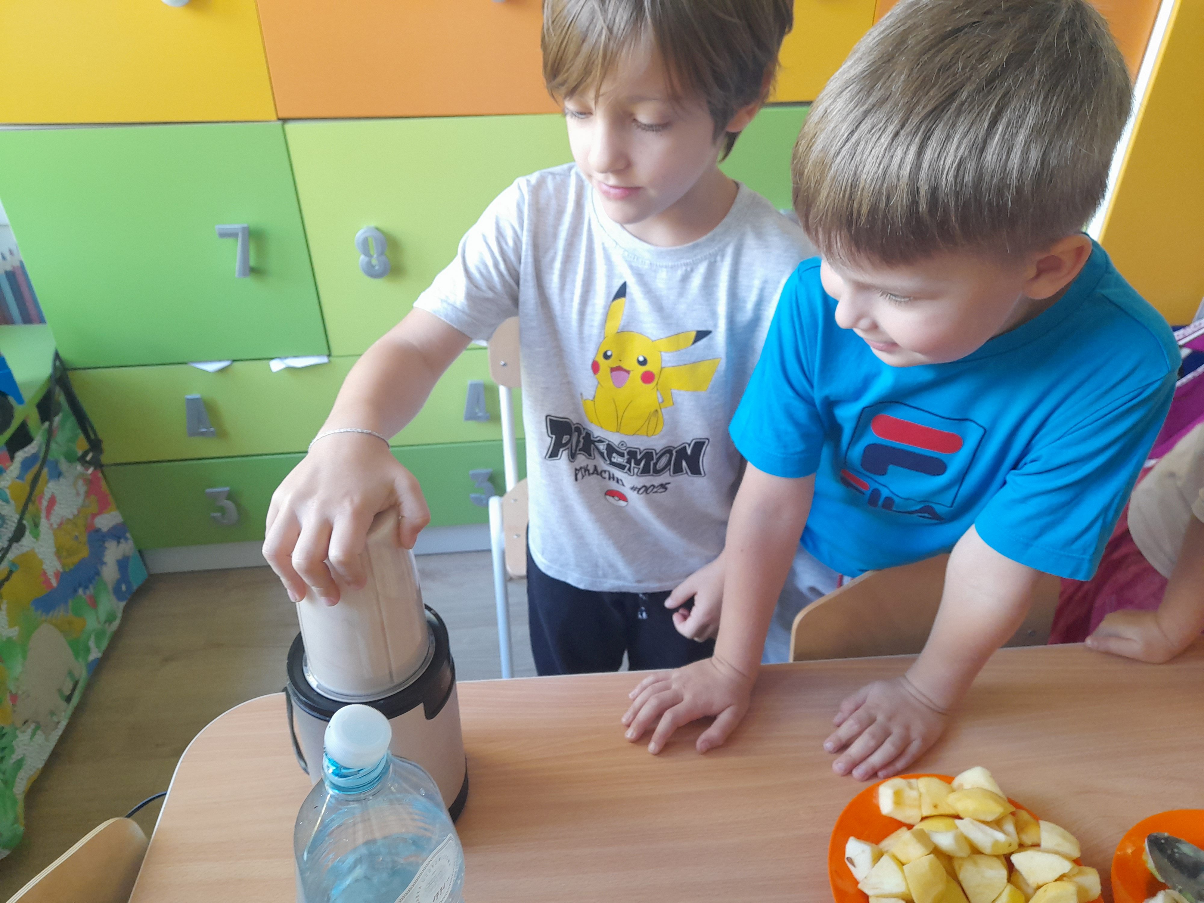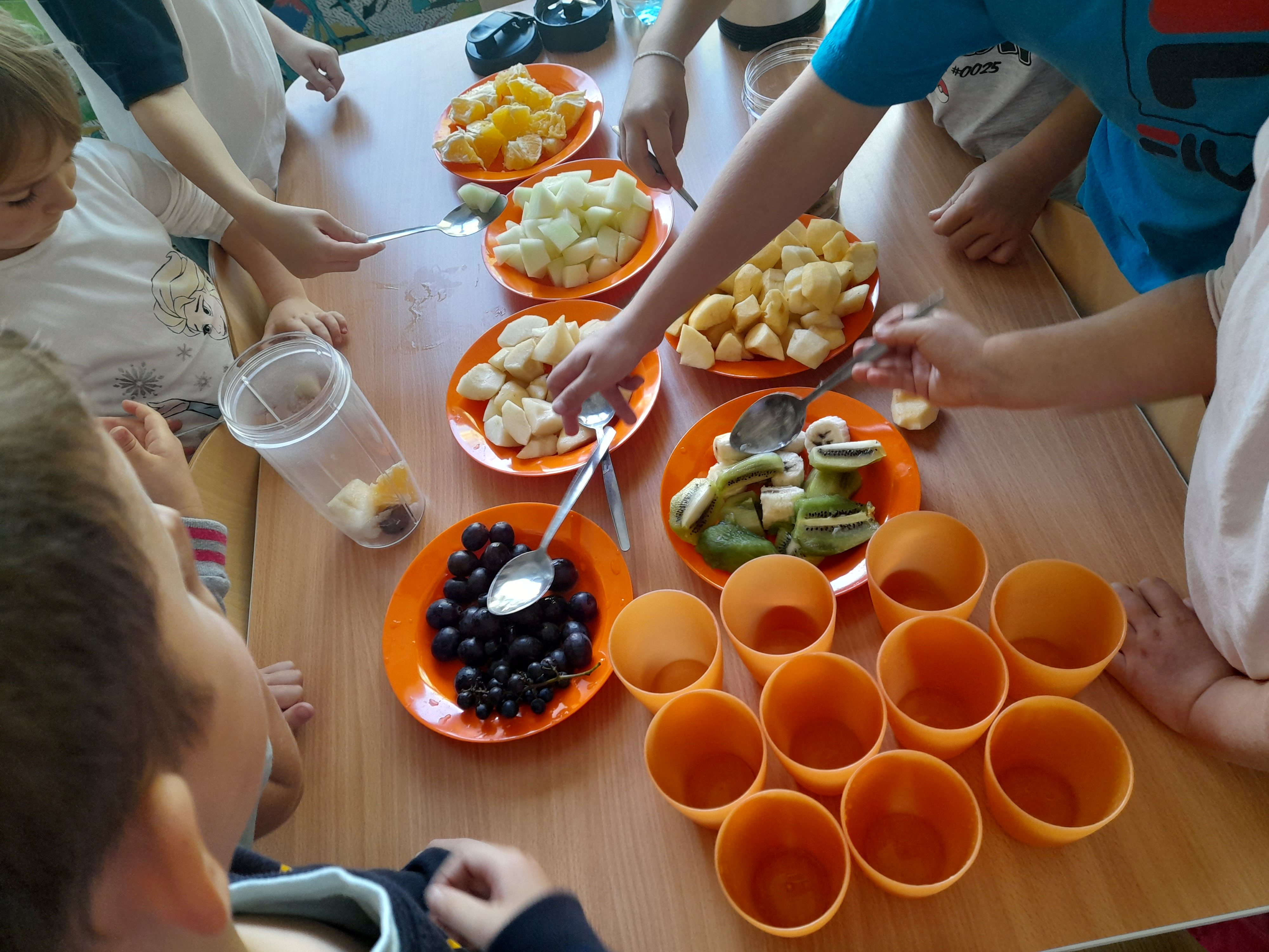 Dzieci z grupy 5 z przyniesionych przez siebie owoców do przedszkola stworzyły własnoręcznie mus owocowy. Miksowały one pokrojone wcześniej owoce w blenderze, z których powstał pyszny i zdrowy mus owocowy. Przedszkolaki miały wiele radości podczas przygotowywania musu i bardzo im on smakował.