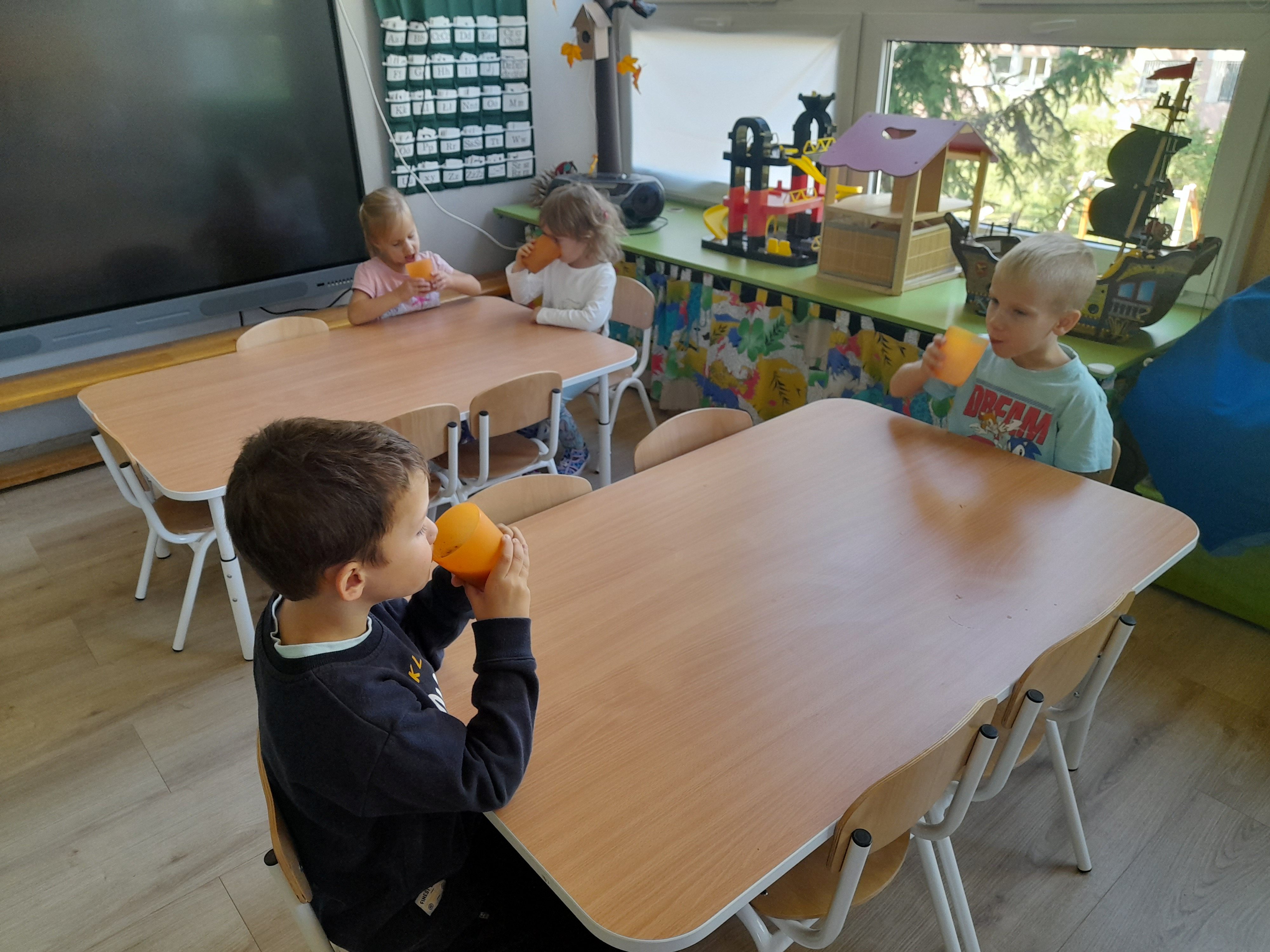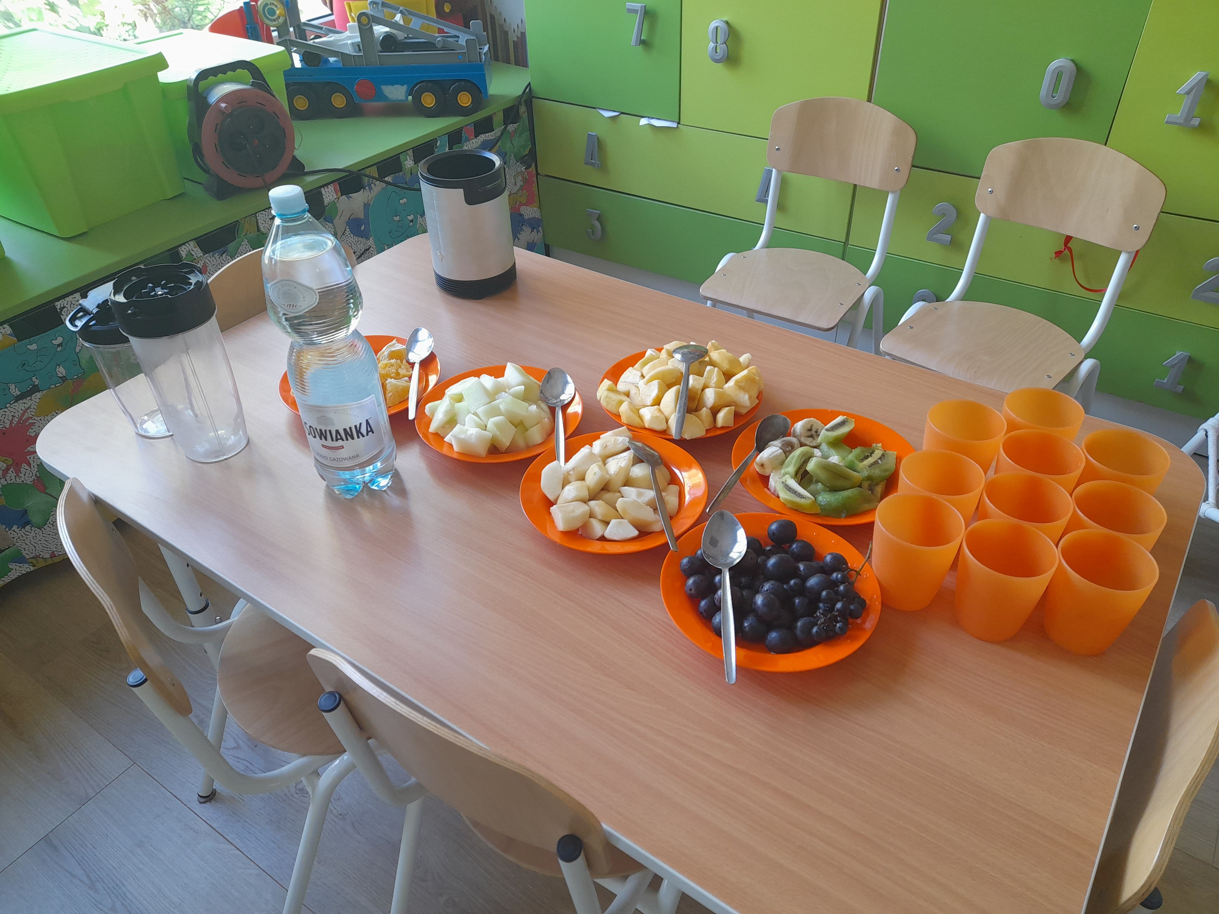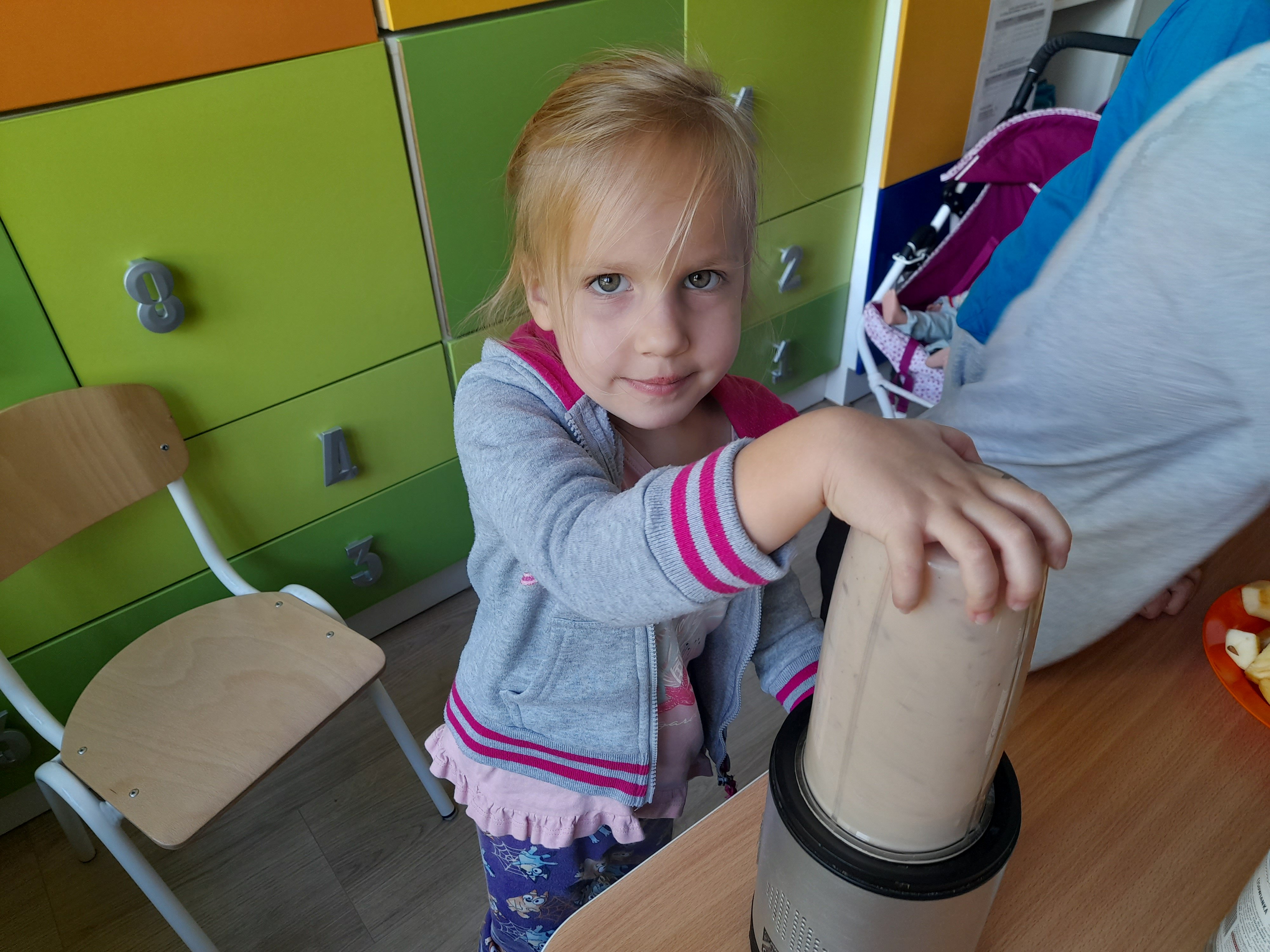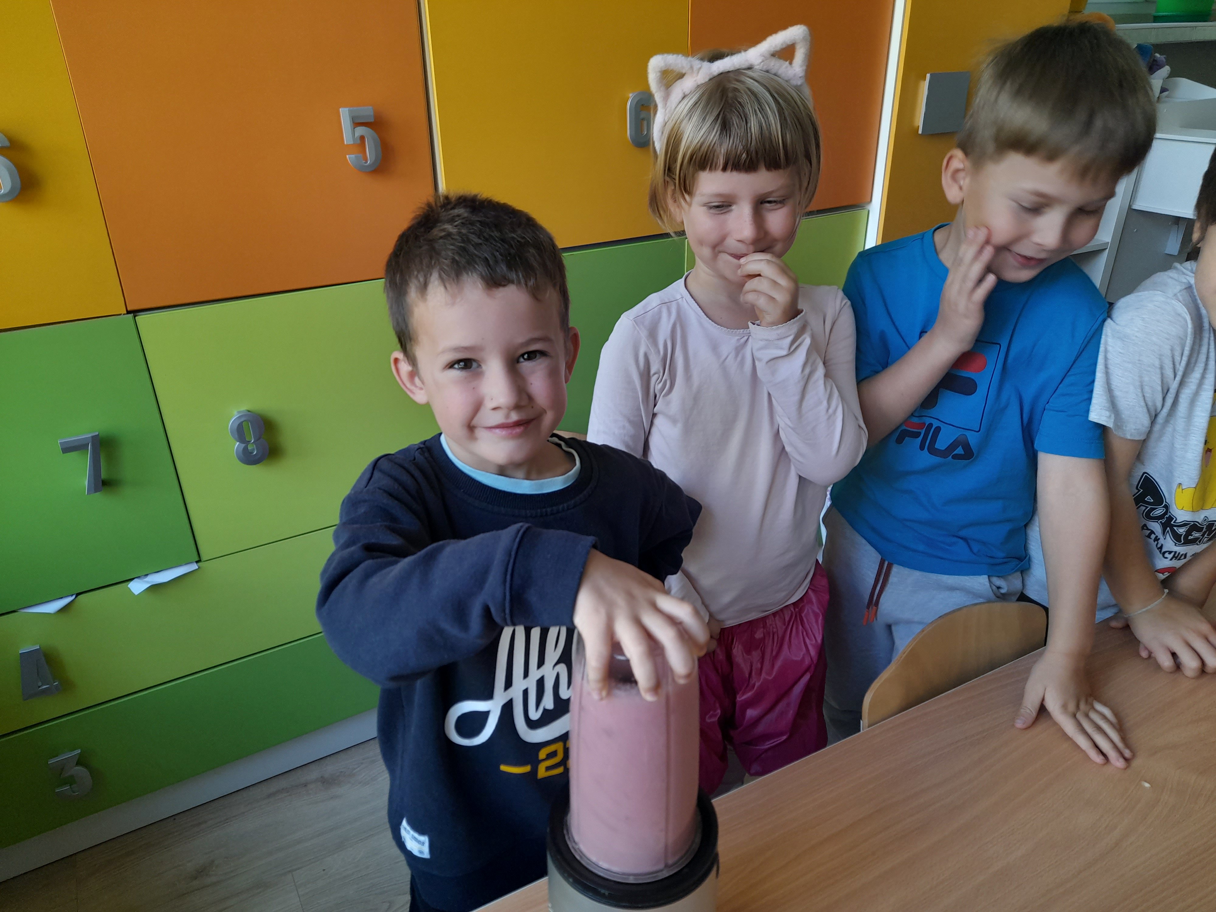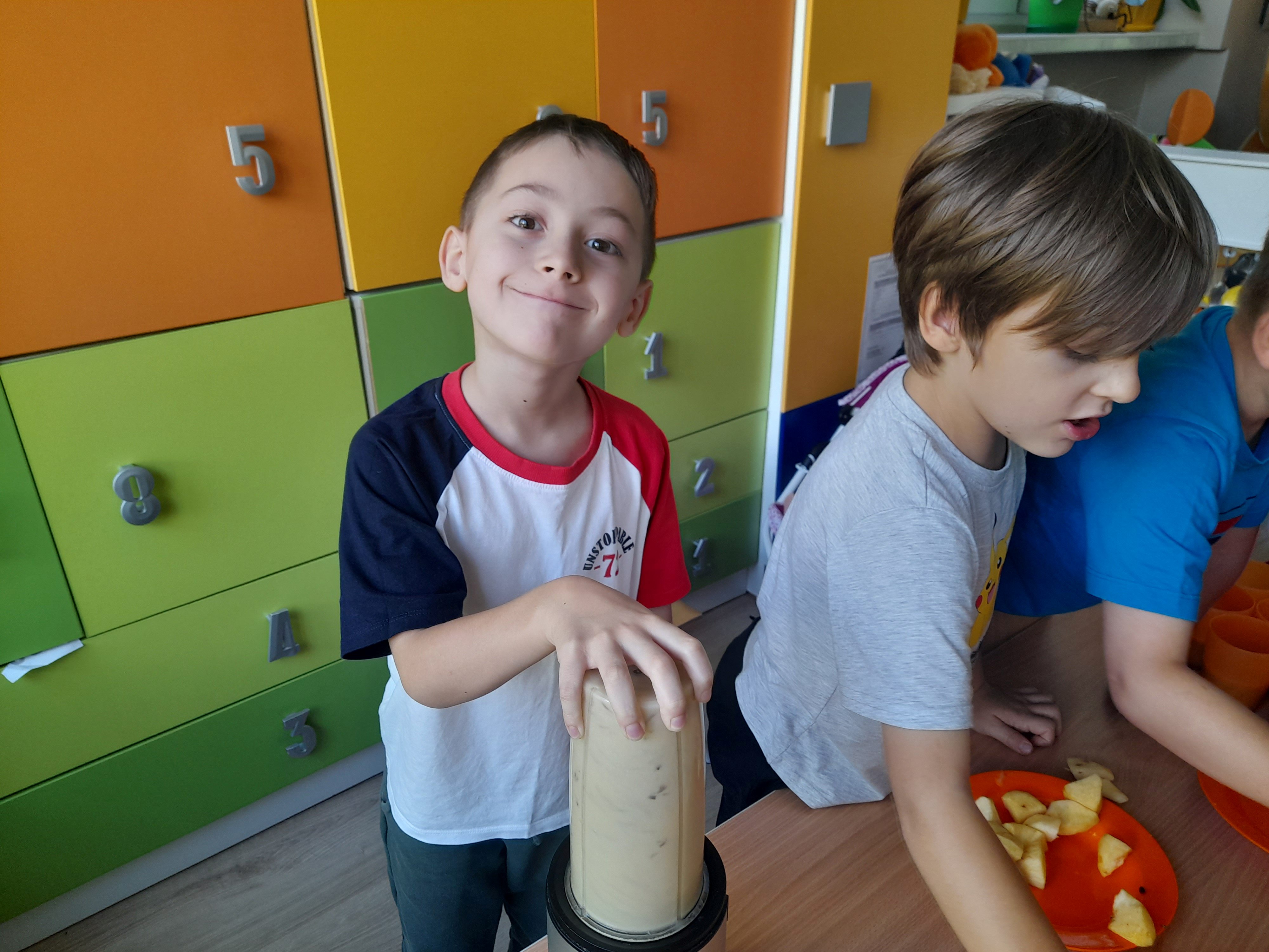 Dzieci z grupy 5 z przyniesionych przez siebie owoców do przedszkola stworzyły własnoręcznie mus owocowy. Miksowały one pokrojone wcześniej owoce w blenderze, z których powstał pyszny i zdrowy mus owocowy. Przedszkolaki miały wiele radości podczas przygotowywania musu i bardzo im on smakował.