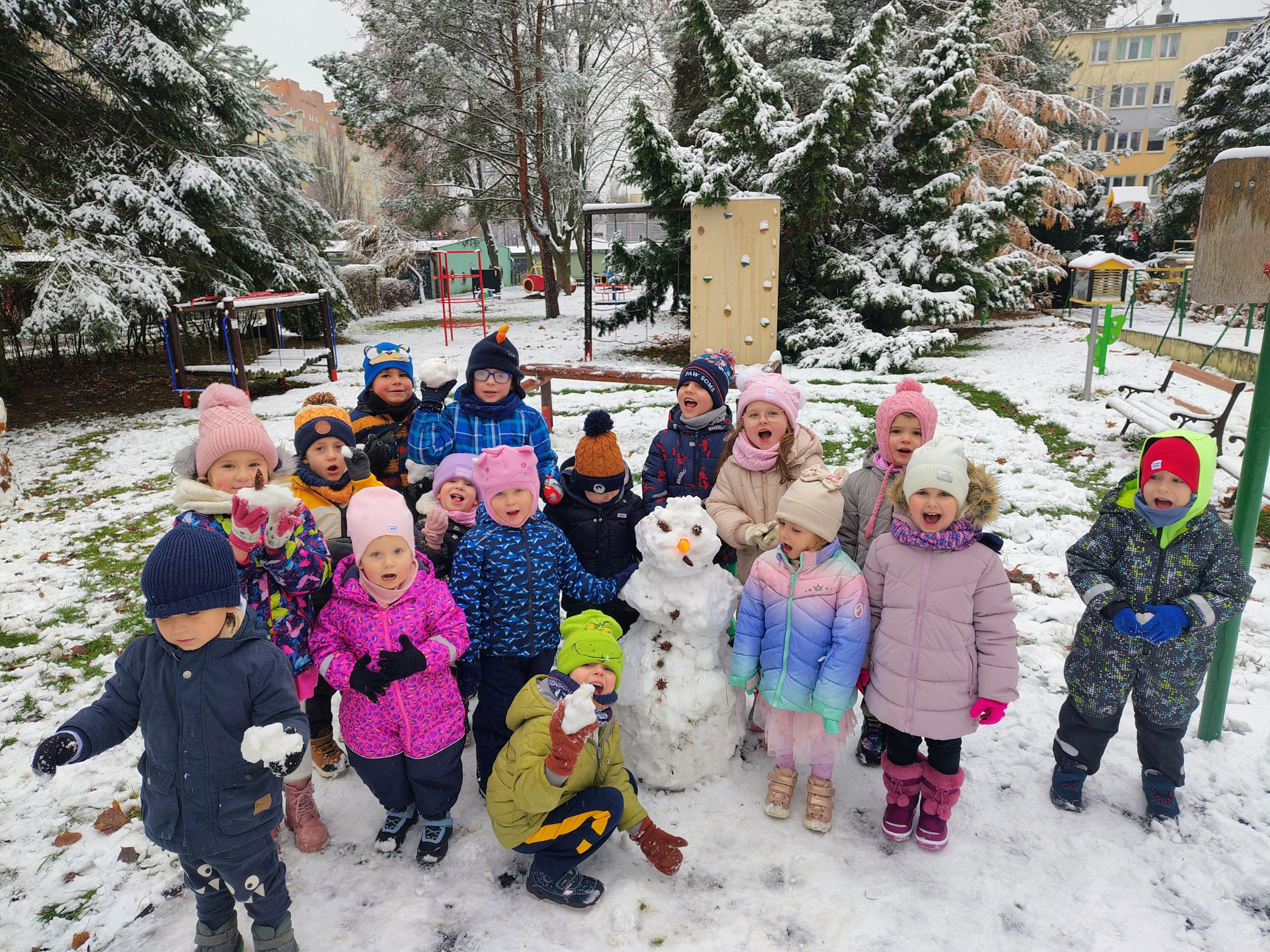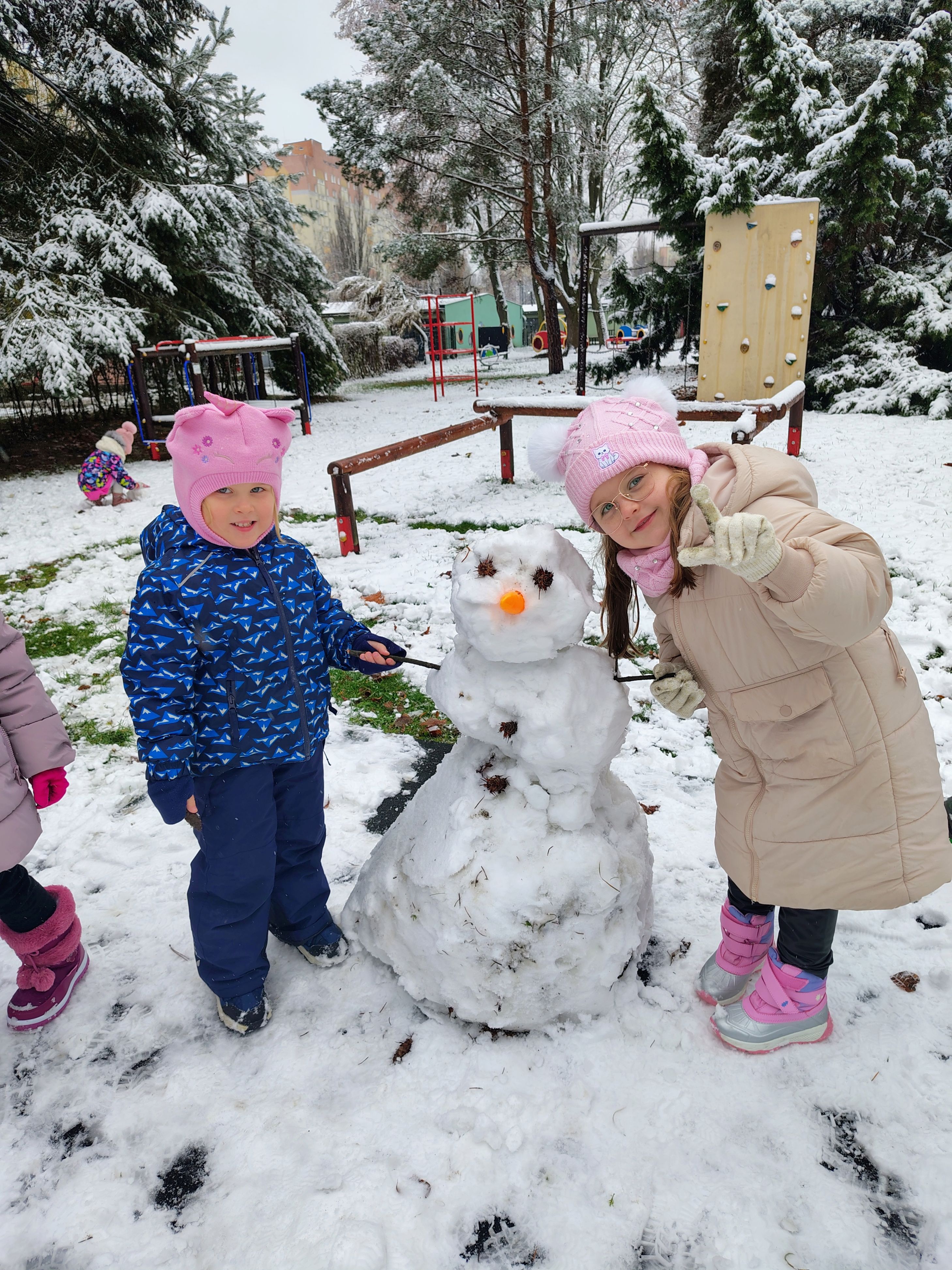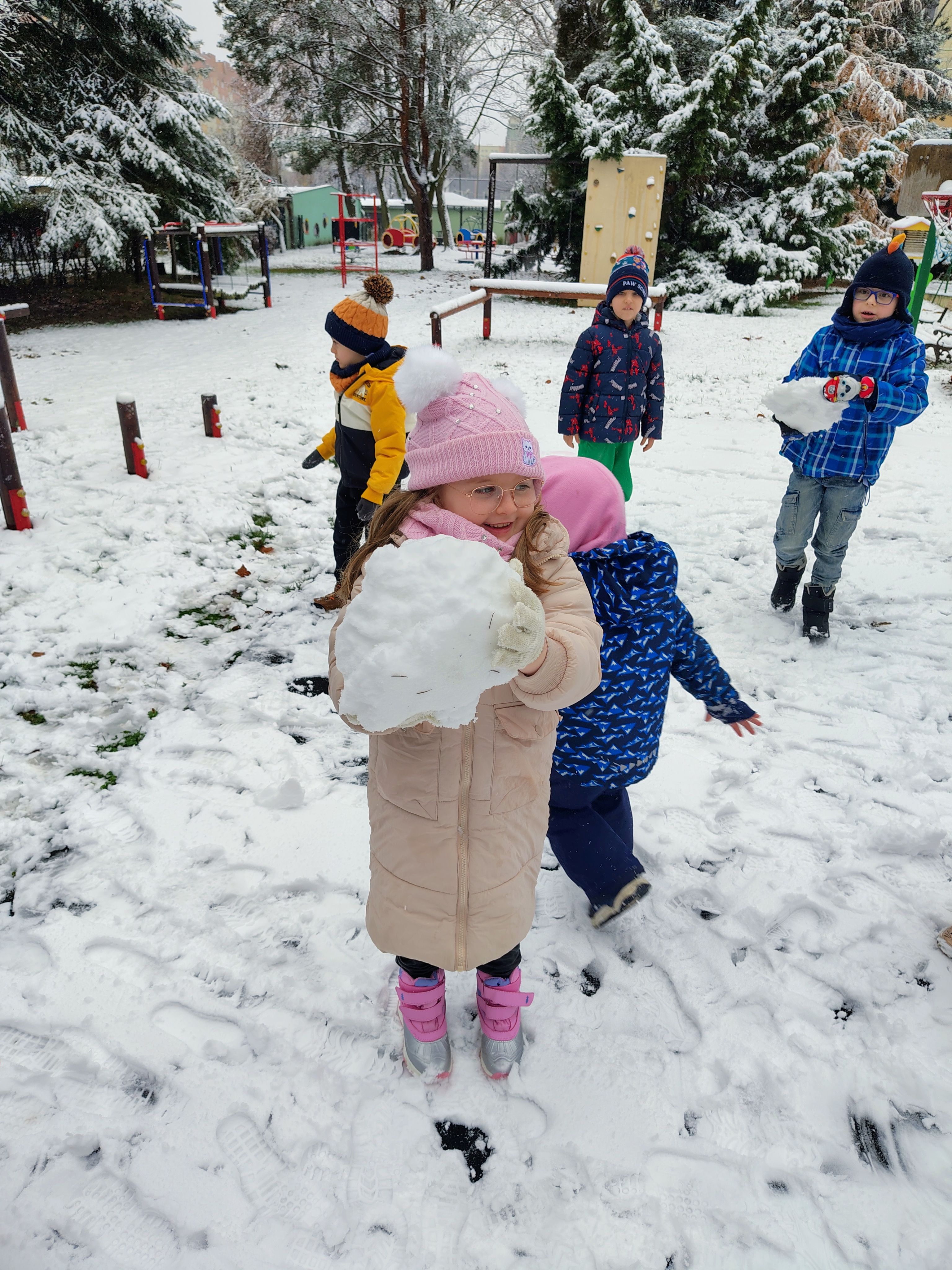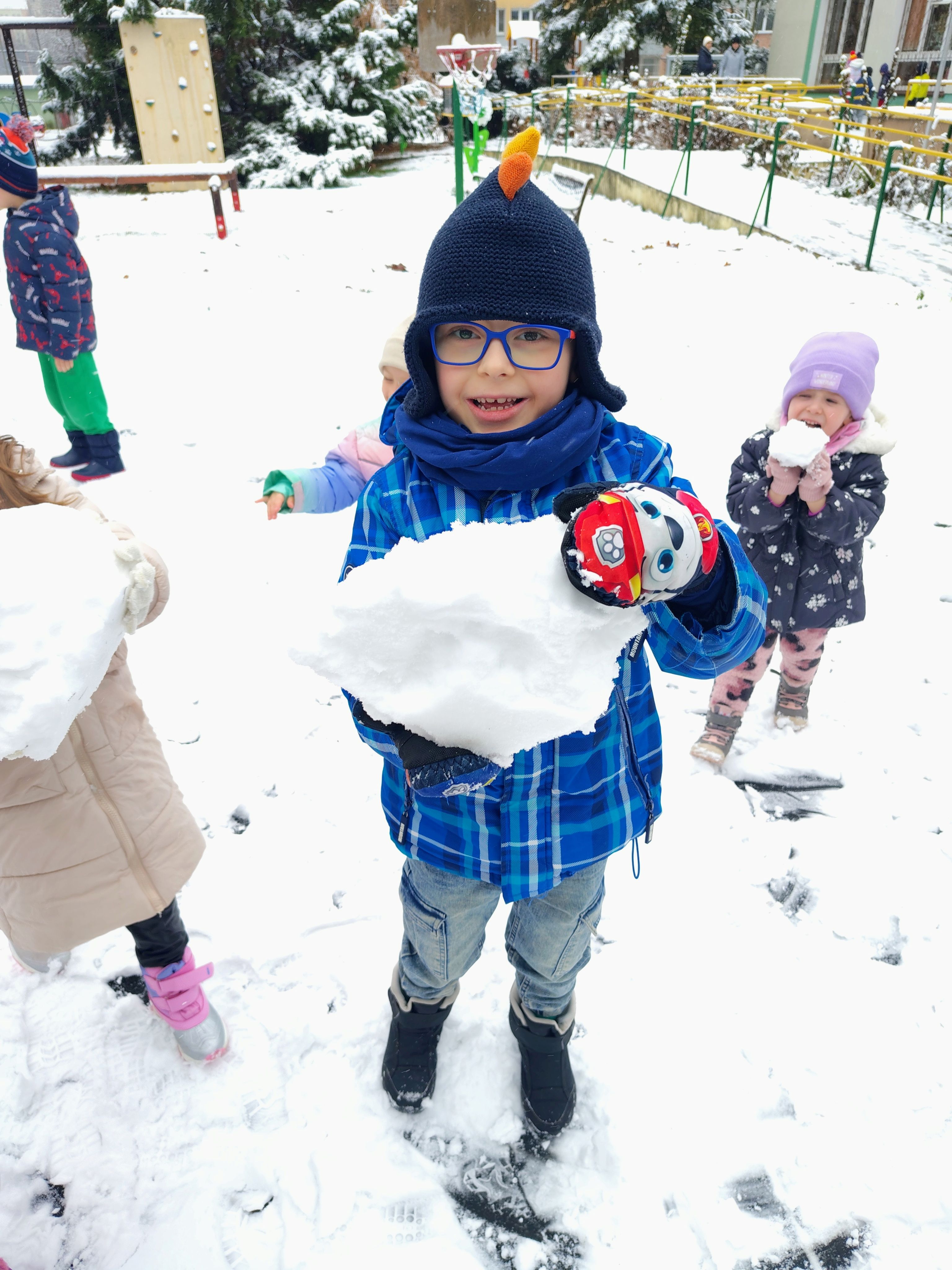 Jesienną porą dzieci mogły cieszyć się pierwszym śniegiem. Przedszkolaki z radością bawiły się na świeżym powietrzu, a oczywiście nie mogło zabraknąć lepienia bałwana! To był pełen uśmiechu i zimowej radości dzień.