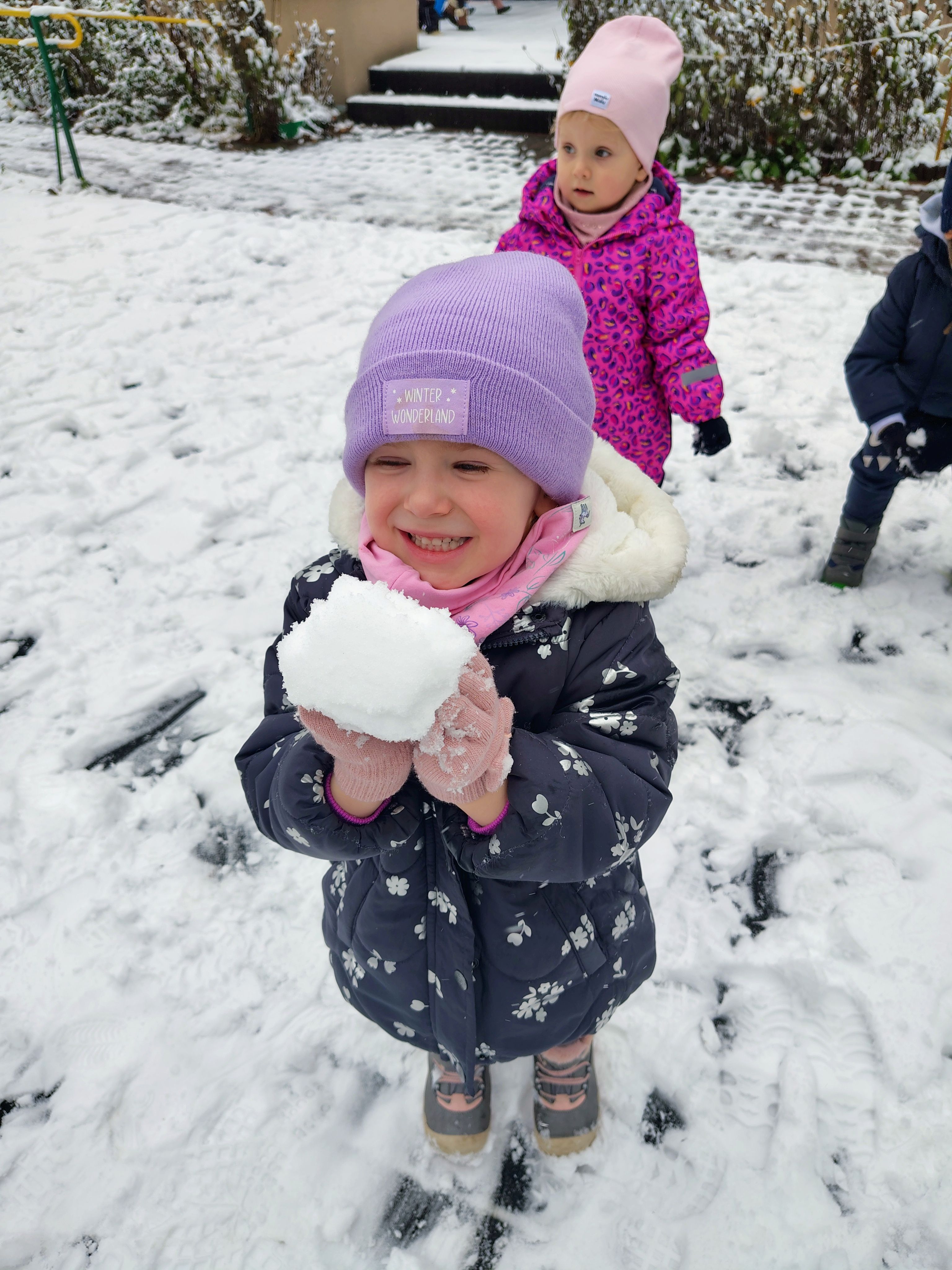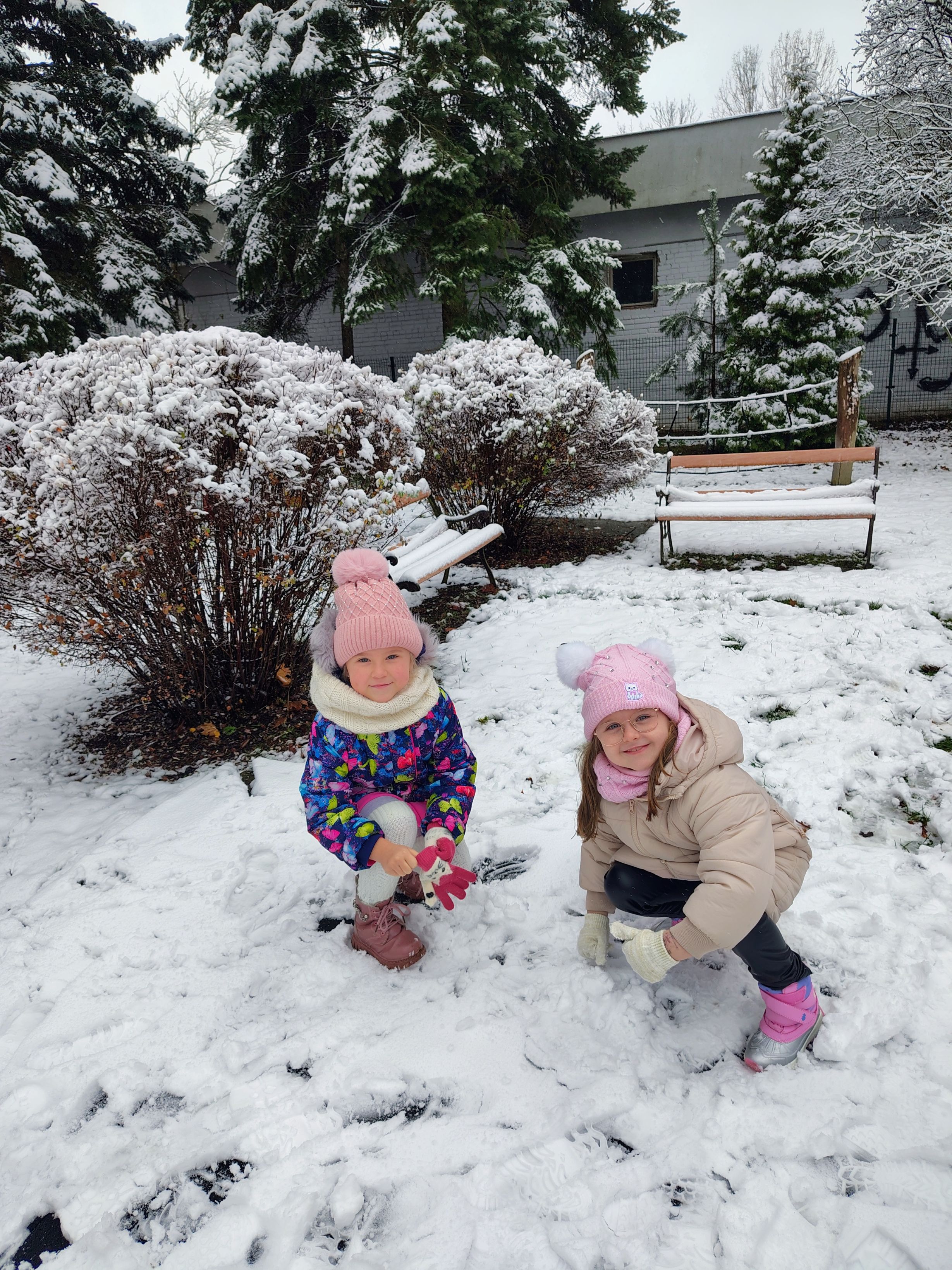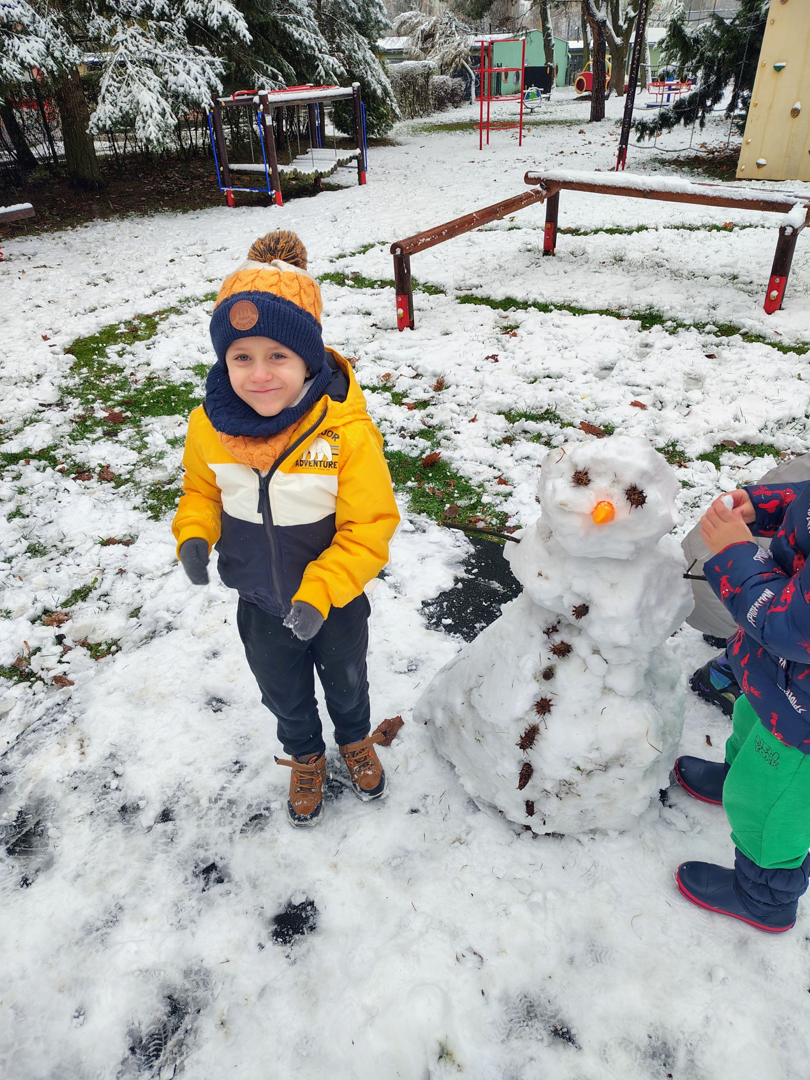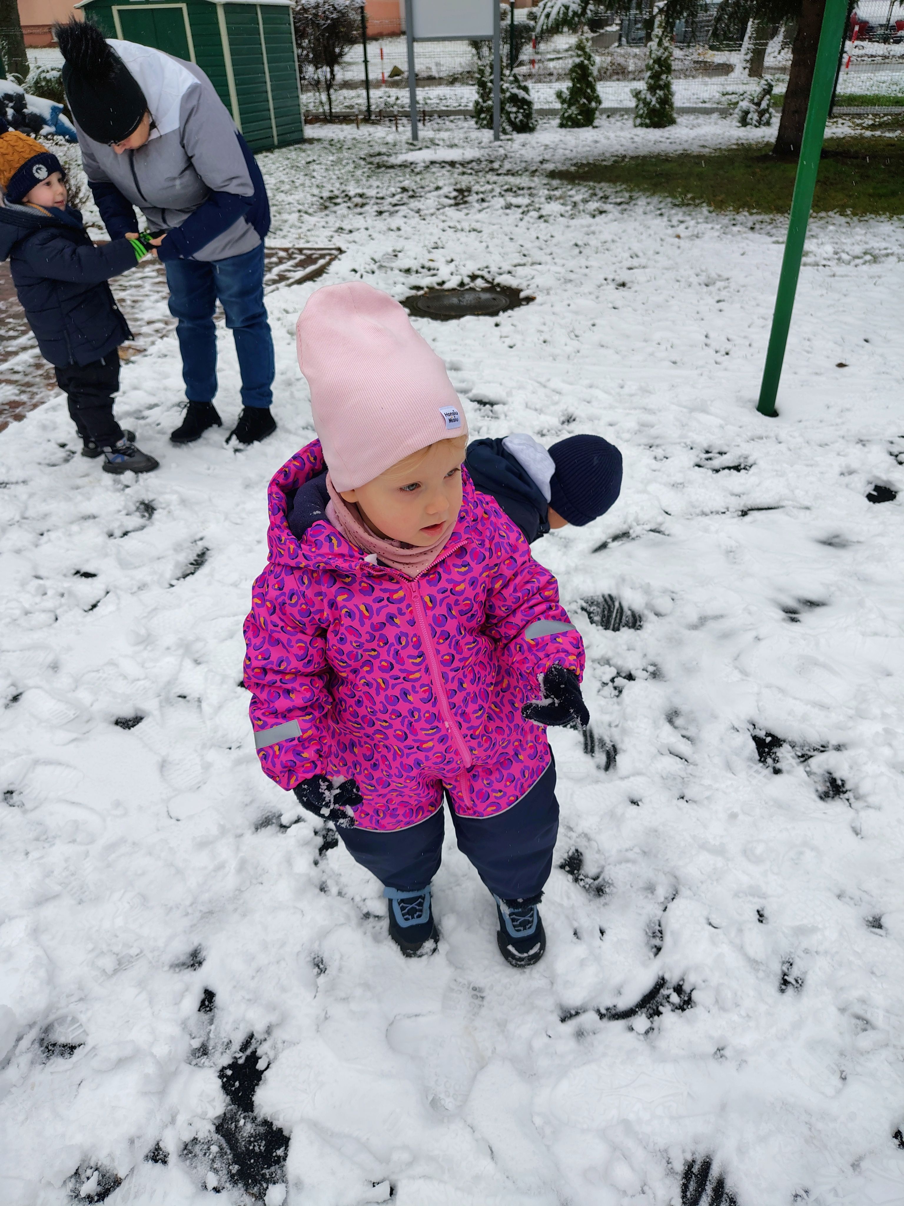 Jesienną porą dzieci mogły cieszyć się pierwszym śniegiem. Przedszkolaki z radością bawiły się na świeżym powietrzu, a oczywiście nie mogło zabraknąć lepienia bałwana! To był pełen uśmiechu i zimowej radości dzień.