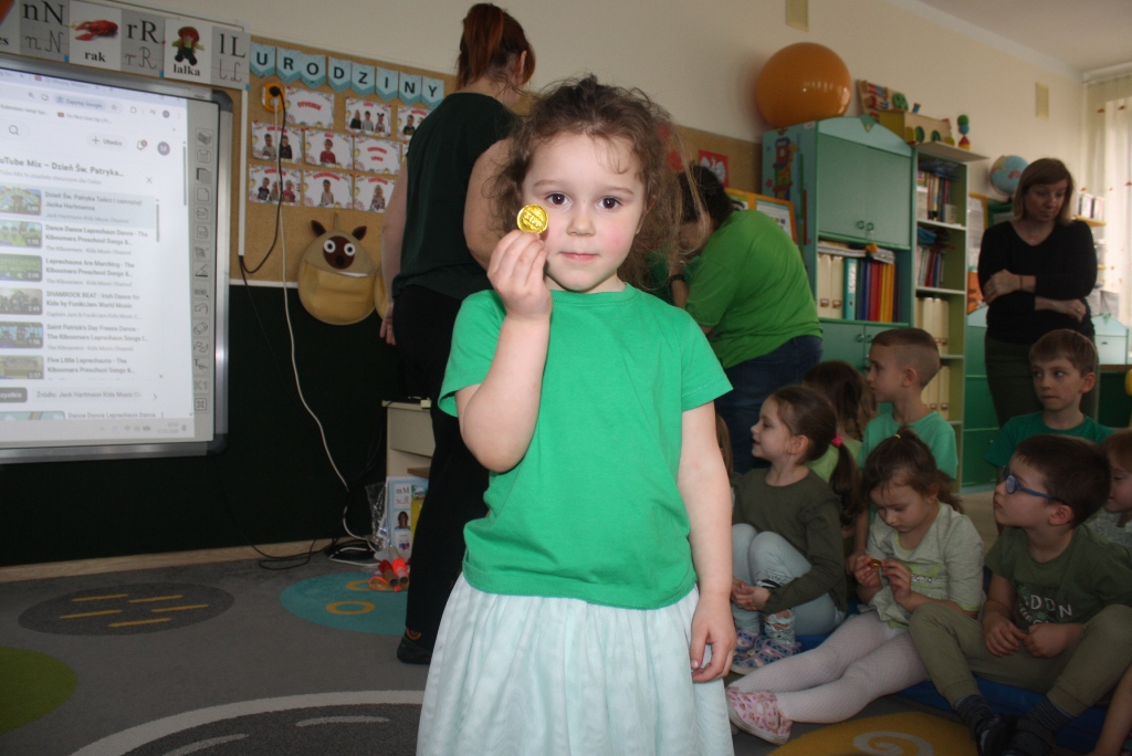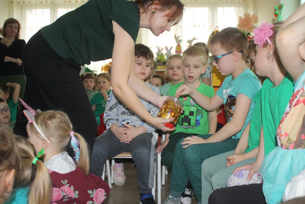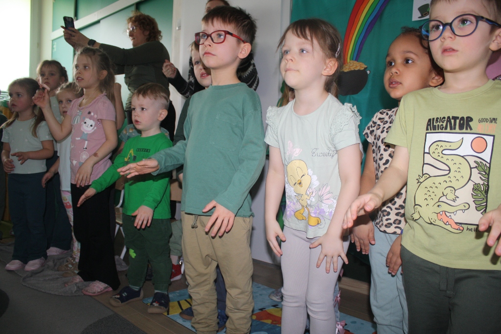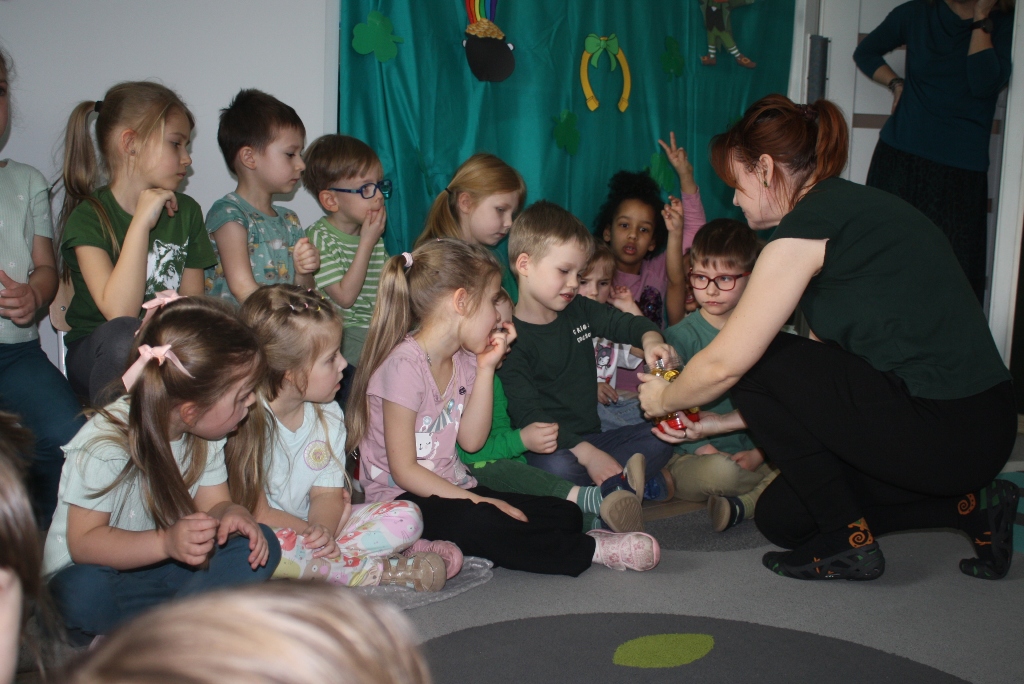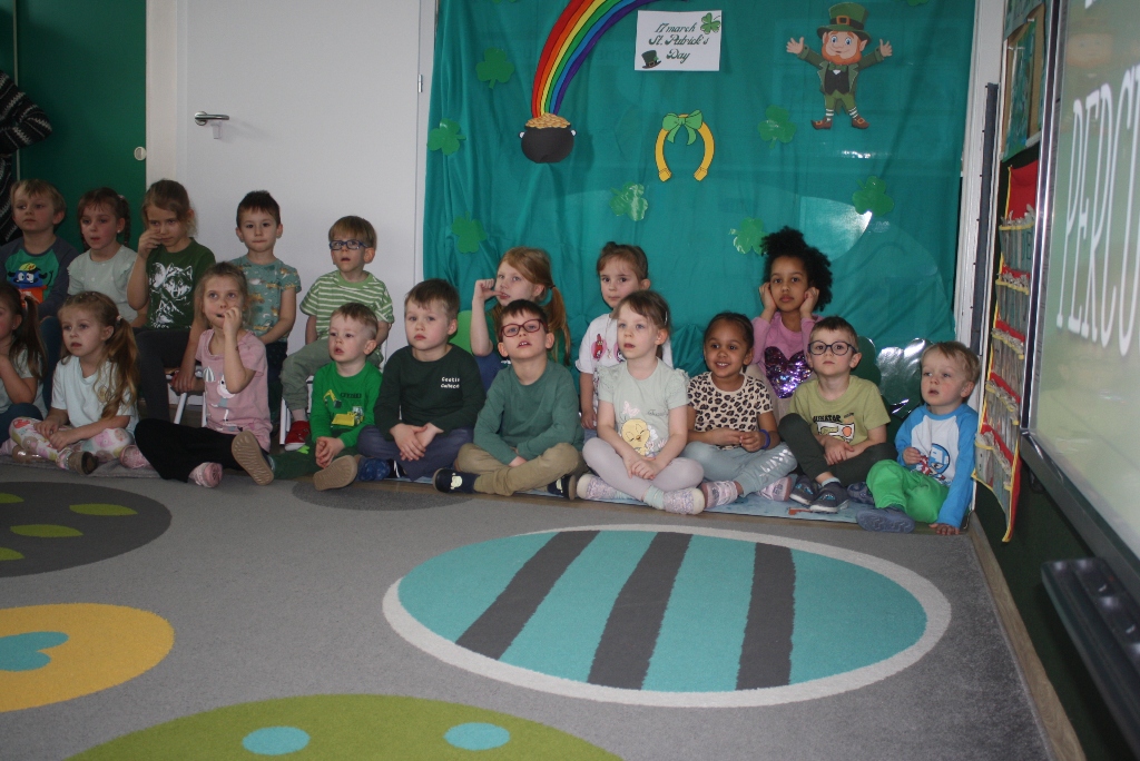 Dzień Św. Patryka w przedszkolu to radosna, zielona impreza celebrująca irlandzką kulturę. Dzieci poznały legendę o św. Patryku, a także dowiedziały się, co czeka na nas po drugiej stronie tęczy. Były tańce, zagadki i konkurencje, w których oczywiście dominował kolor zielony. Każdy znalazł też złotą monetę, która ukryła się w wielkim garncu skrzata Leperchauna.