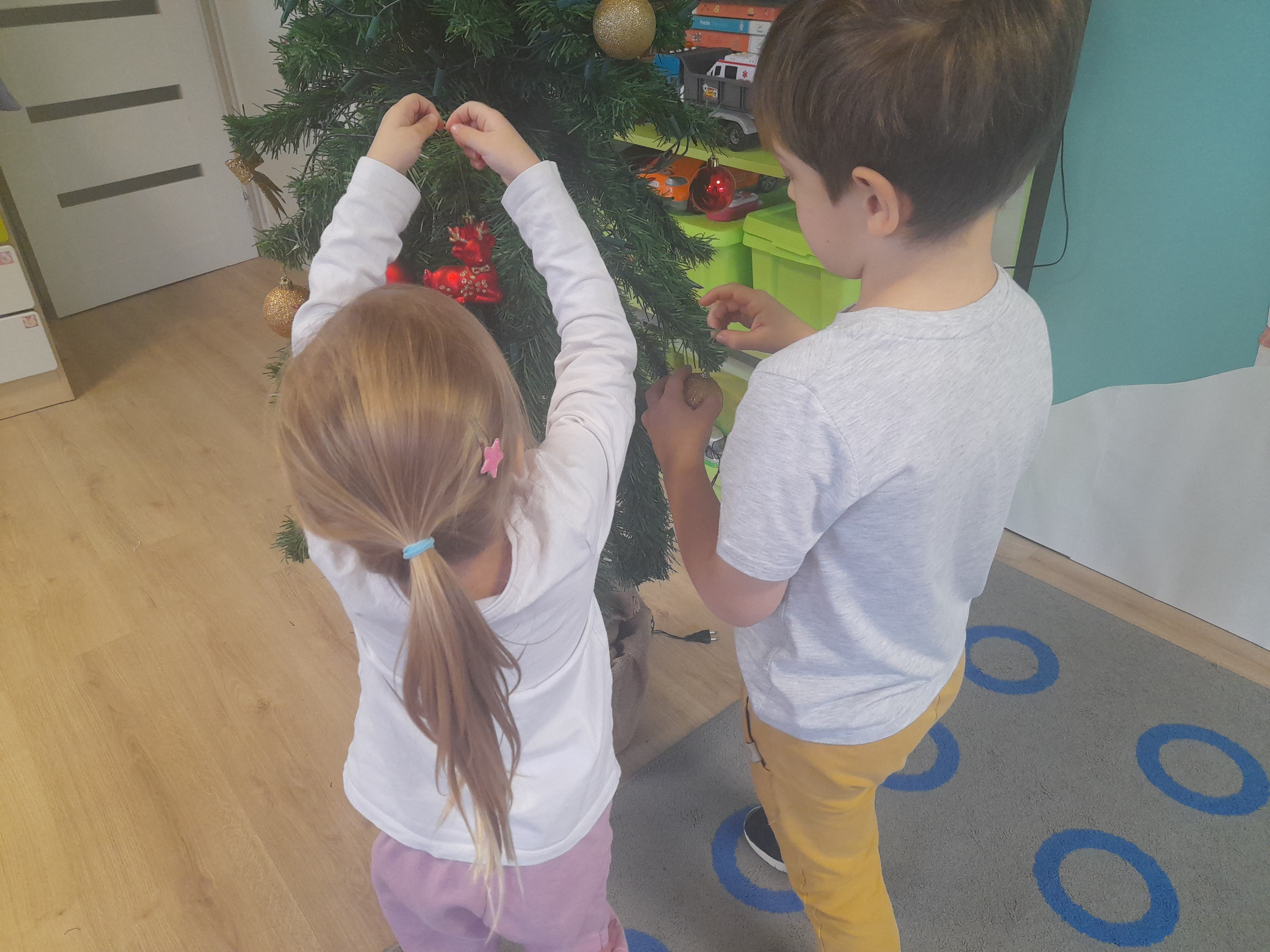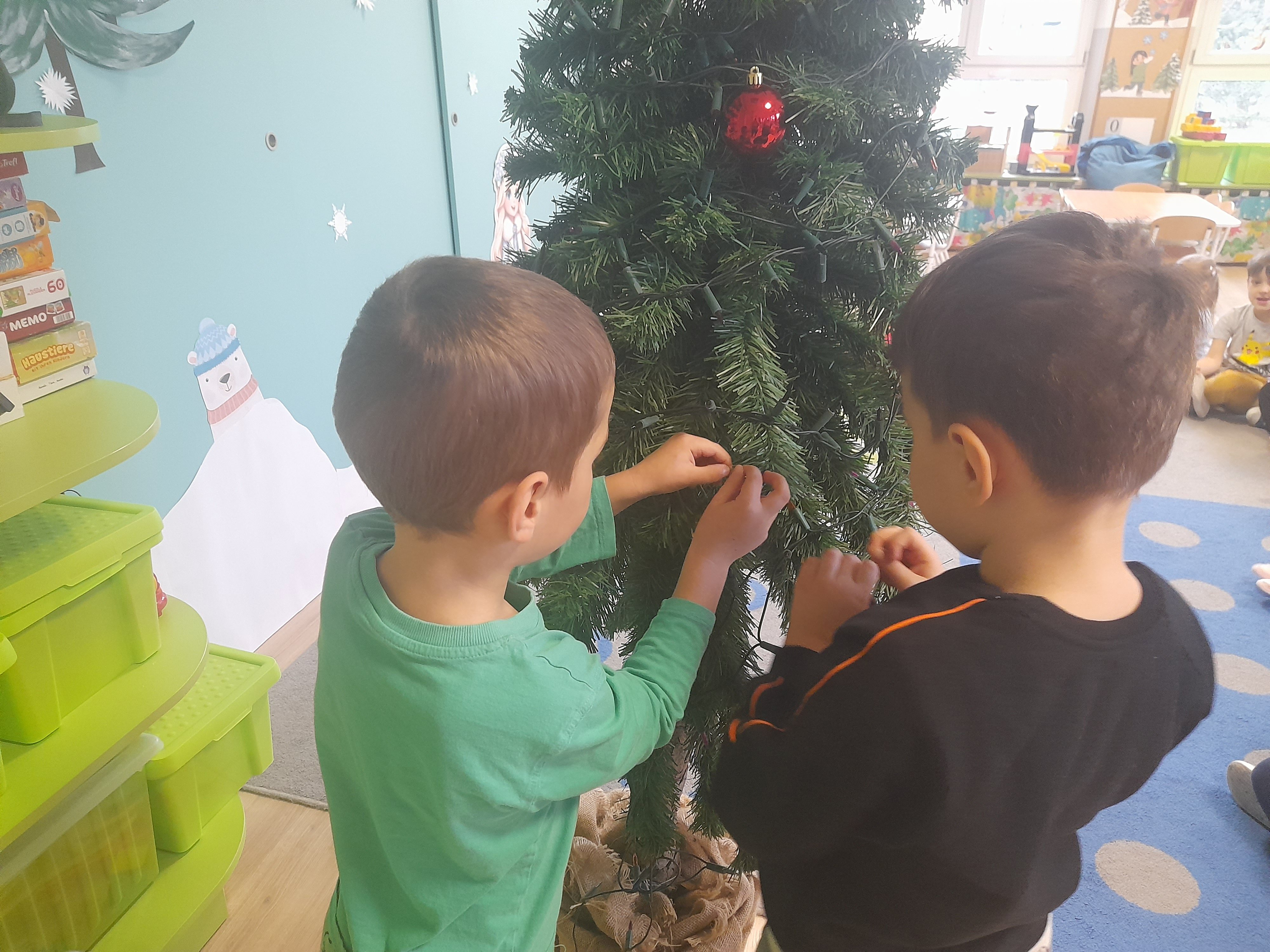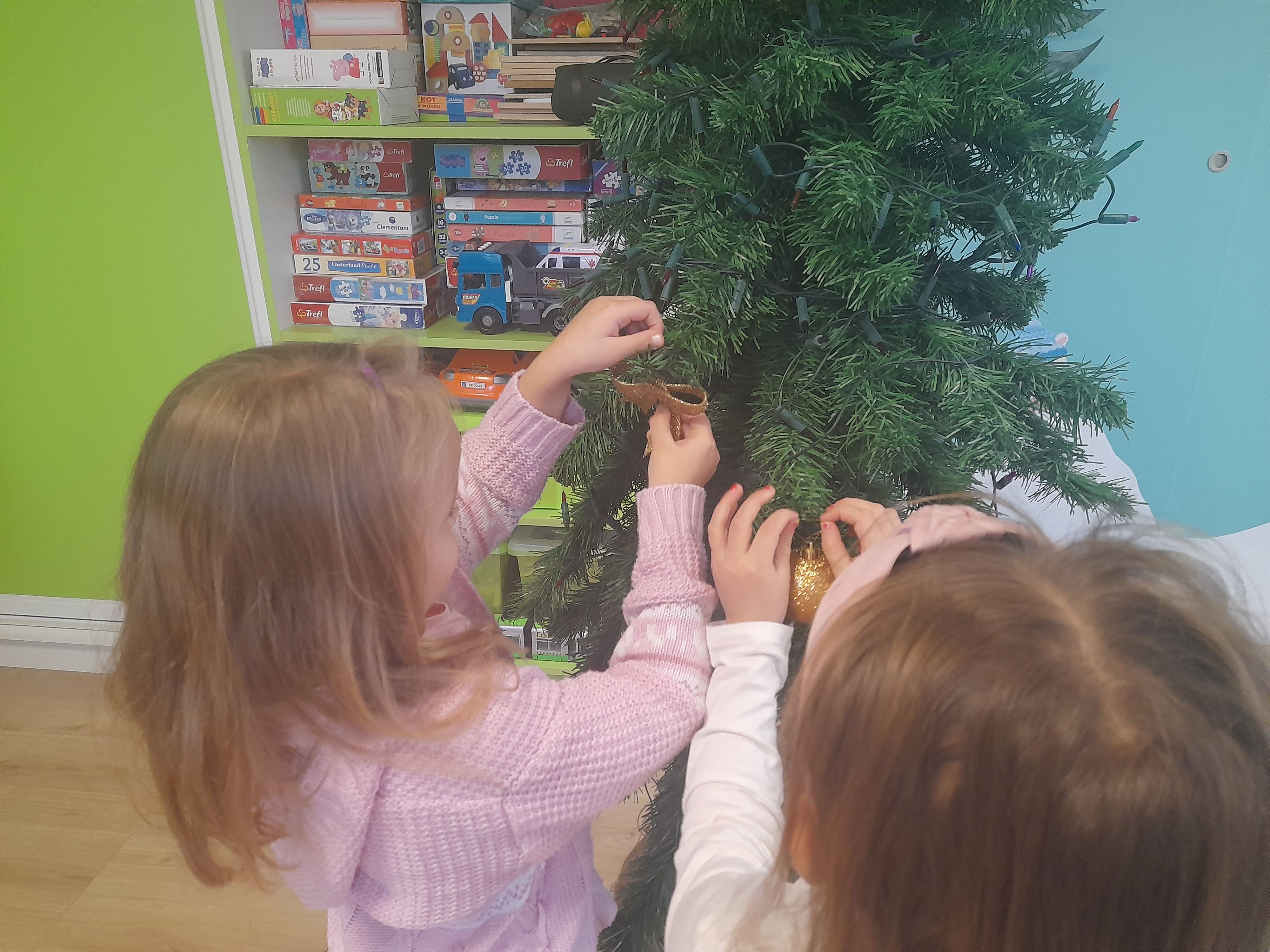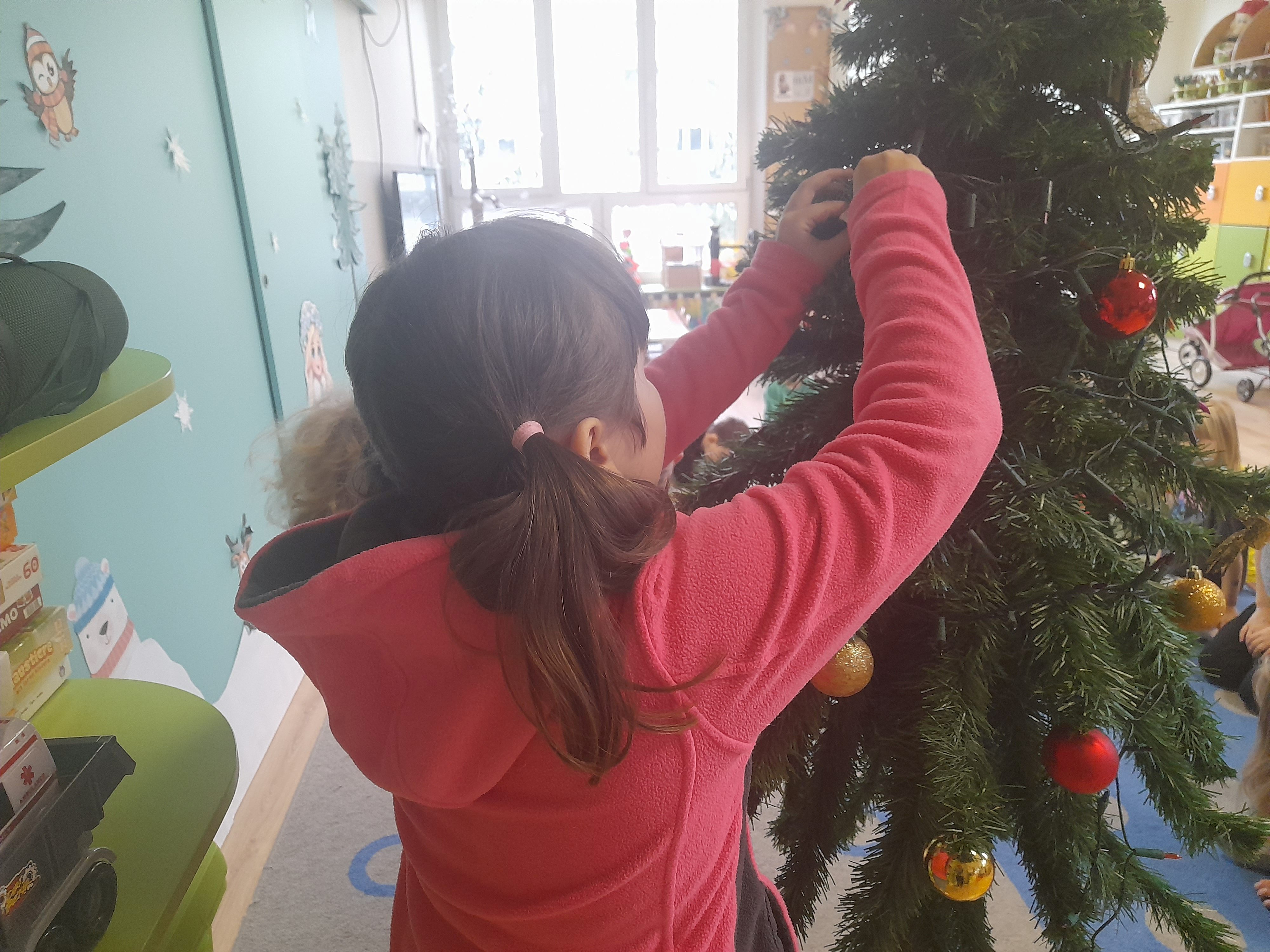 Przedszkolaki z grupy 5 poczuły atmosferę zbliżających się Świąt Bożego Narodzenia i razem z nauczycielkami ubrały grupową choinkę. Dzieci miały przy tym wiele radości i w sali od razu zrobiło się tak klimatycznie i świątecznie.