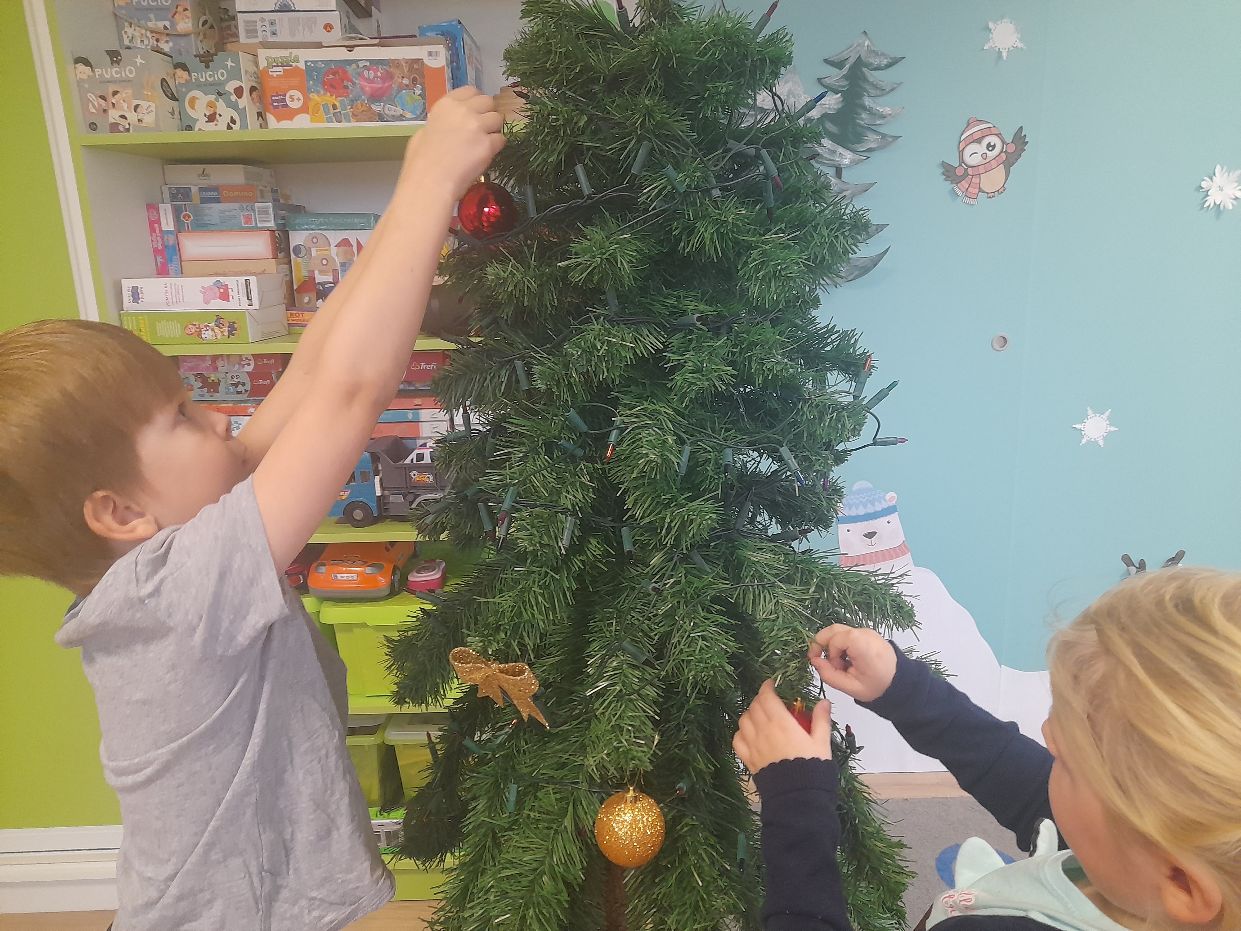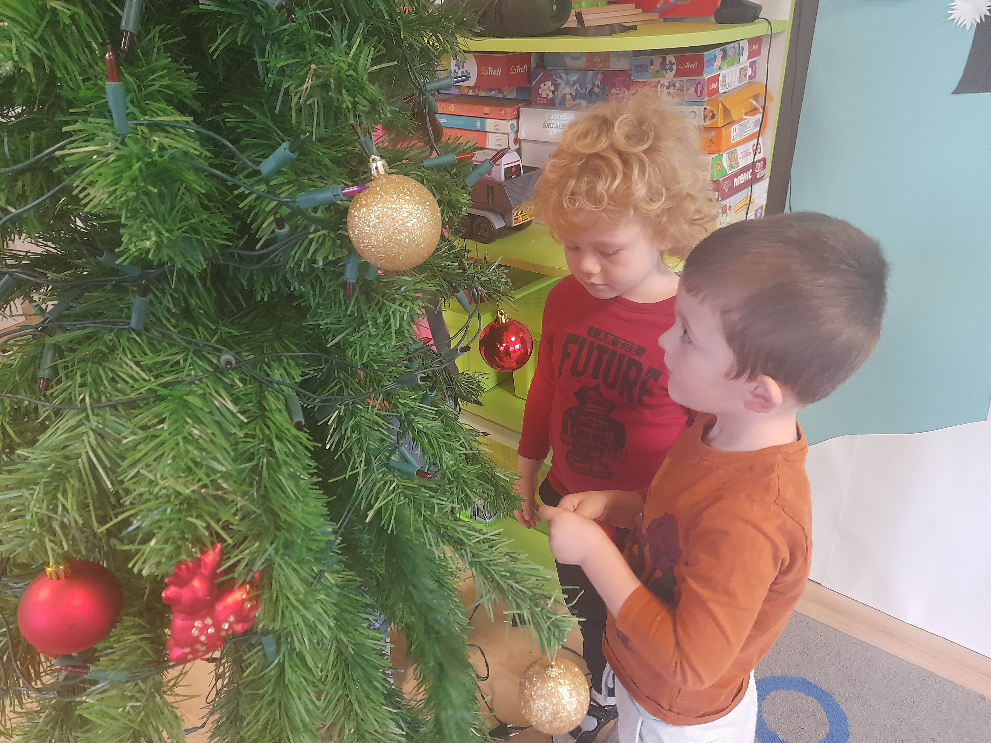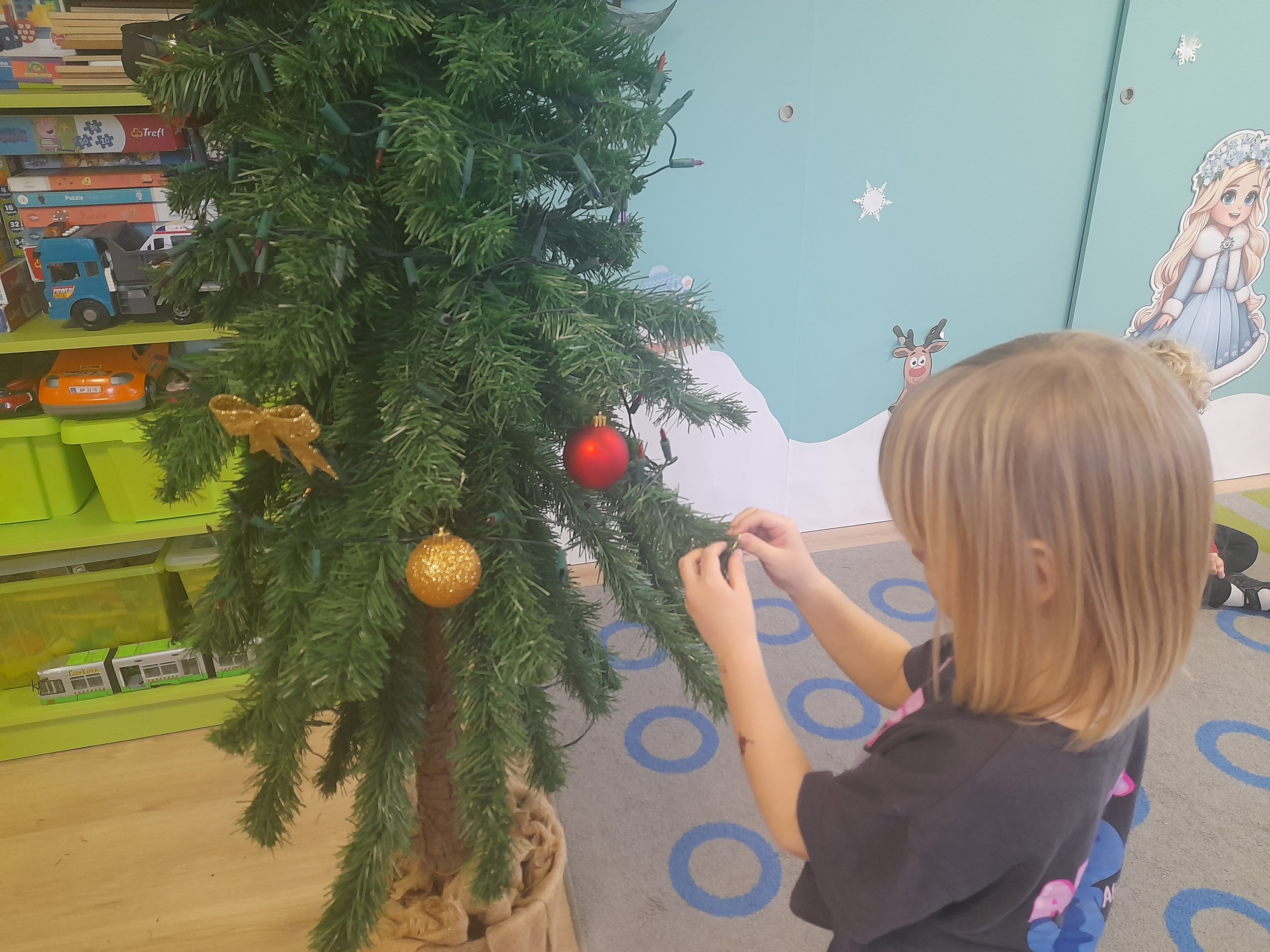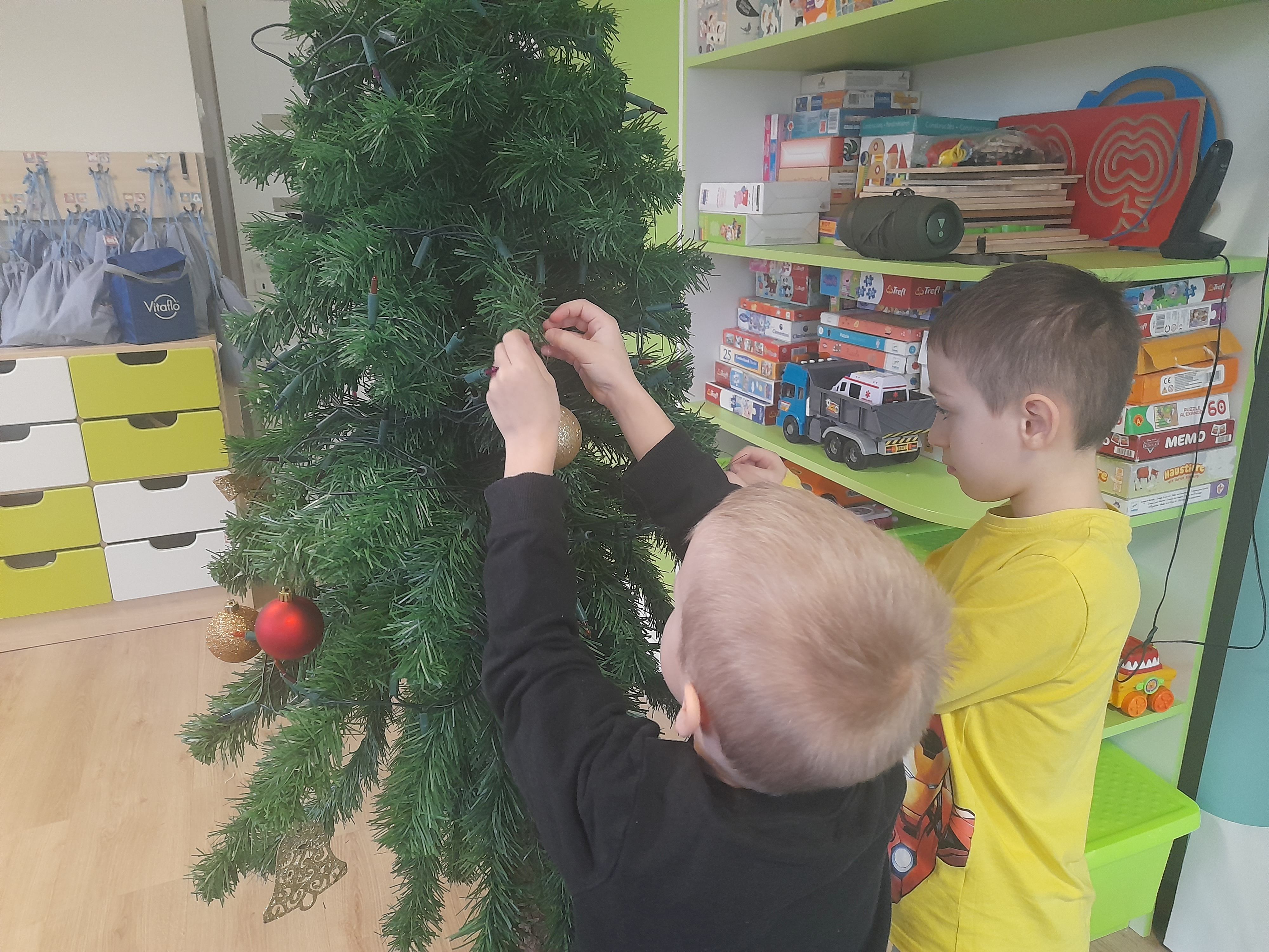 Przedszkolaki z grupy 5 poczuły atmosferę zbliżających się Świąt Bożego Narodzenia i razem z nauczycielkami ubrały grupową choinkę. Dzieci miały przy tym wiele radości i w sali od razu zrobiło się tak klimatycznie i świątecznie.