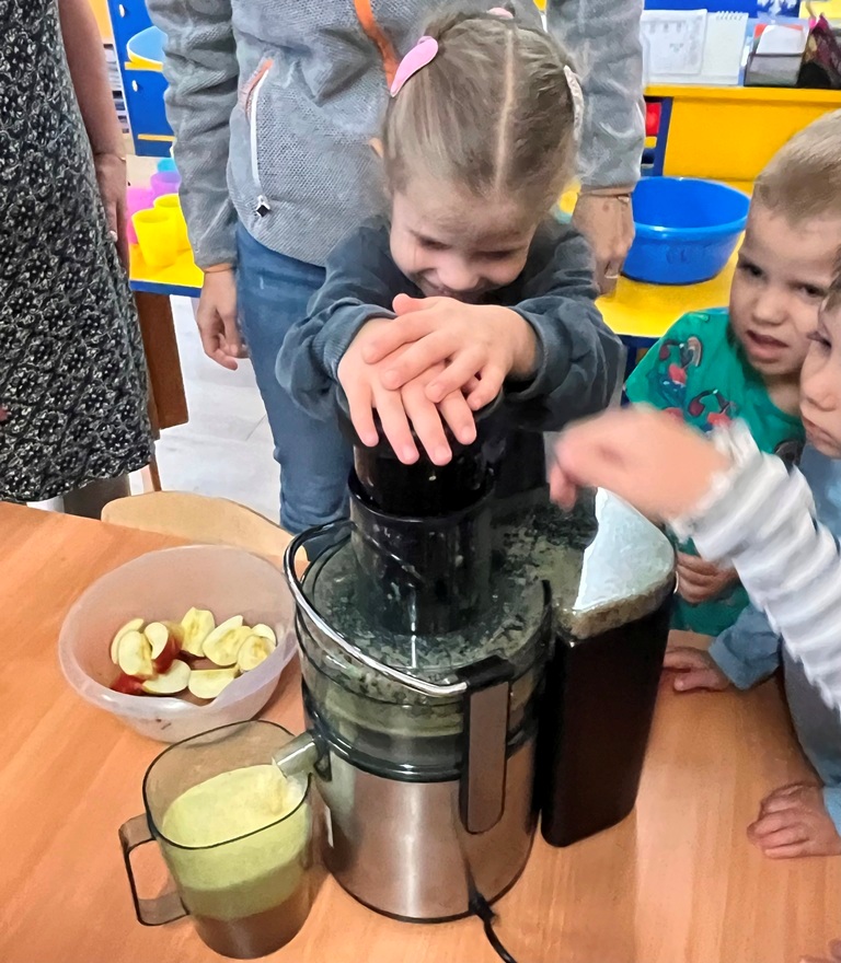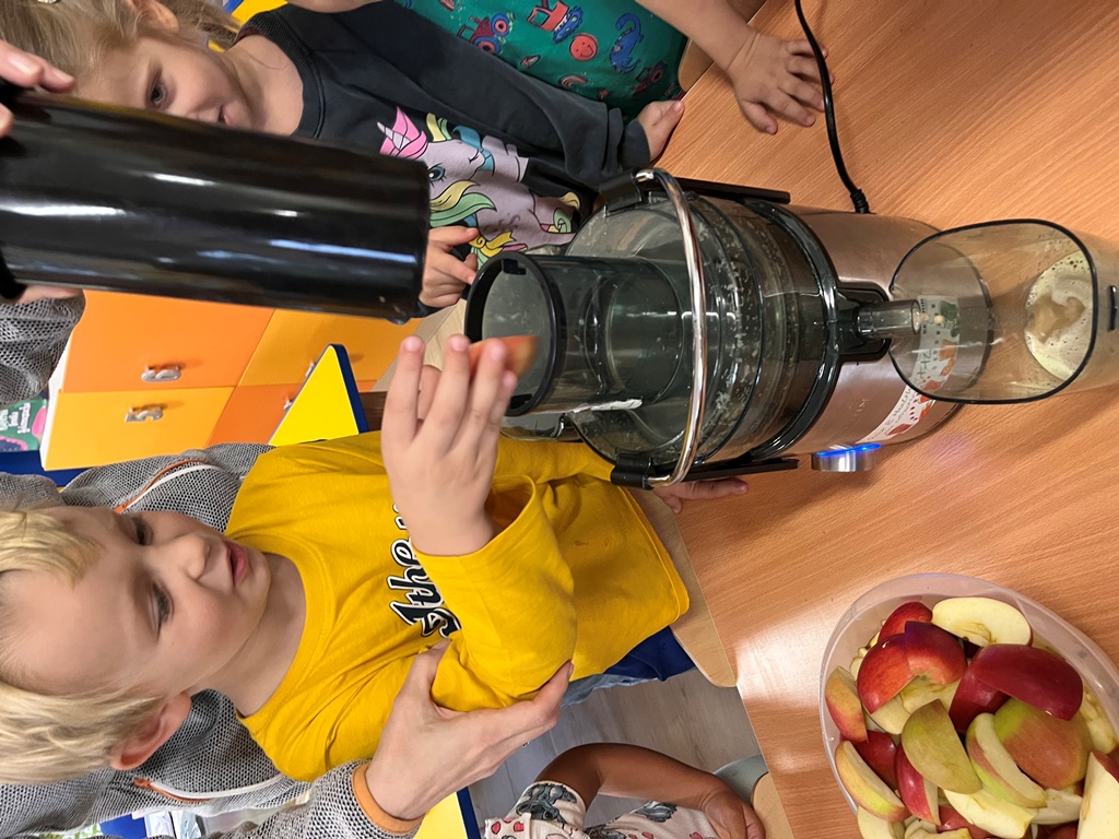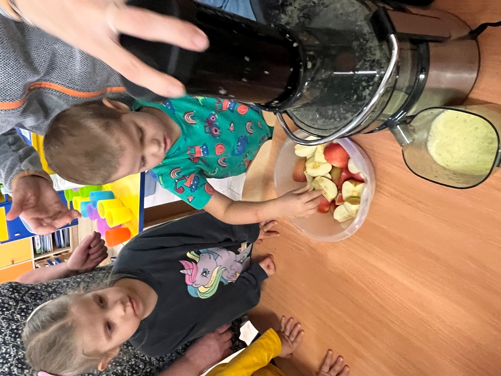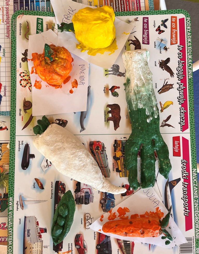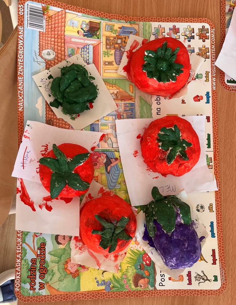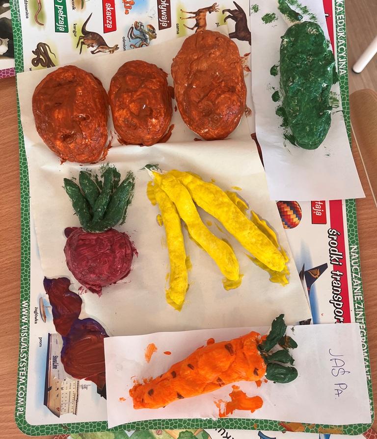 Jesień pełna warzyw i owoców zawitała do nas. Dzieci podczas całego tygodnia poznawały owoce wszystkimi zmysłami- kosztowały, dotykały, piły sok, lepiły, rysowały i zgadywały. Wybrały się na wycieczkę do sklepu i wykonały z masy solnej warzywa, które potem pomalowały.