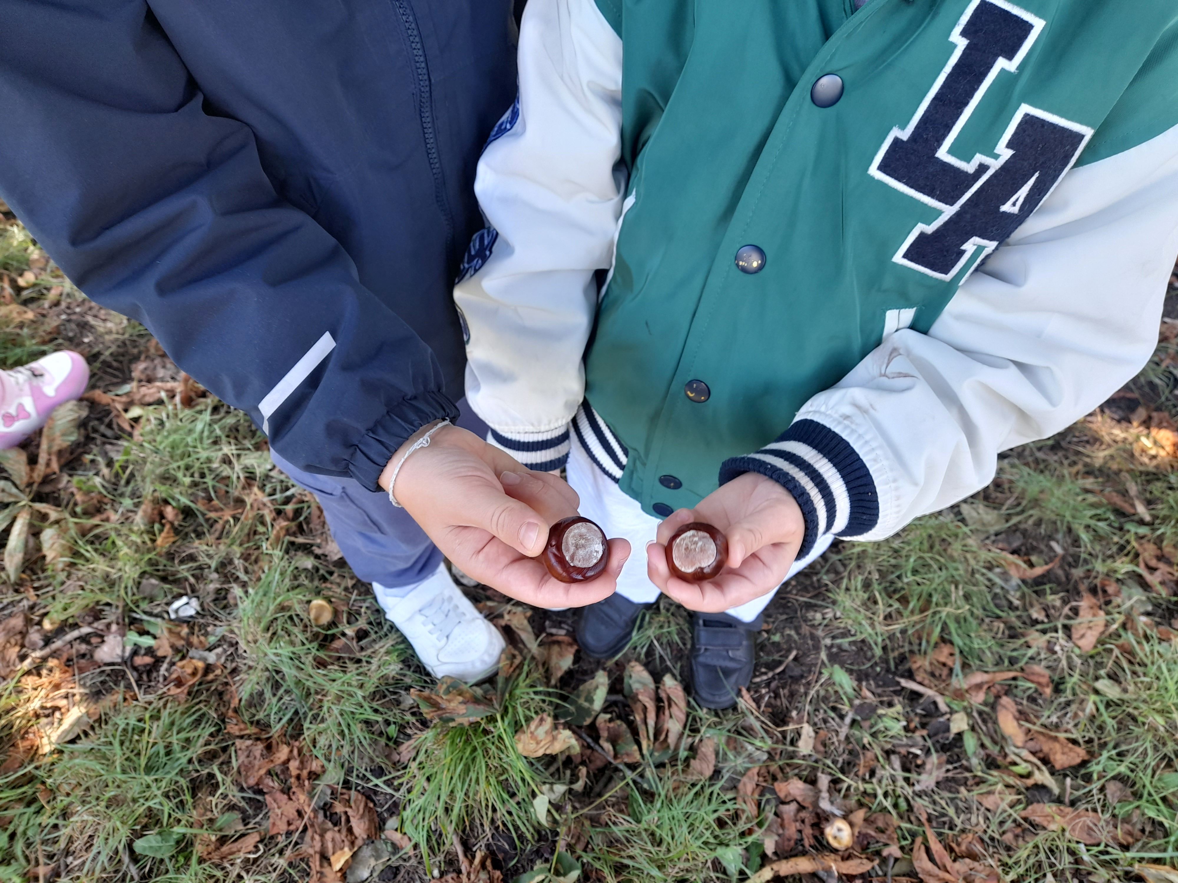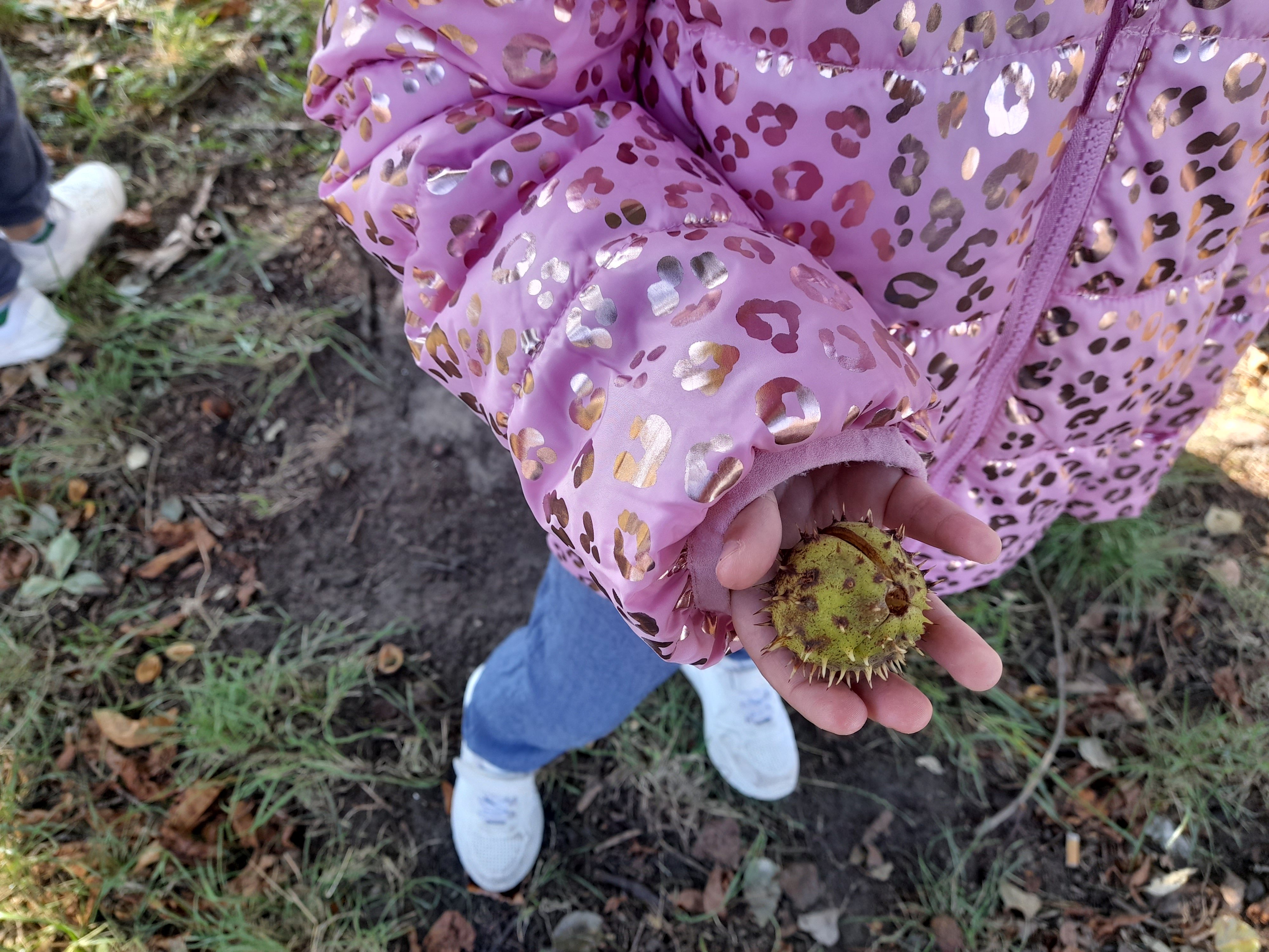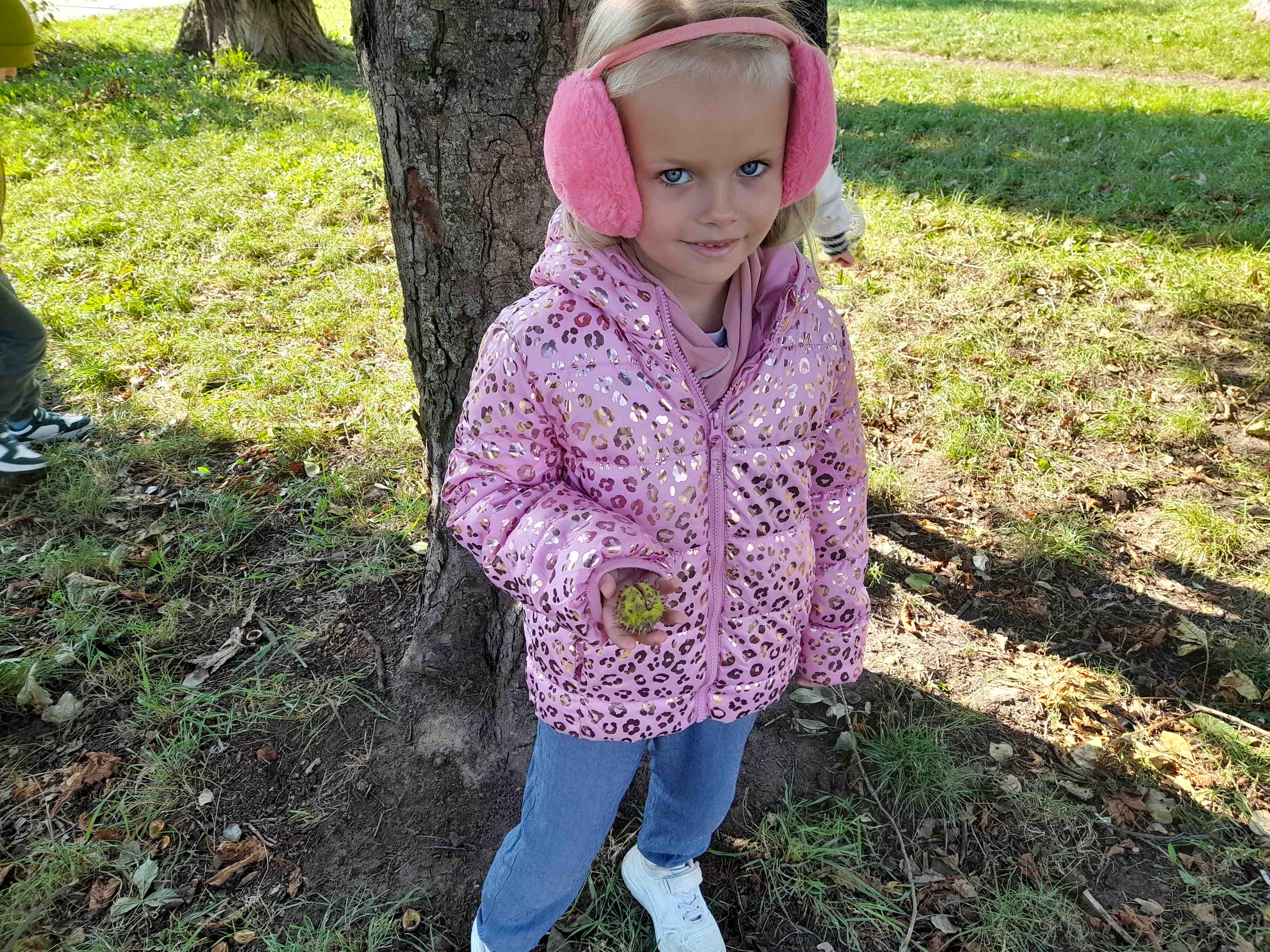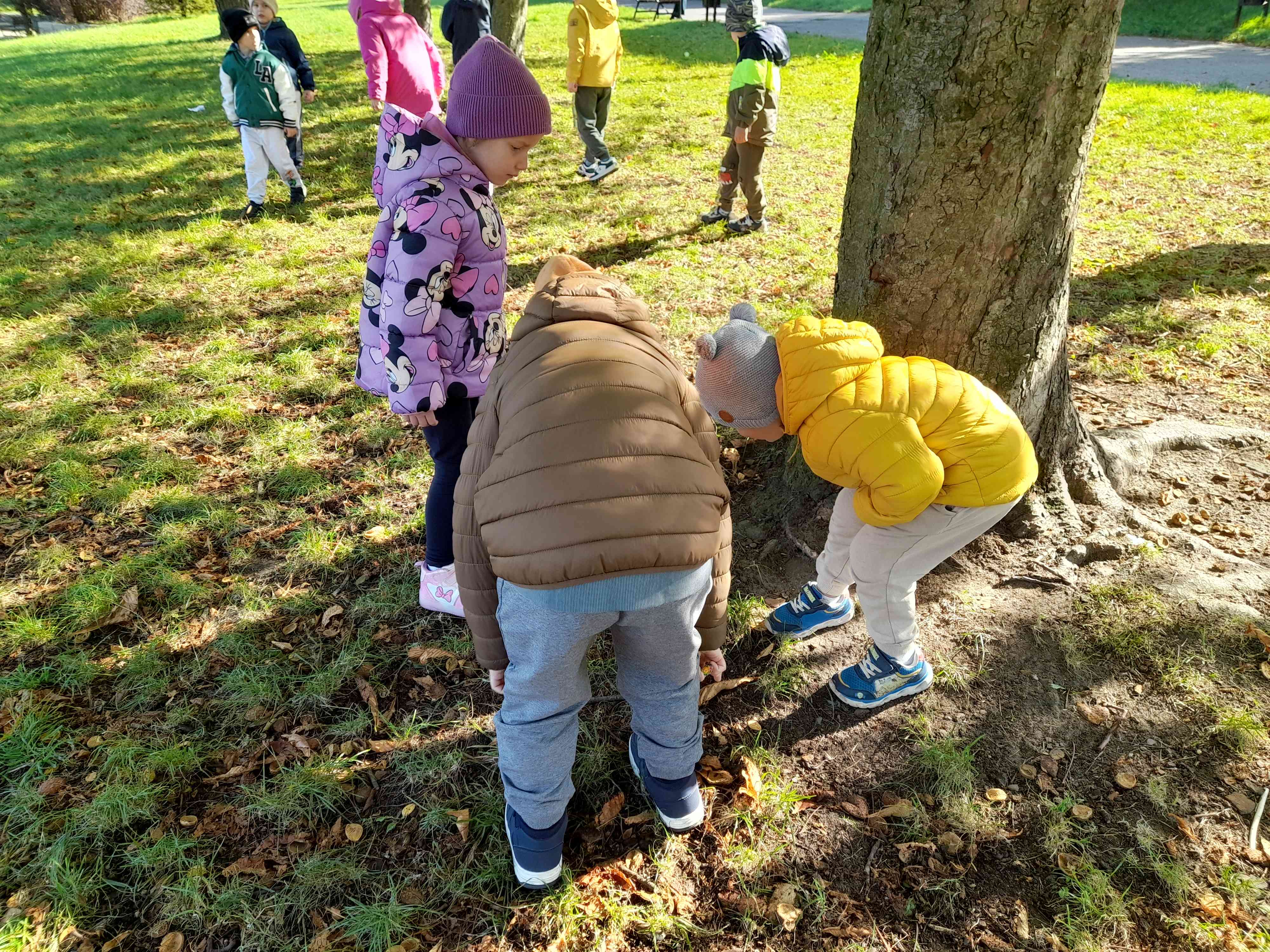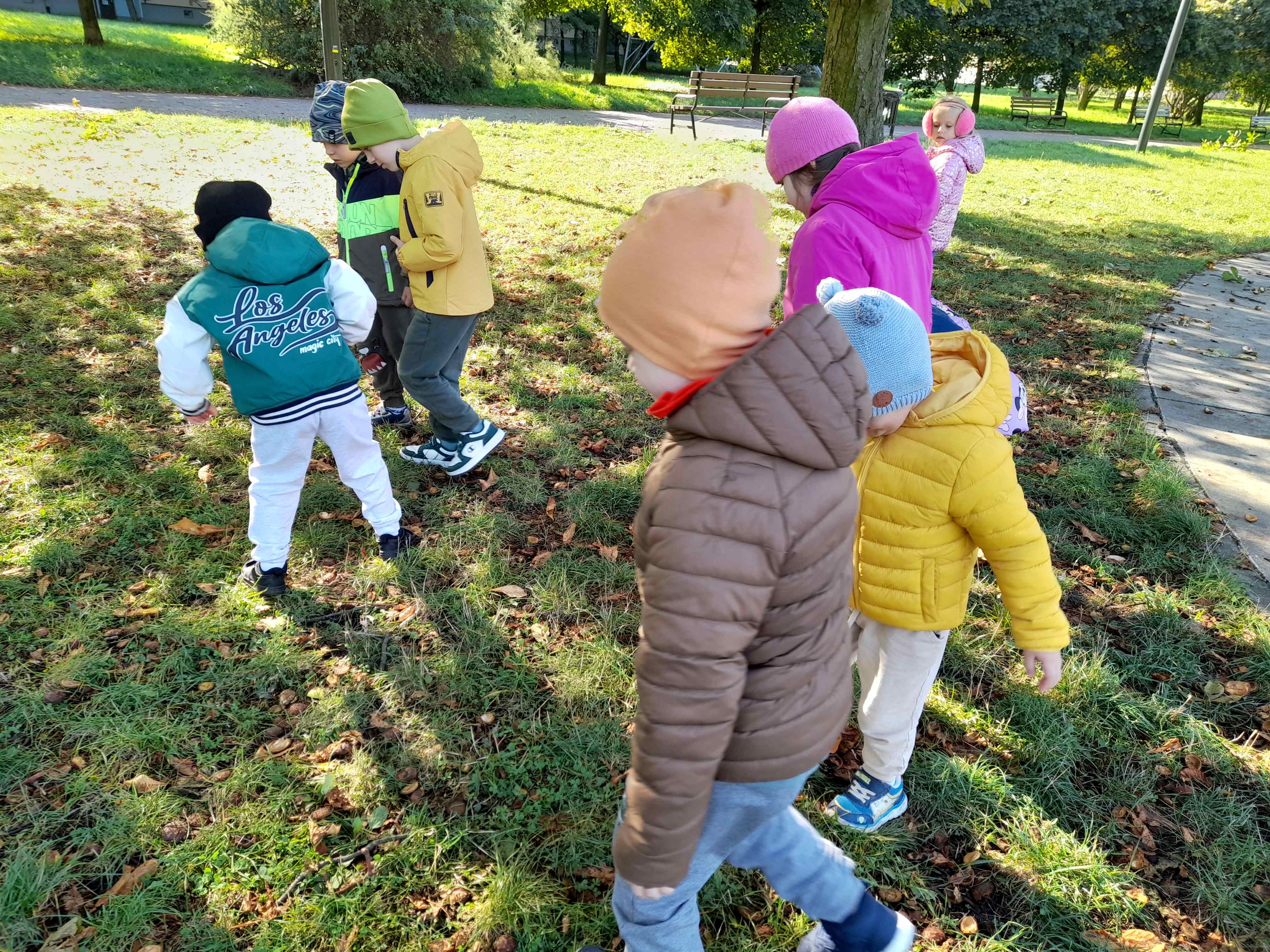 Przedszkolaki z grupy 5 wybrały się do pobliskiego parku "Podolskiego" w poszukiwaniu pierwszych oznak jesieni. Dzieci szukały jesiennych darów natury i udało im się znaleźć kasztany oraz szyszki. Pogoda tego dnia wyjątkowo dopisała podczas spaceru.