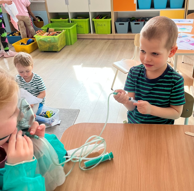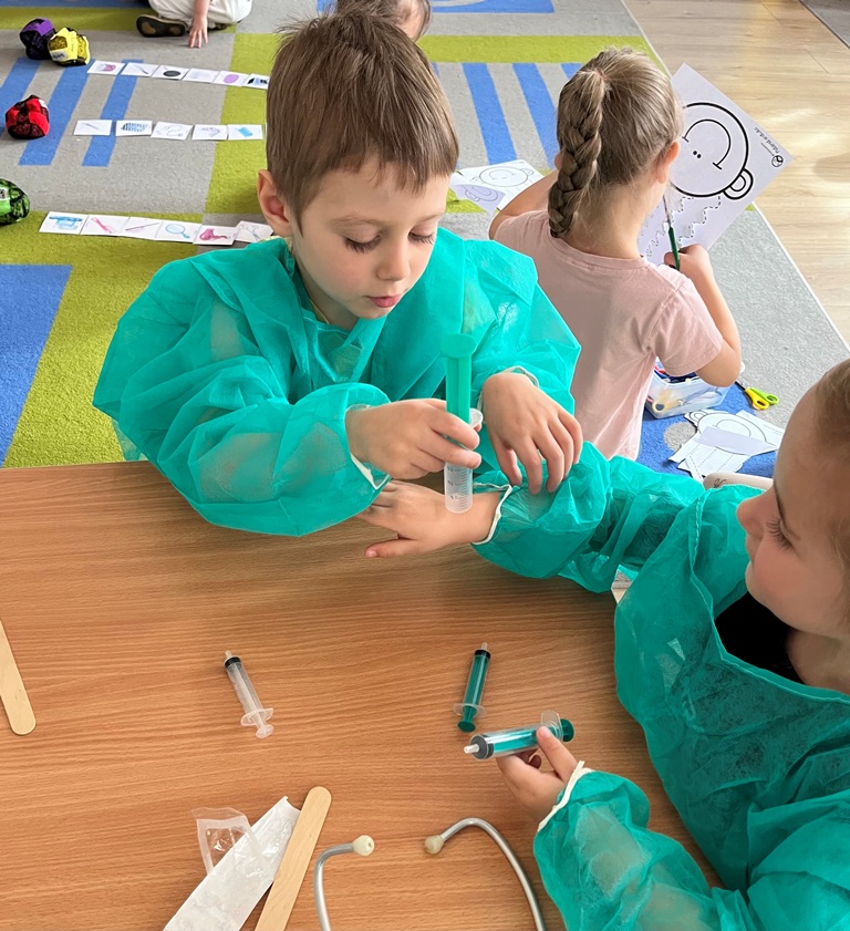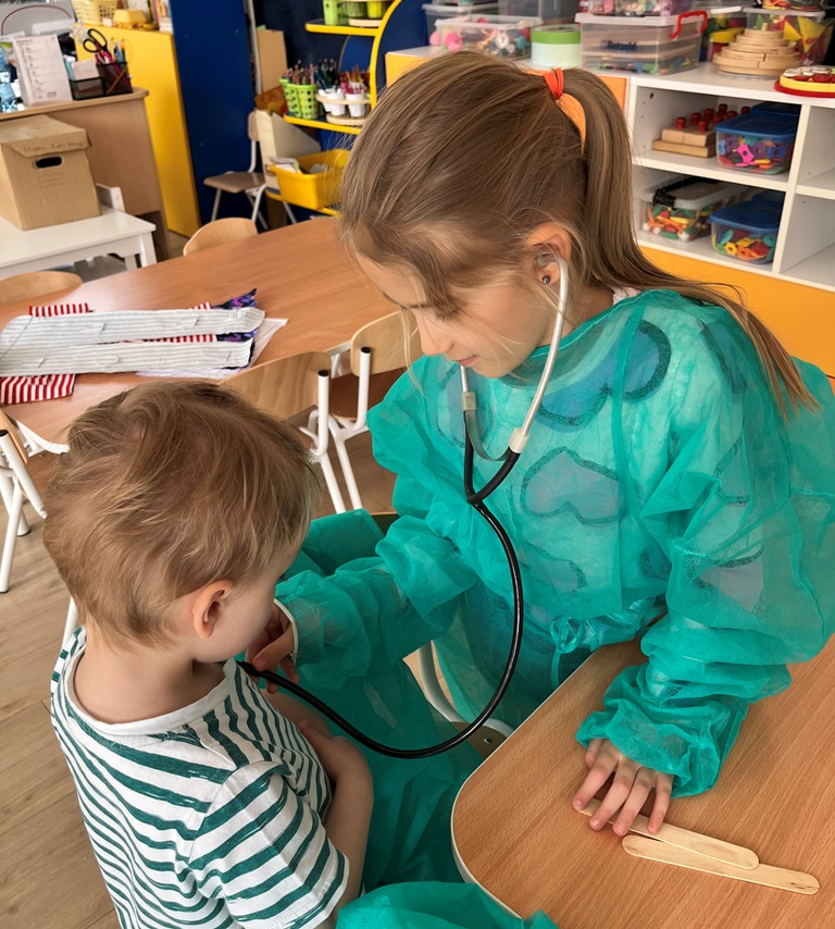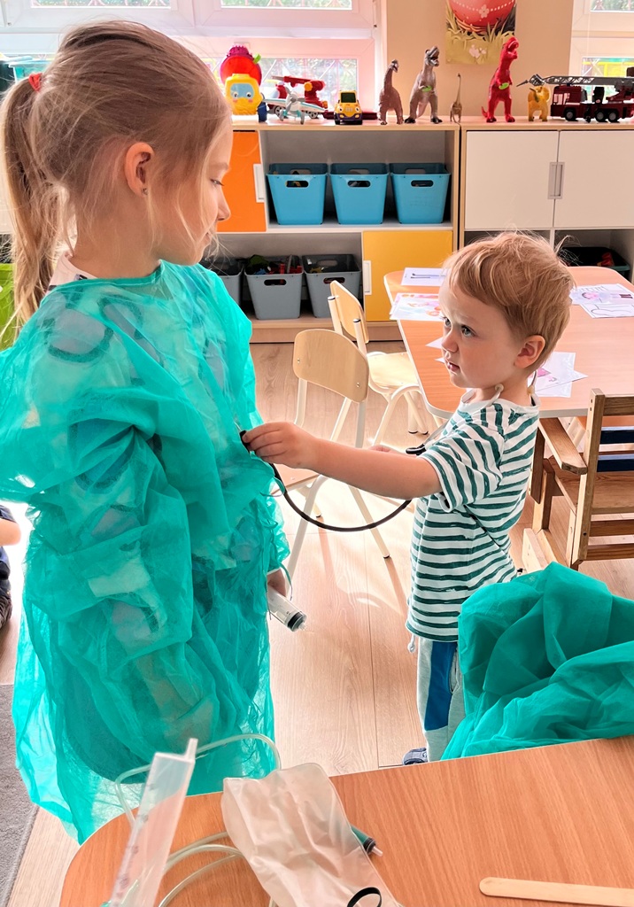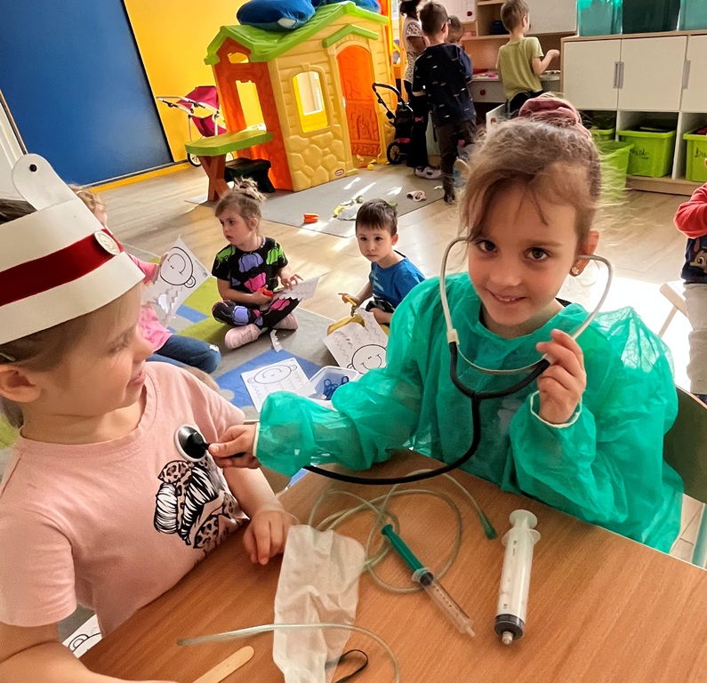 Najlepszym sposobem poznawanie zawodów jest zabawa w odgrywanie ról. Dzieci miały przygotowane kąciki, w których odgrywały rolę: kucharza,lekarza, krawcowej i fryzjera. Poprzez takie działania, dzieci uczą się doceniać różnorodność pracy dorosłych i odkrywają swoje zainteresowania.