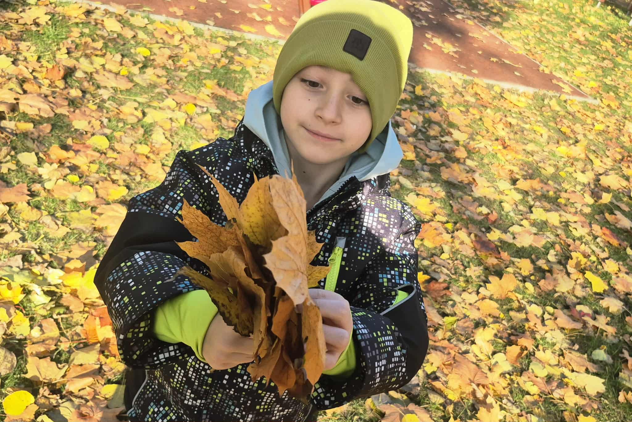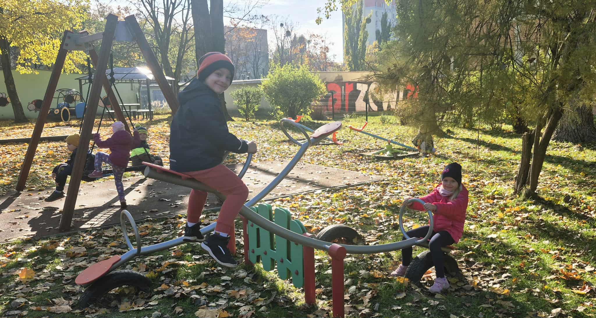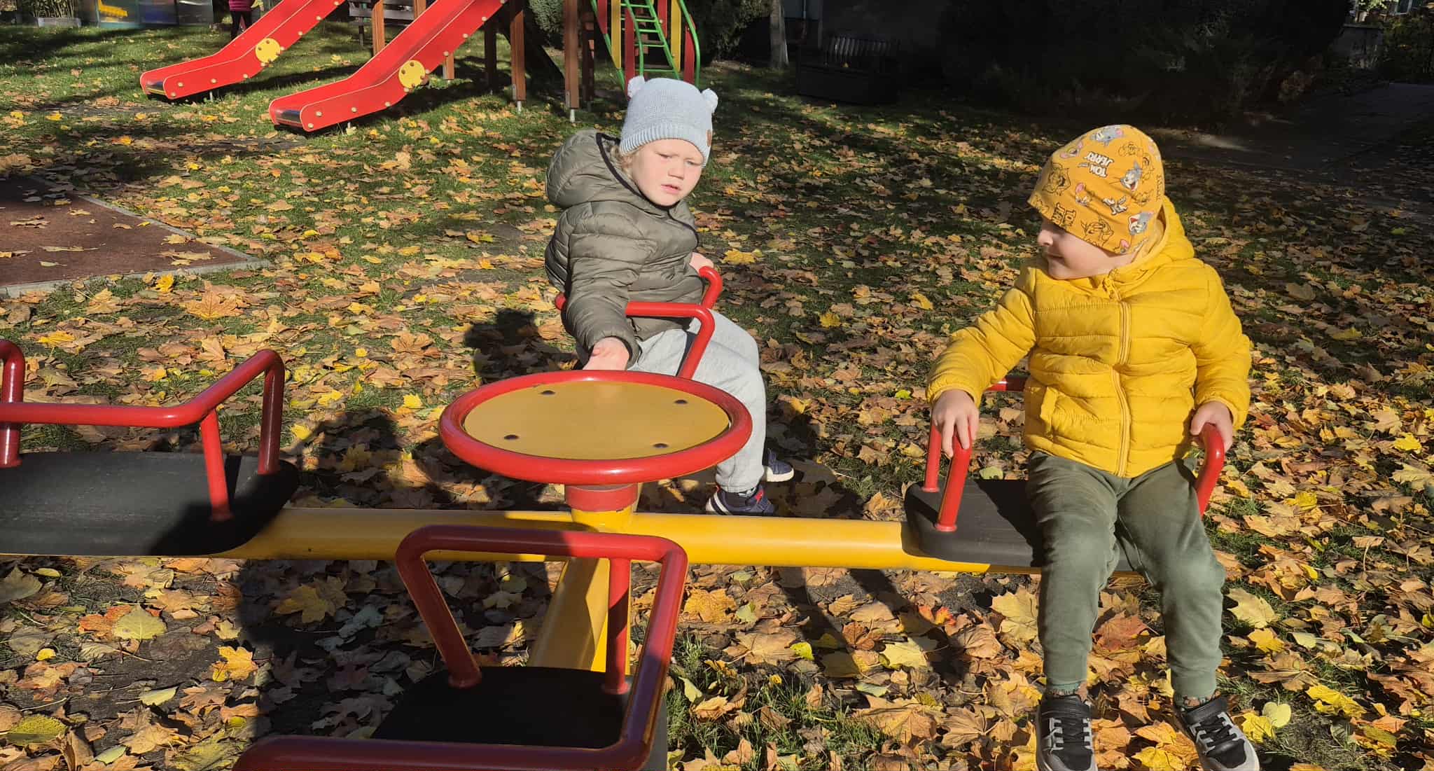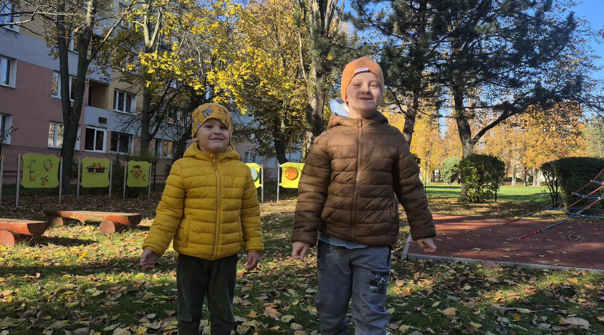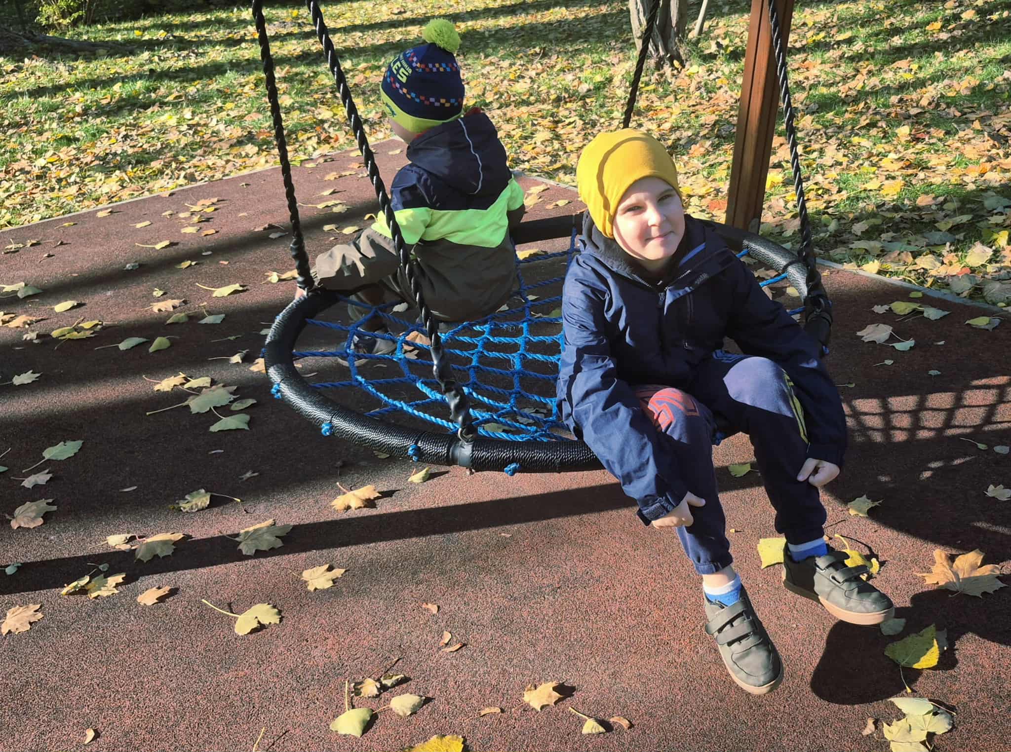 Dzieci z grupy 5 korzystając z pięknej pogody bawiły się na przedszkolnym placu zabaw w otoczeniu pięknej jesiennej aury wśród kolorowych liści.