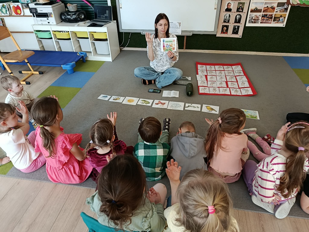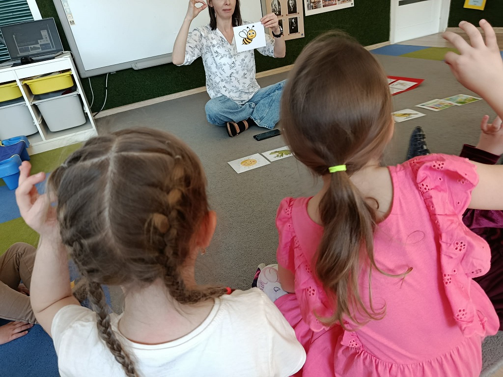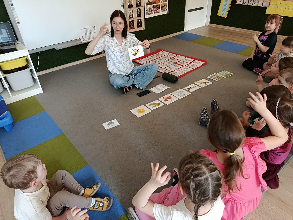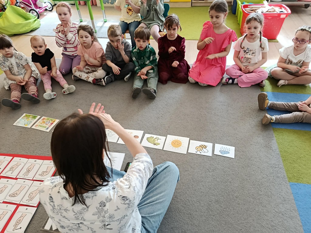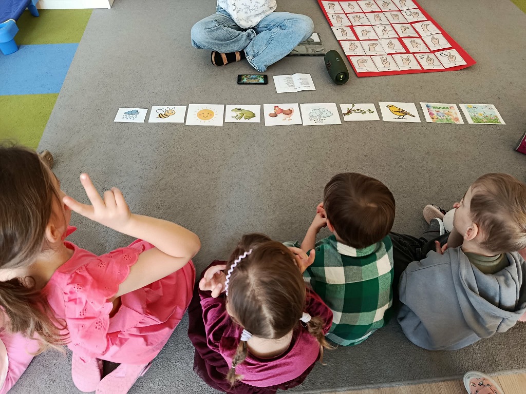 Dzieci nauczyły się kolejnych znaków w ramach Ogólnorozwojowego Projektu Migowego Migumig takich jak, wiosna, pszczoła, ptak, żaba, kwiat, zimno, ciepło, wesoły smutny i wiele innych. Z dużym zaangażowaniem uczestniczą w zajęciach oraz chętnie uczą się języka migowego.