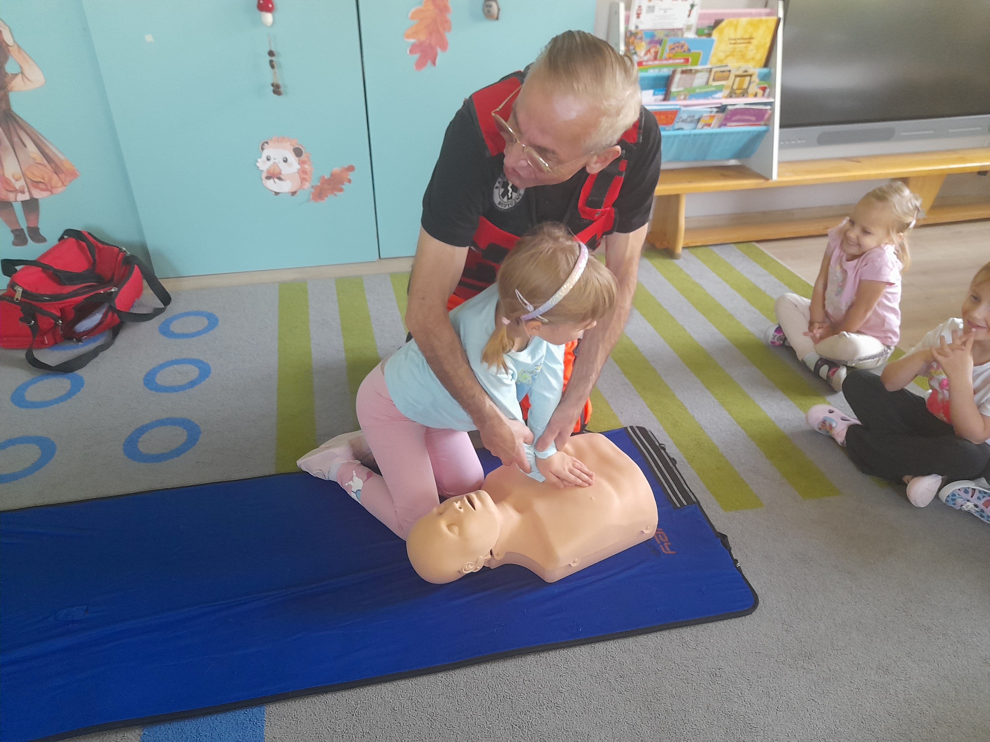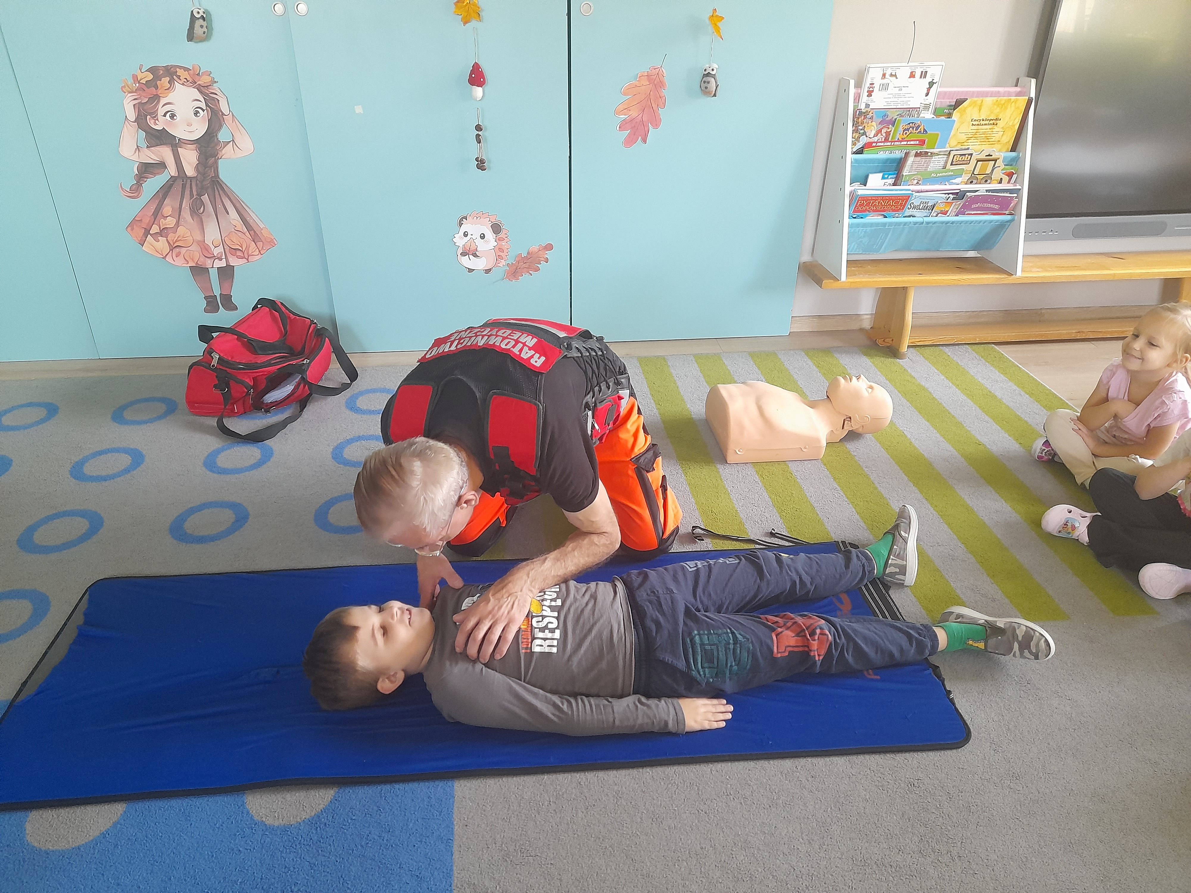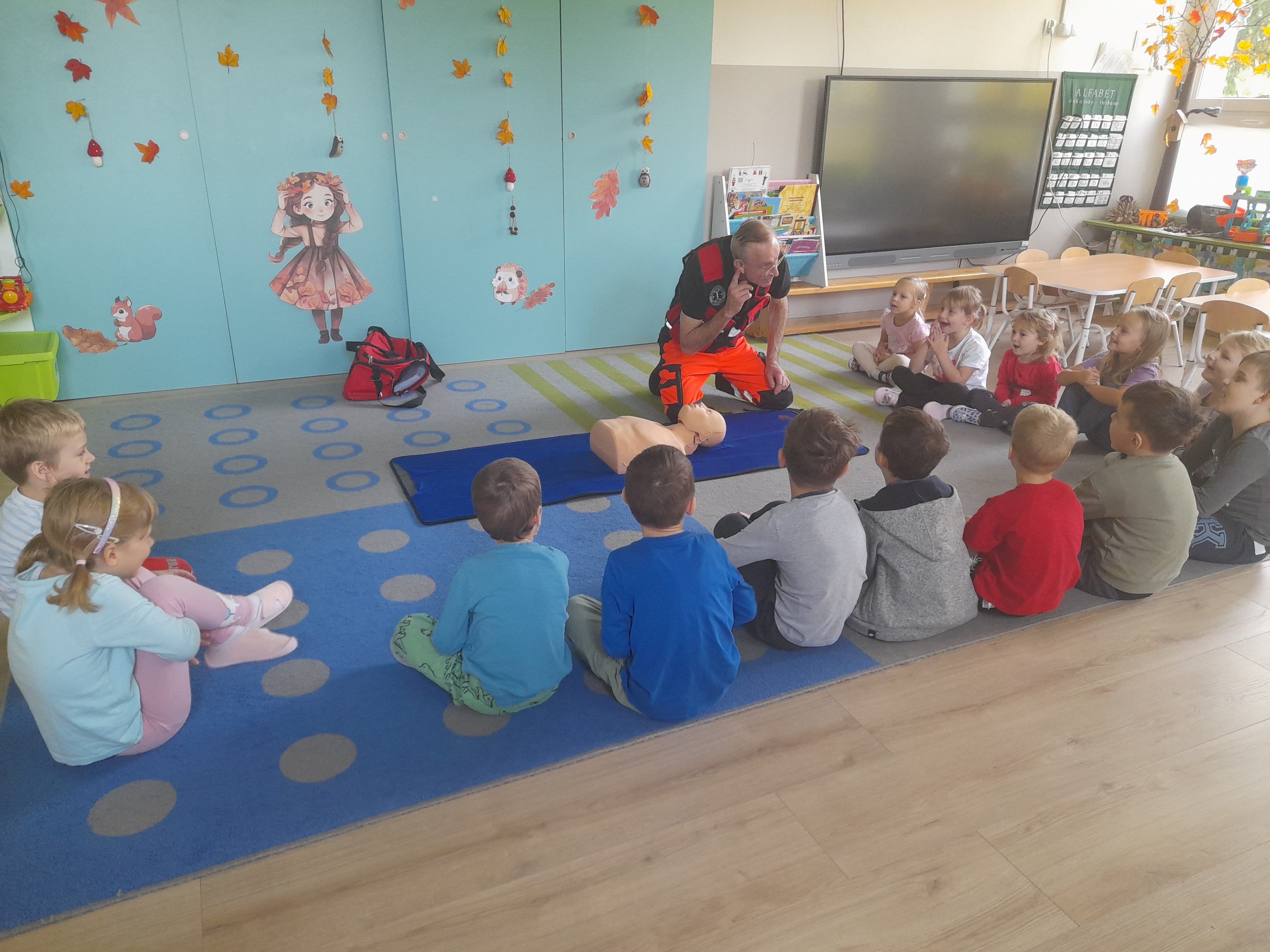 Przedszkolaki z grupy 5 uczestniczyły w zajęciach z Pierwszej Pomocy Przedmedycznej. Dzieci przypomniały sobie numery alarmowe oraz jak prawidłowo wykonywać masaż serca i ułożyć nieprzytomną osobę w pozycji bezpiecznej. Dzieci bardzo chętnie i aktywnie uczestniczyły w zajęciach a na koniec otrzymały dyplom "Małego ratownika".