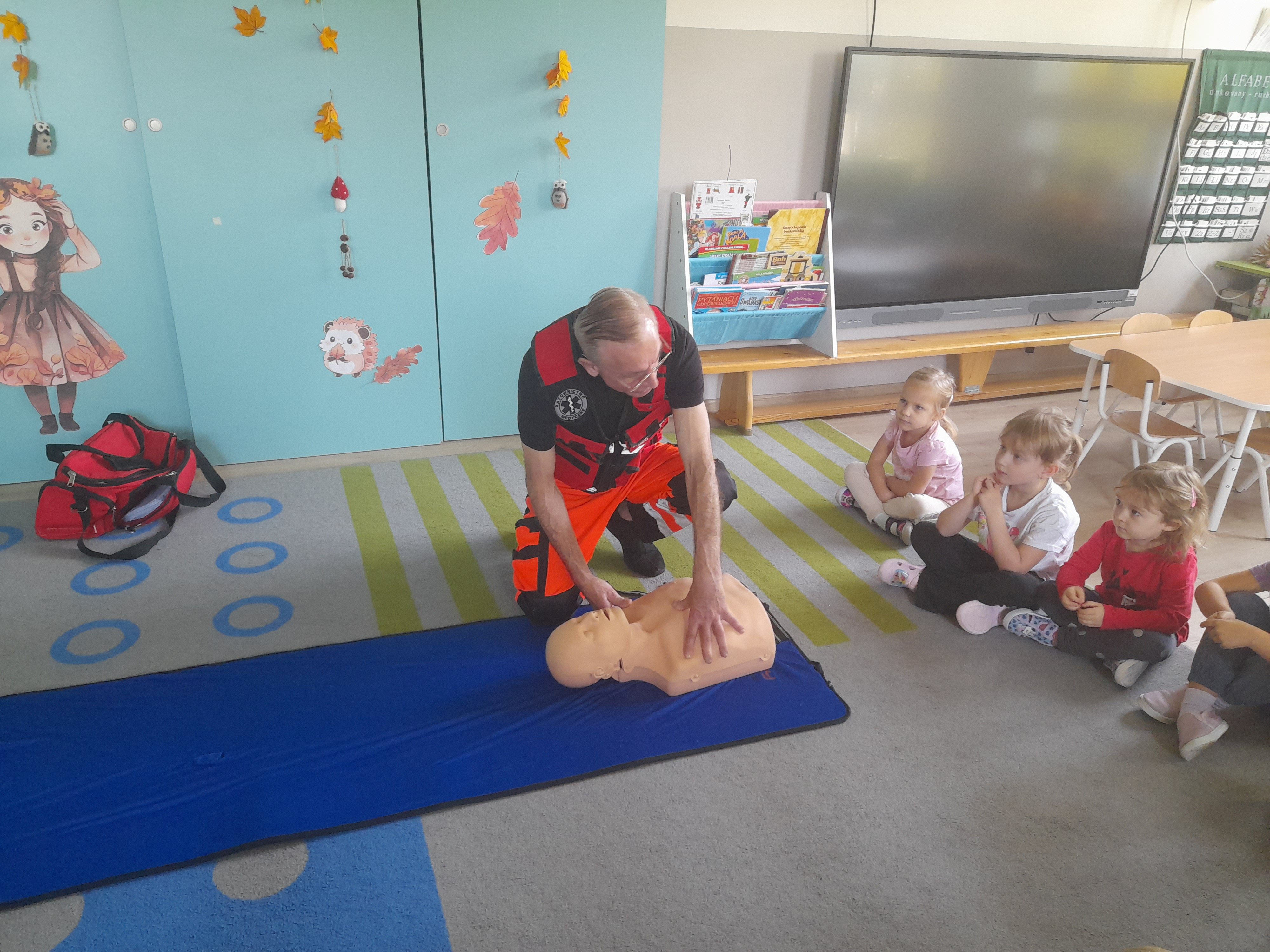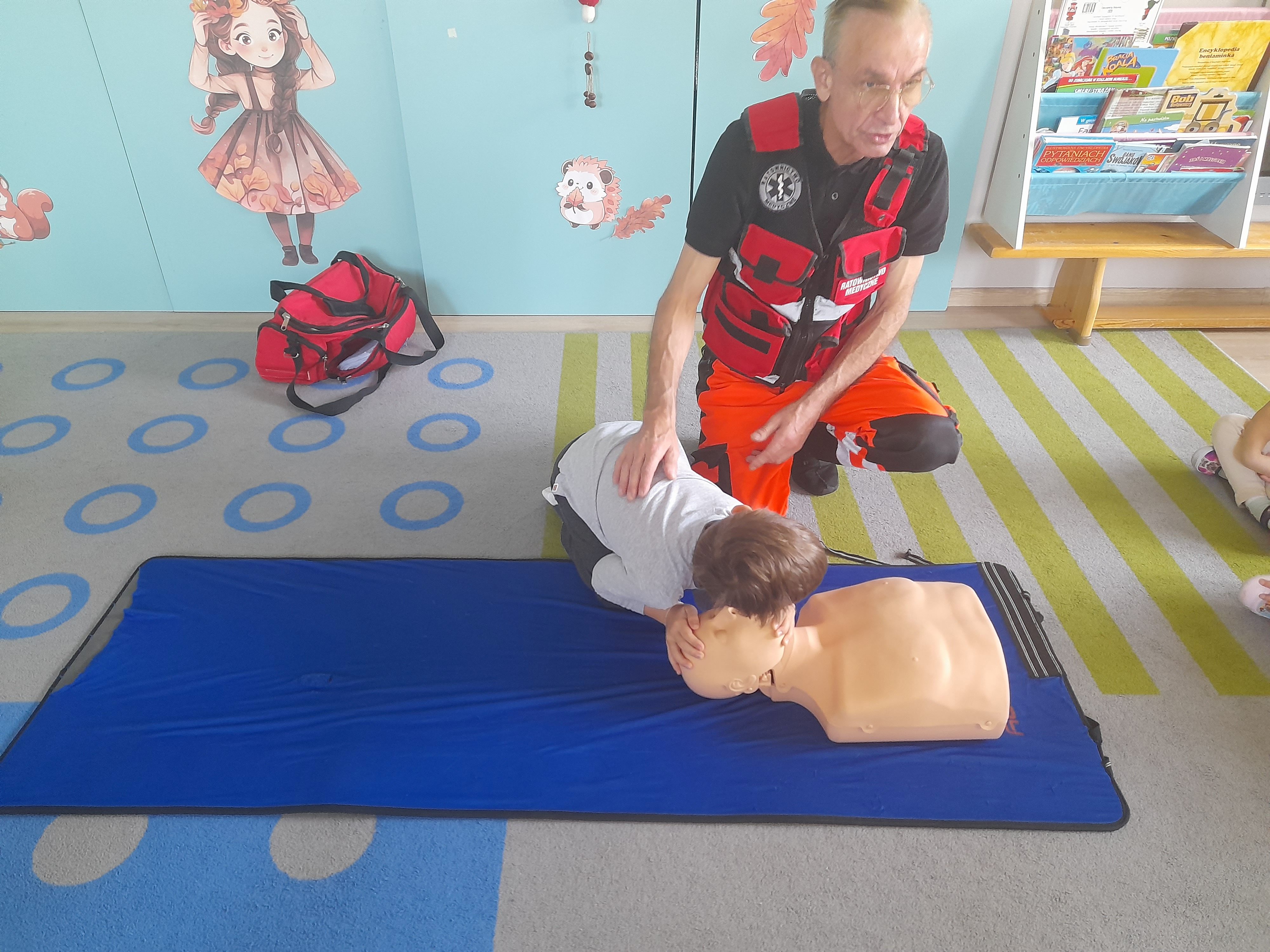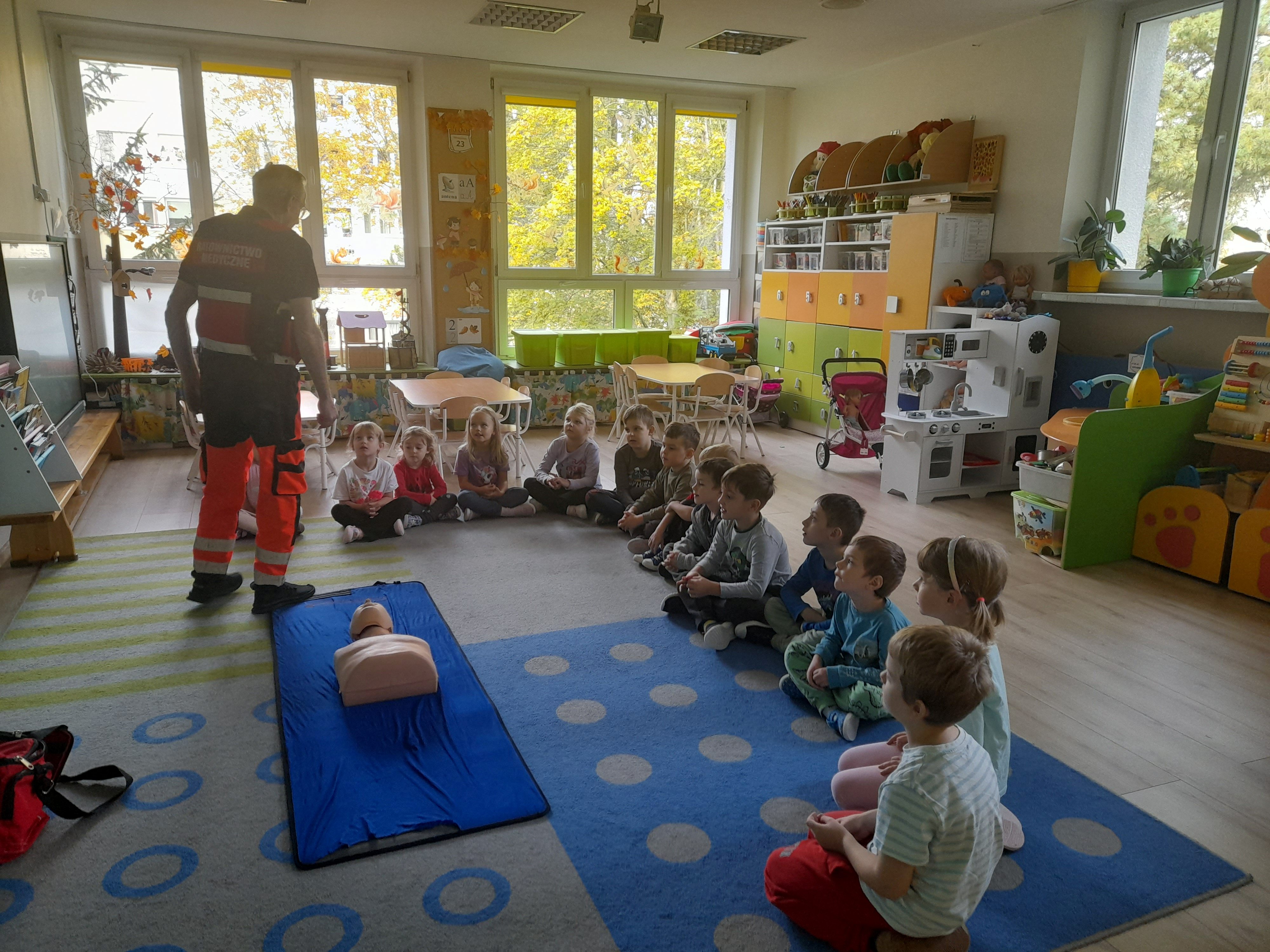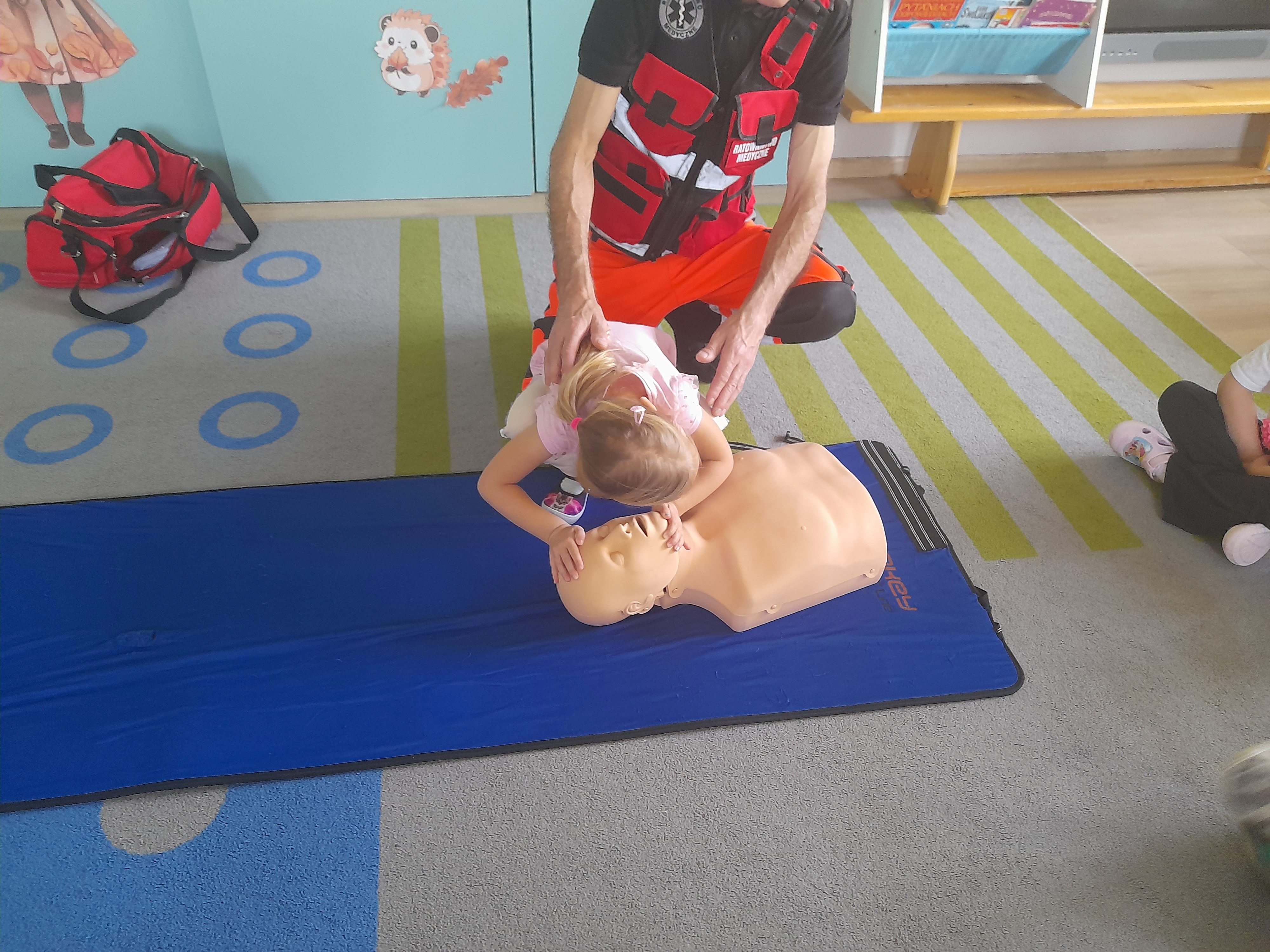 Przedszkolaki z grupy 5 uczestniczyły w zajęciach z Pierwszej Pomocy Przedmedycznej. Dzieci przypomniały sobie numery alarmowe oraz jak prawidłowo wykonywać masaż serca i ułożyć nieprzytomną osobę w pozycji bezpiecznej. Dzieci bardzo chętnie i aktywnie uczestniczyły w zajęciach a na koniec otrzymały dyplom "Małego ratownika".