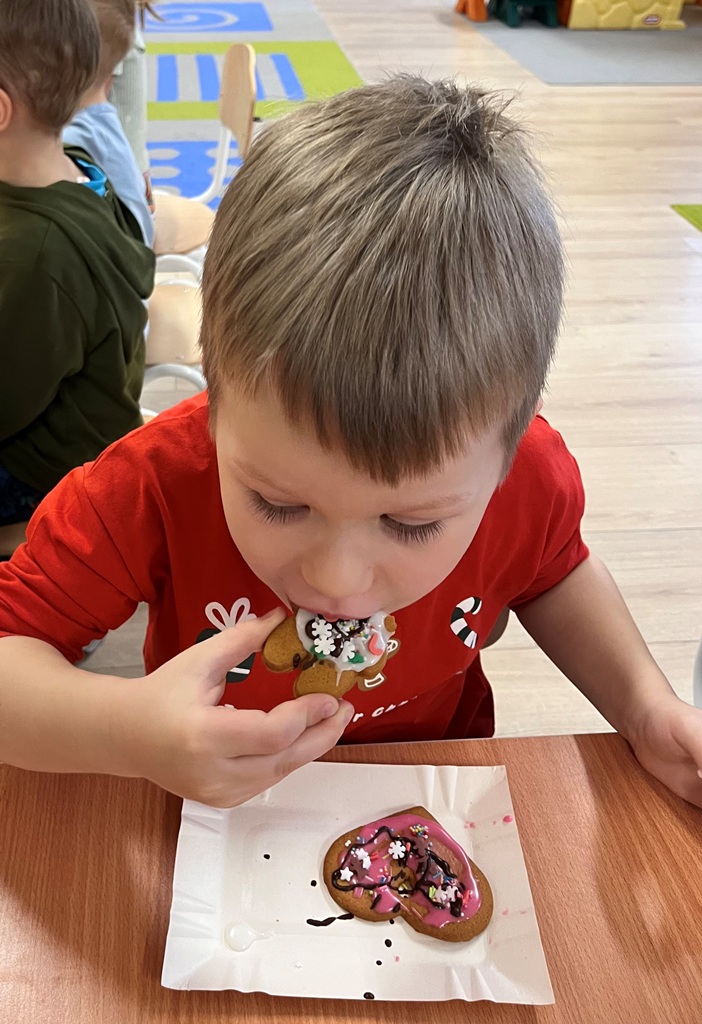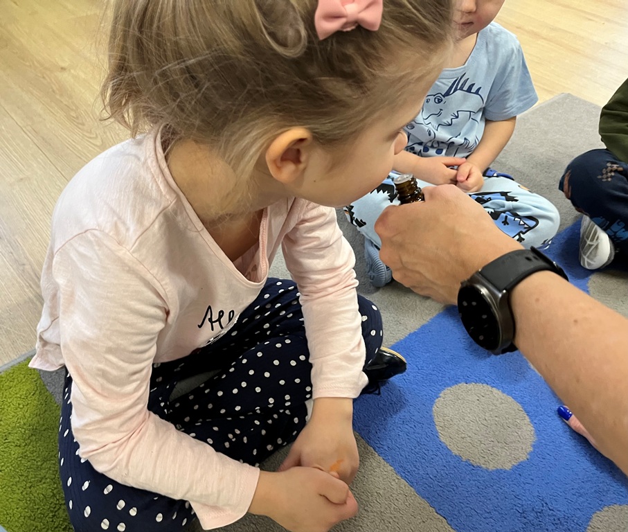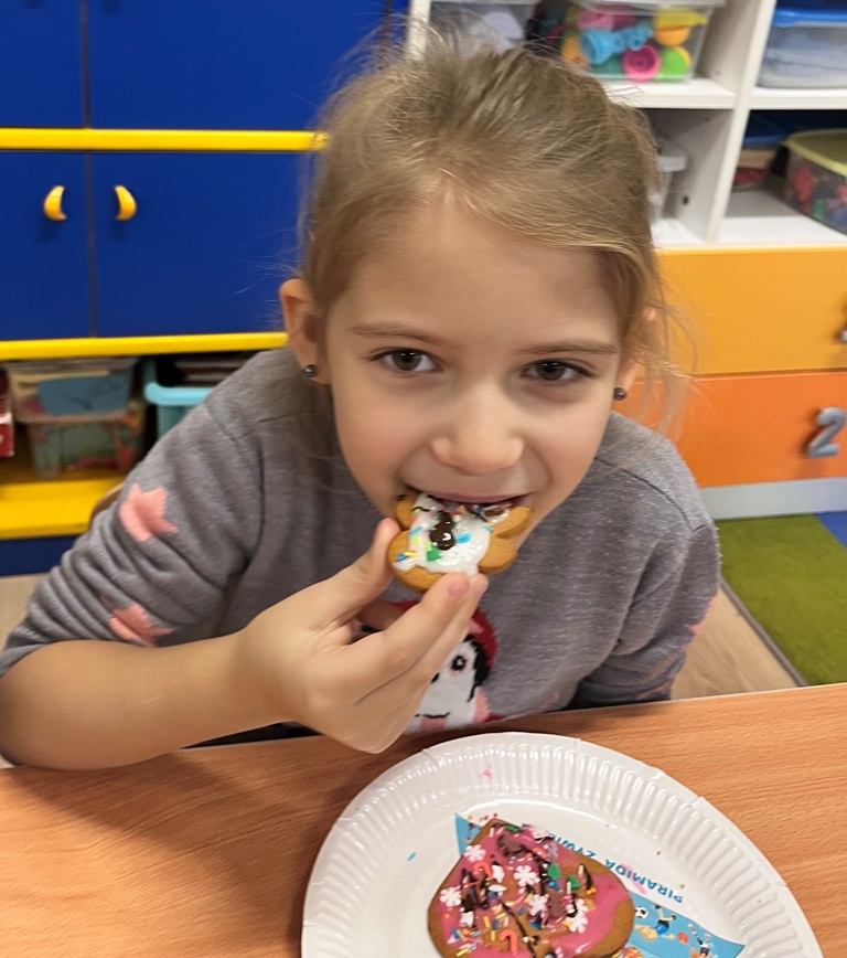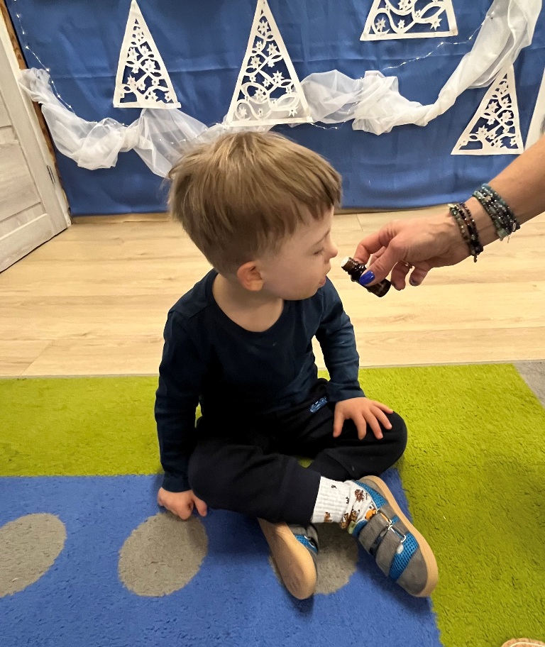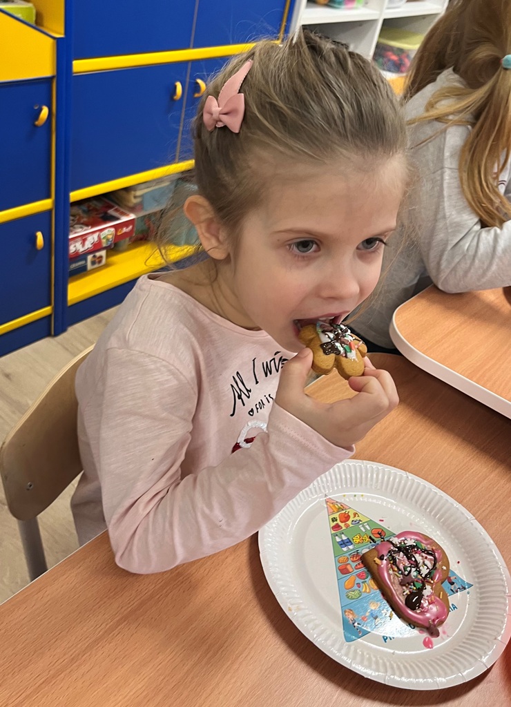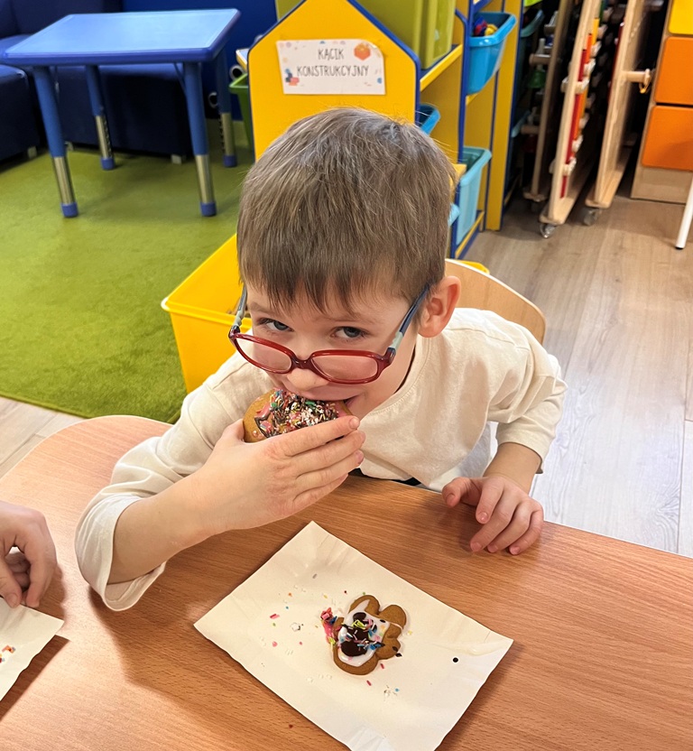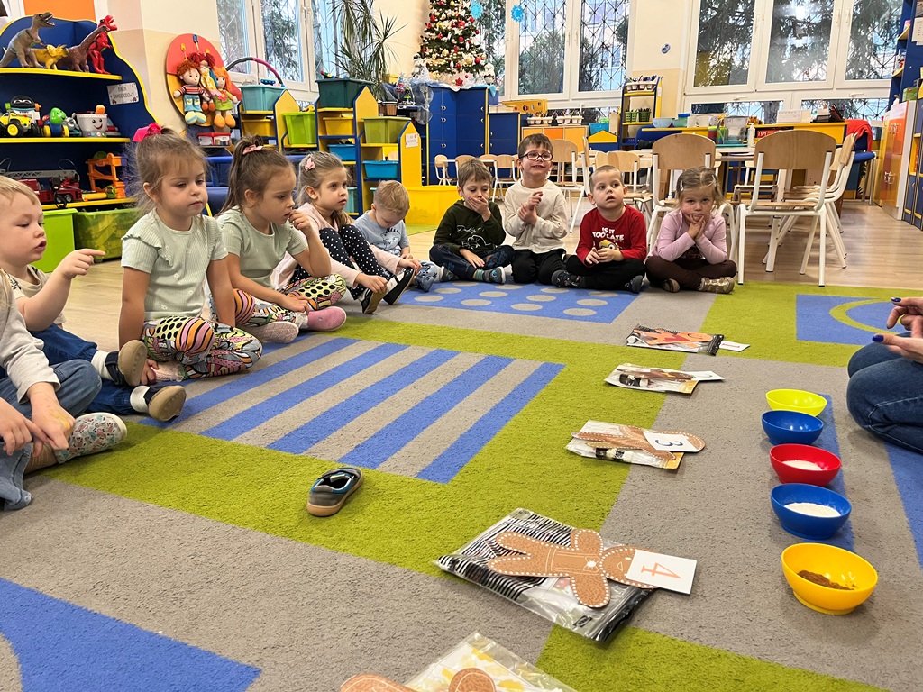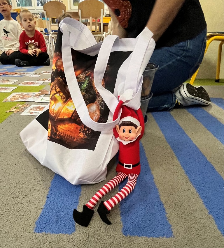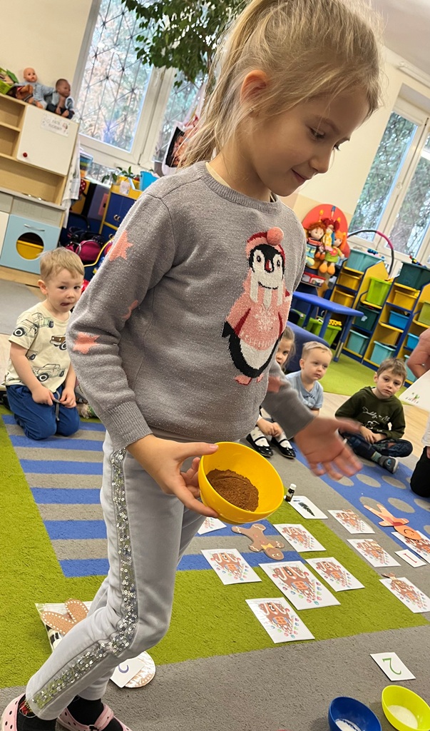 Kolejna niespodzianka od psotnego elfa Teo była pachnąca. W wielkiej torbie zawieszonej na naszym kwiatku, Teo zostawił różne pachnące zadania dla dzieci. Zadaniem dzieci było odgadnięcie, co to za produkty. Potem wszyscy wspólnie dekorowali pierniki i zjedli je ze smakiem.