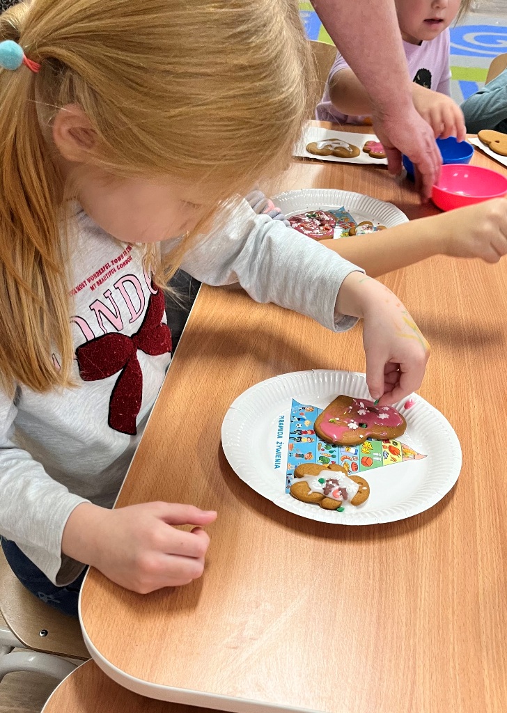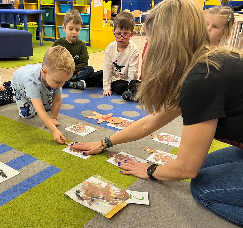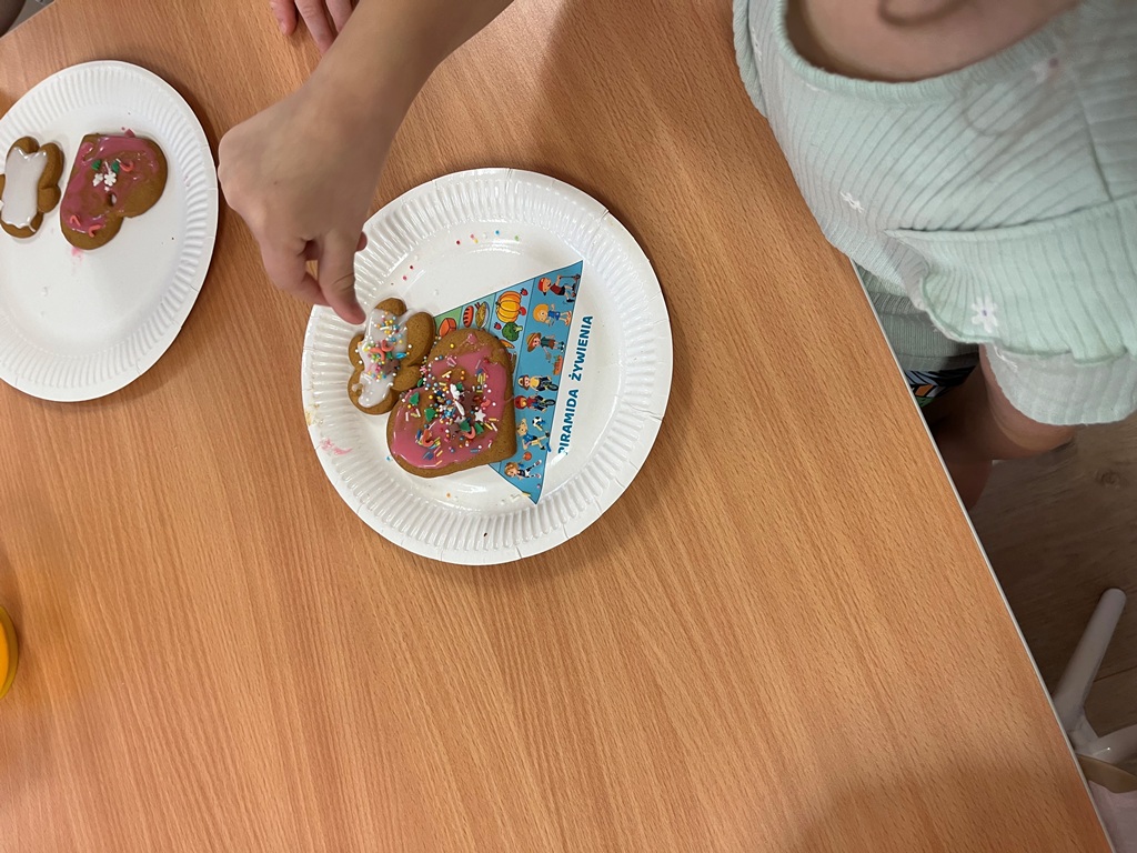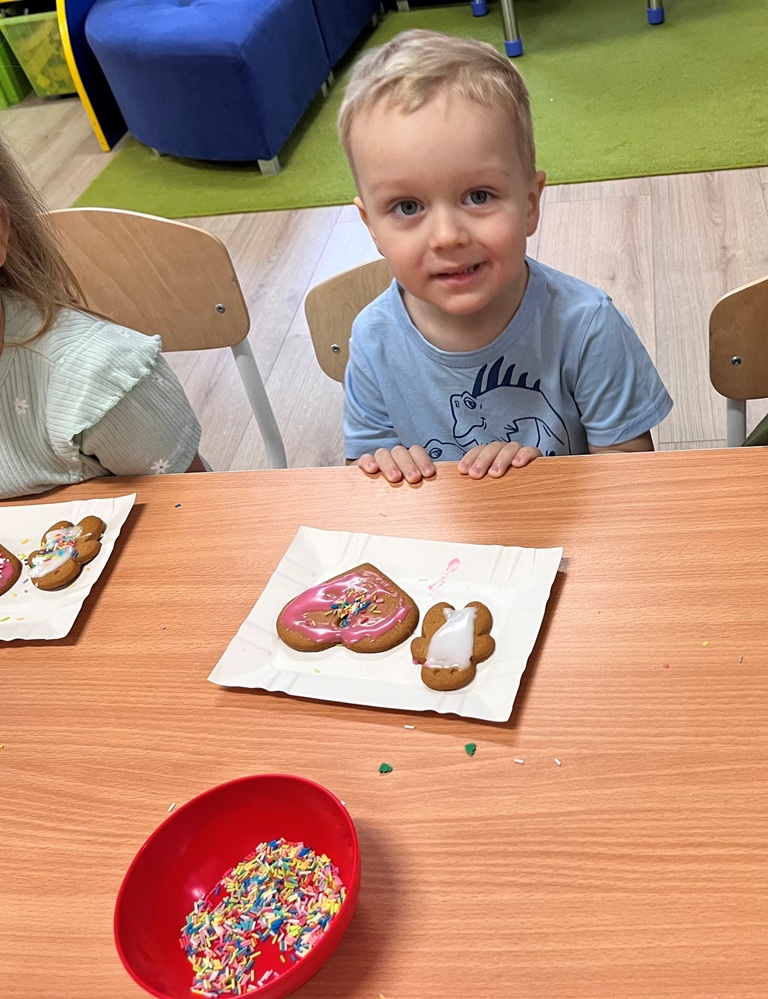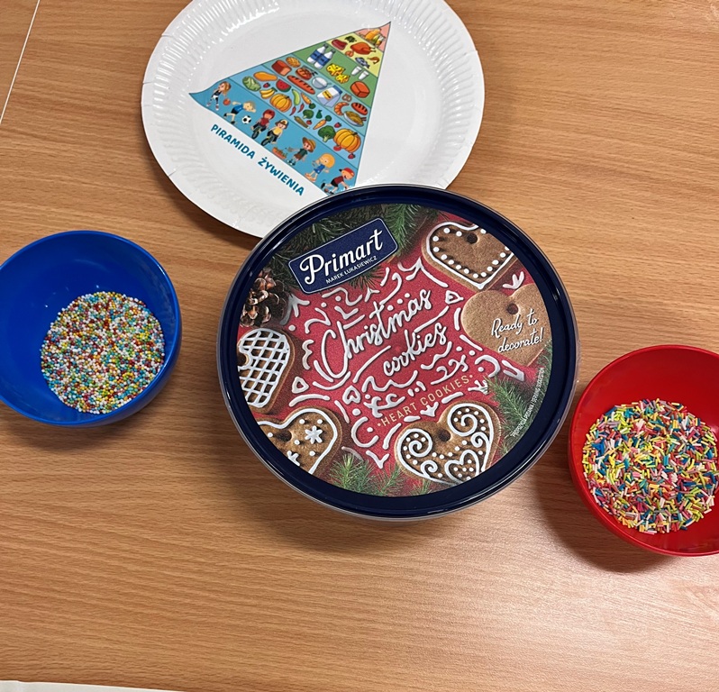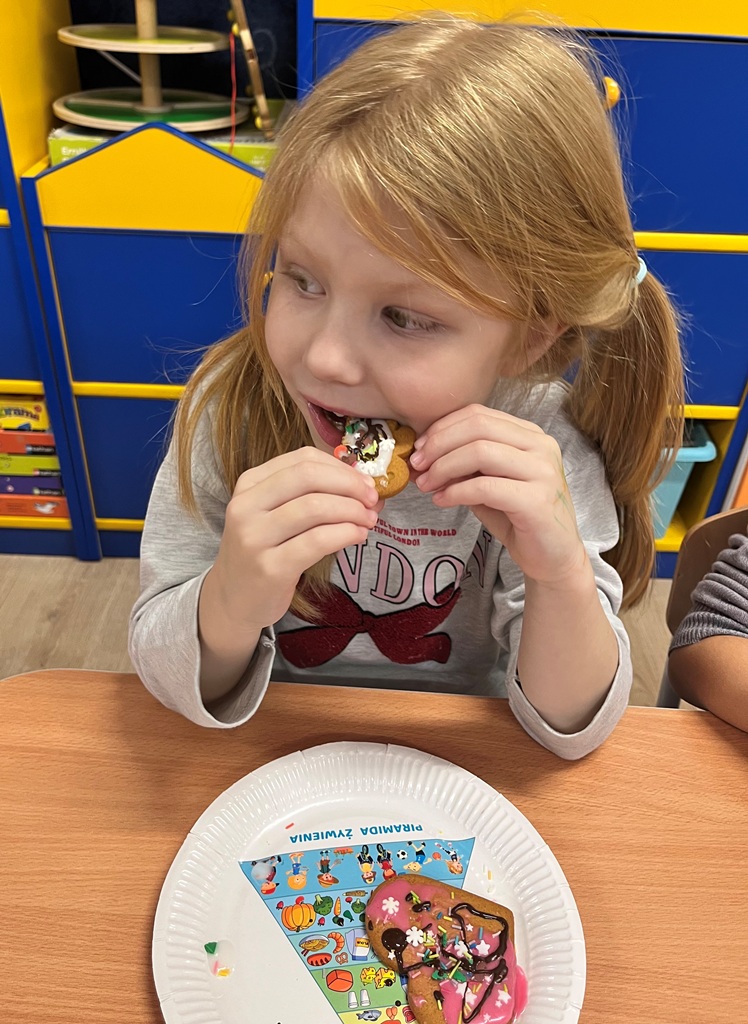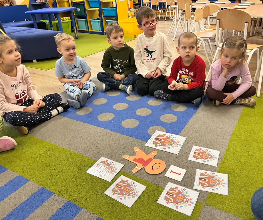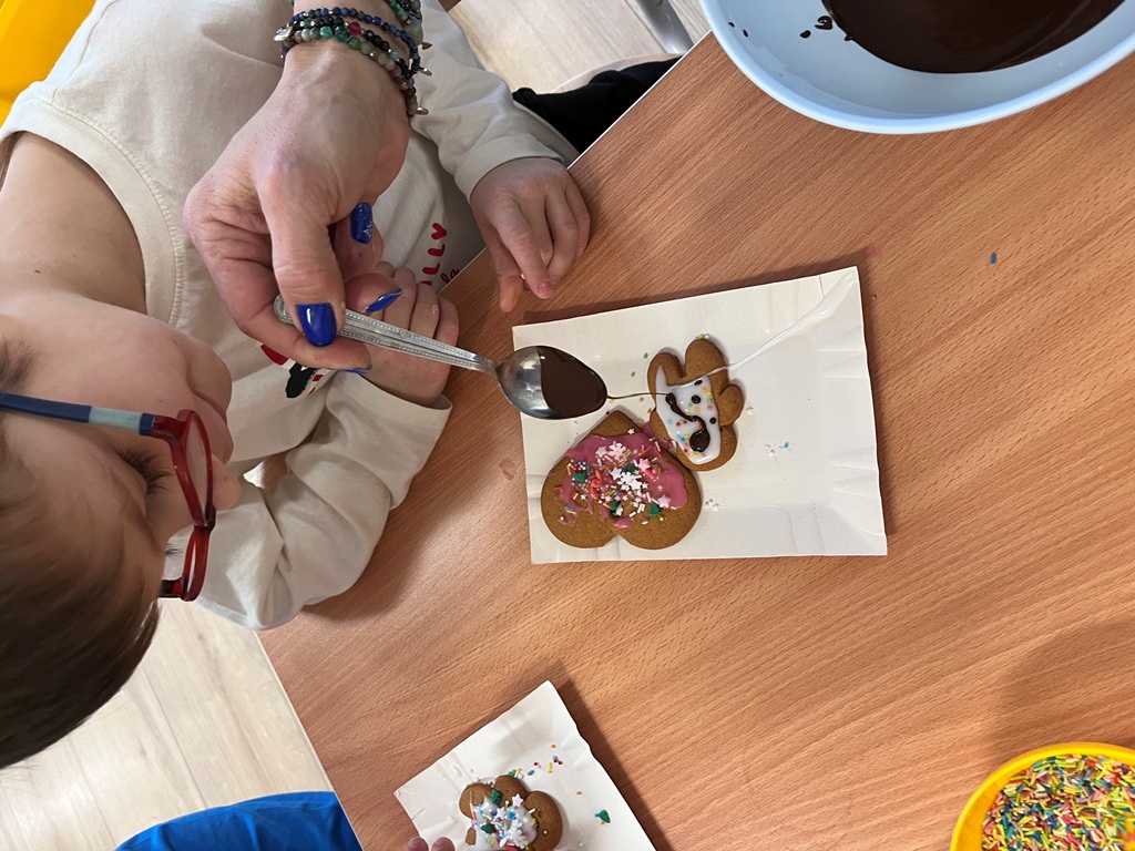Kolejna niespodzianka od psotnego elfa Teo była pachnąca. W wielkiej torbie zawieszonej na naszym kwiatku, Teo zostawił różne pachnące zadania dla dzieci. Zadaniem dzieci było odgadnięcie, co to za produkty. Potem wszyscy wspólnie dekorowali pierniki i zjedli je ze smakiem.