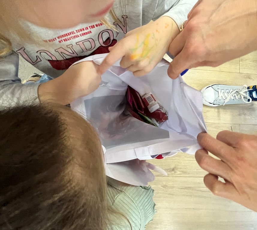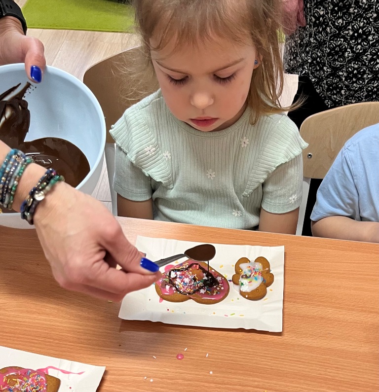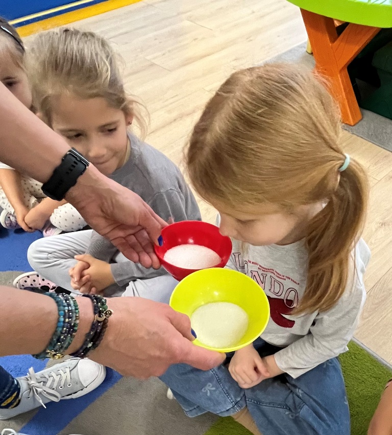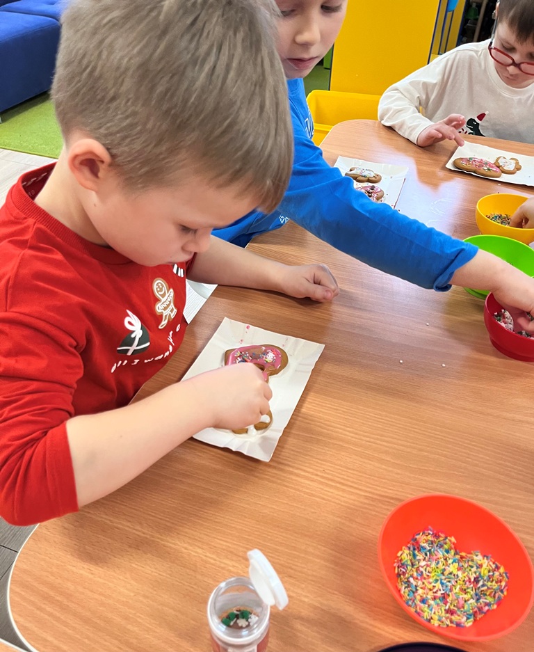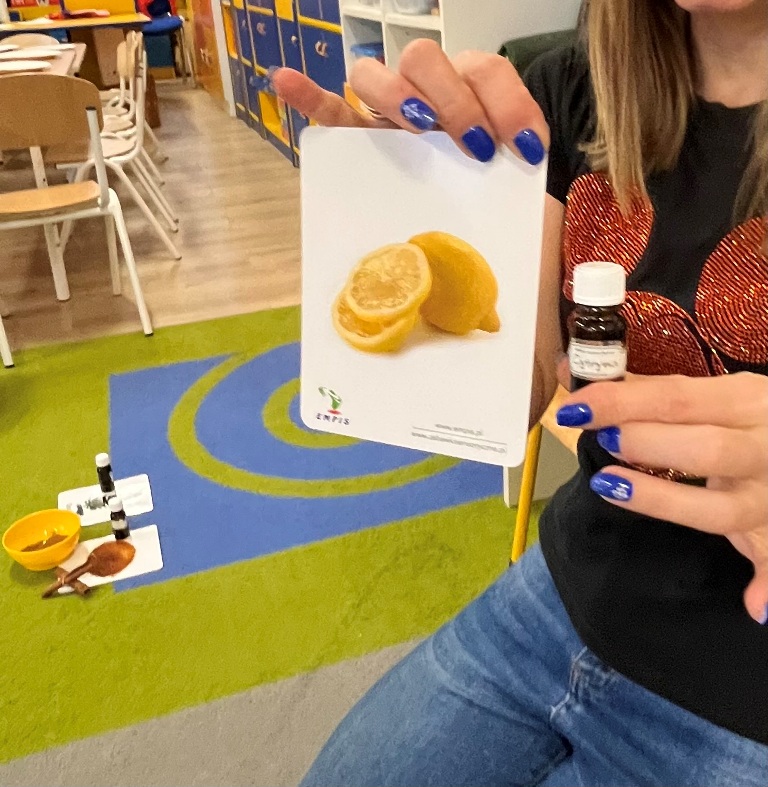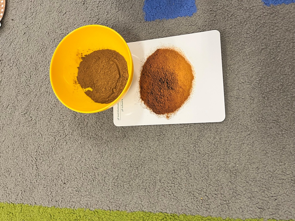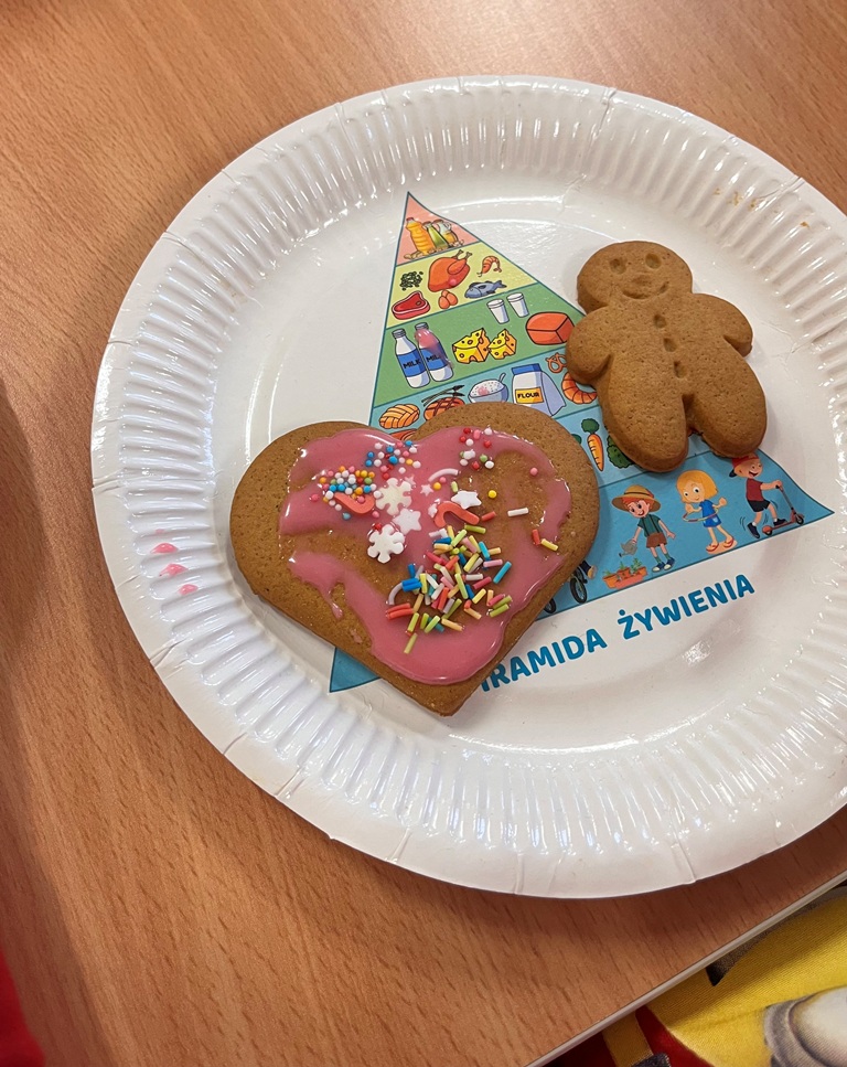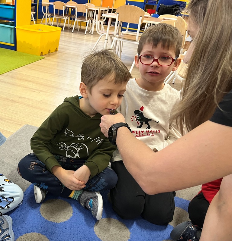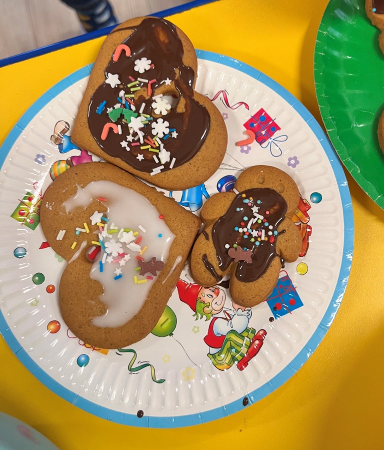 Kolejna niespodzianka od psotnego elfa Teo była pachnąca. W wielkiej torbie zawieszonej na naszym kwiatku, Teo zostawił różne pachnące zadania dla dzieci. Zadaniem dzieci było odgadnięcie, co to za produkty. Potem wszyscy wspólnie dekorowali pierniki i zjedli je ze smakiem.