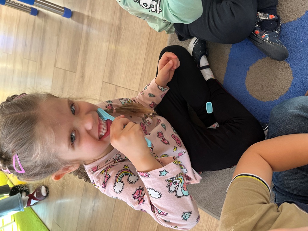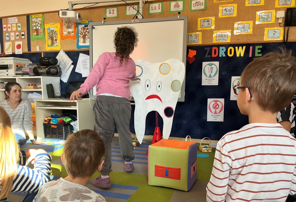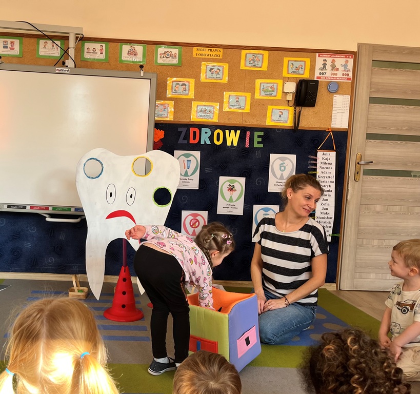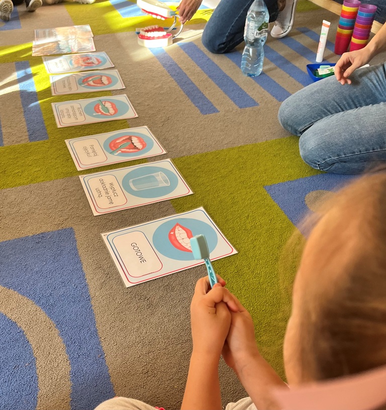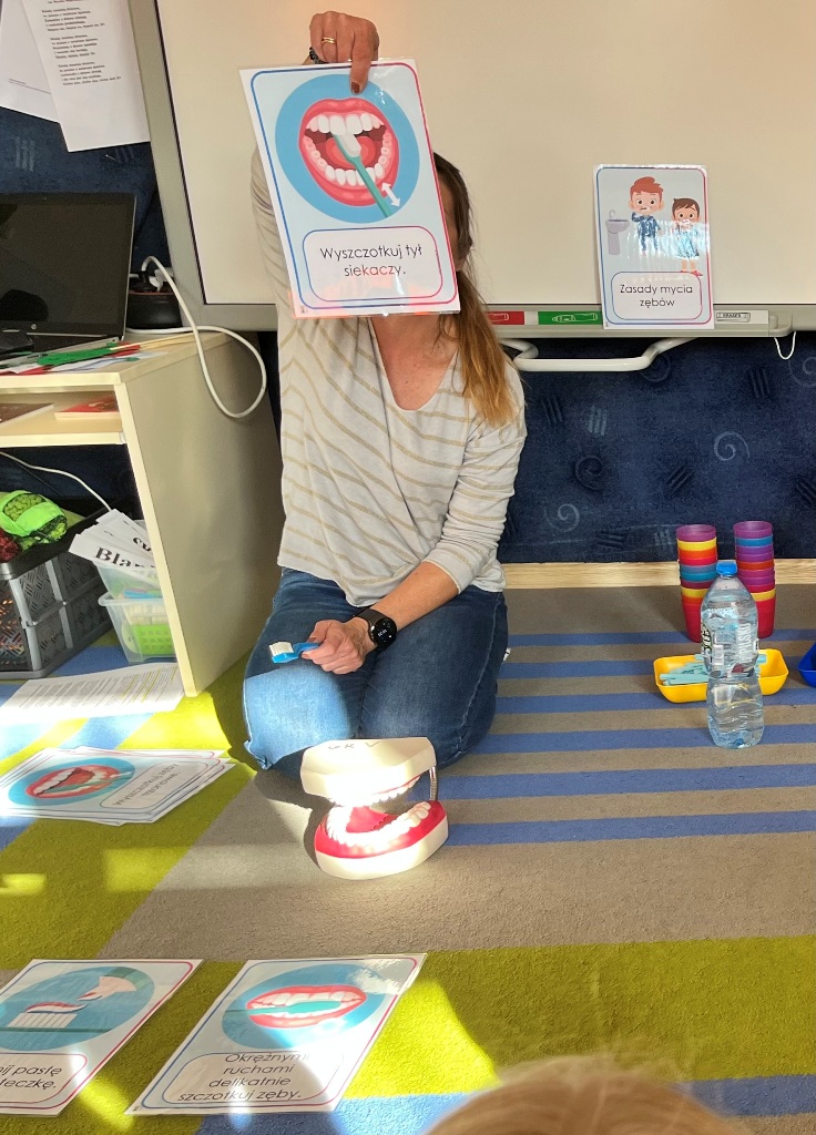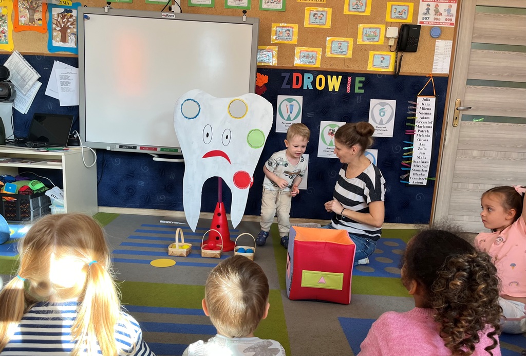 Podczas zajęć, dzieci uczyły się jak dbać o higienę jamy ustnej, doskonaliły technikę prawidłowego mycia zębów używając jednorazowych szczoteczek. Oglądnęły teatrzyk "Przygody Zębusia", który zapomniał umyć zębów, a potem wspólnie leczyły go rzutami do celu. Na koniec zajęć wykonały zadanie na tabletach i otrzymały karty monitorowania mycia zębów w domu.