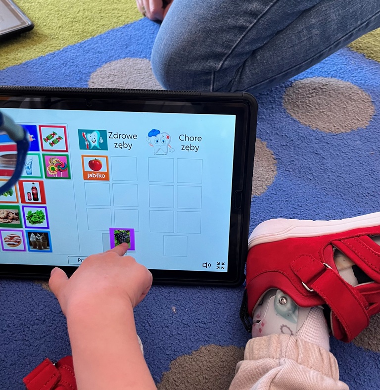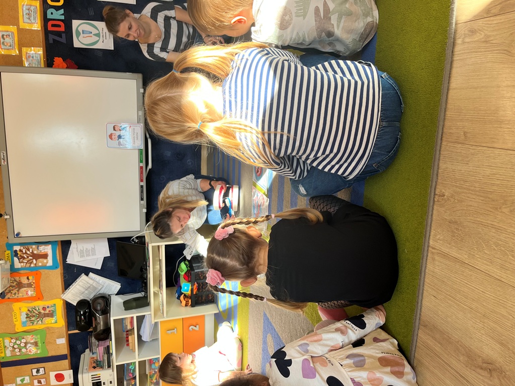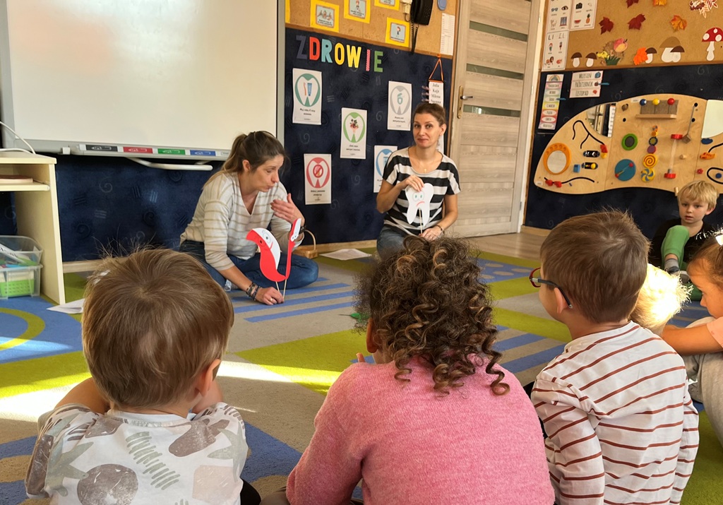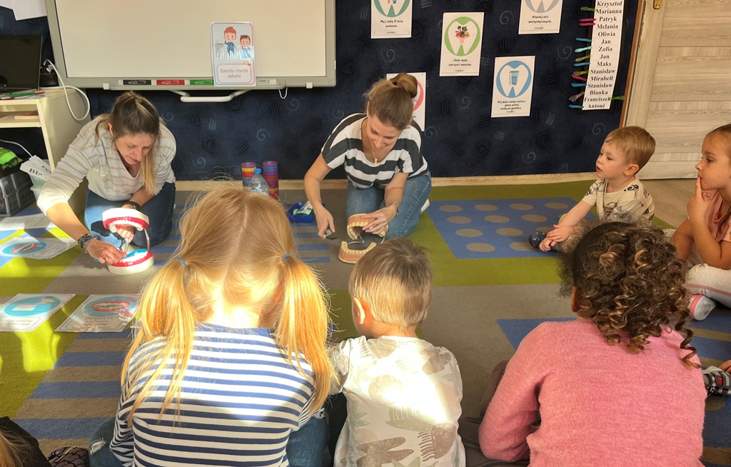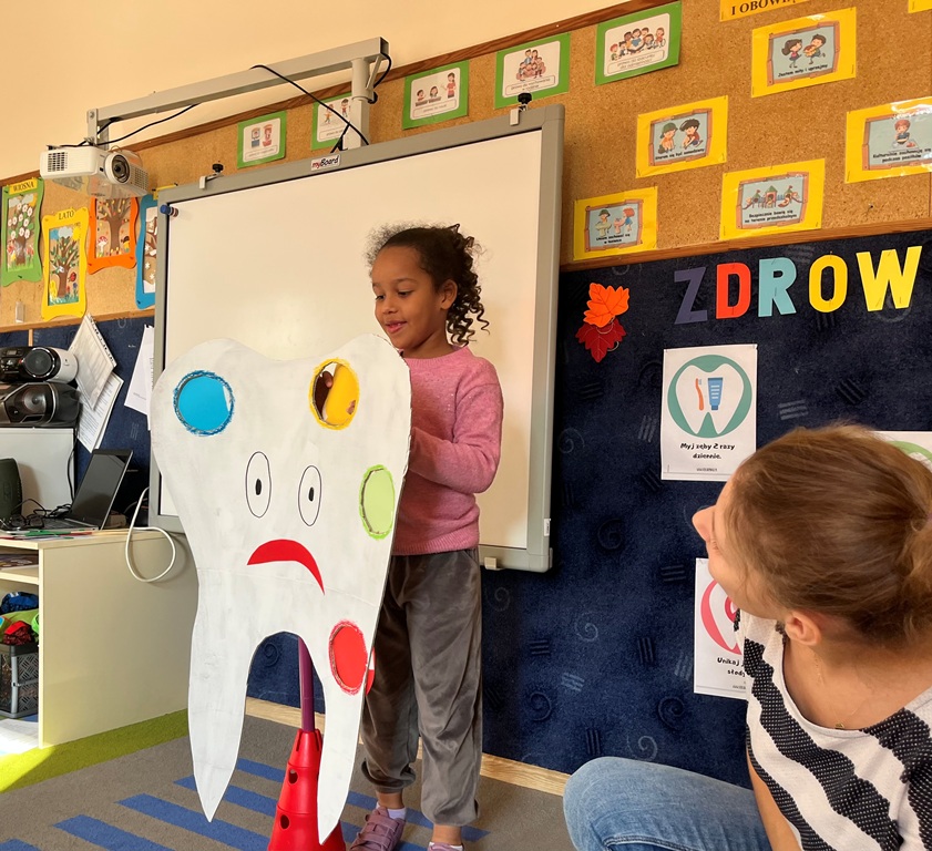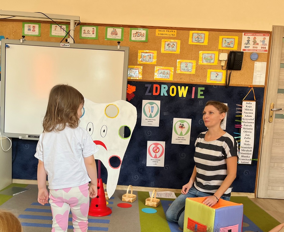 Podczas zajęć, dzieci uczyły się jak dbać o higienę jamy ustnej, doskonaliły technikę prawidłowego mycia zębów używając jednorazowych szczoteczek. Oglądnęły teatrzyk "Przygody Zębusia", który zapomniał umyć zębów, a potem wspólnie leczyły go rzutami do celu. Na koniec zajęć wykonały zadanie na tabletach i otrzymały karty monitorowania mycia zębów w domu.