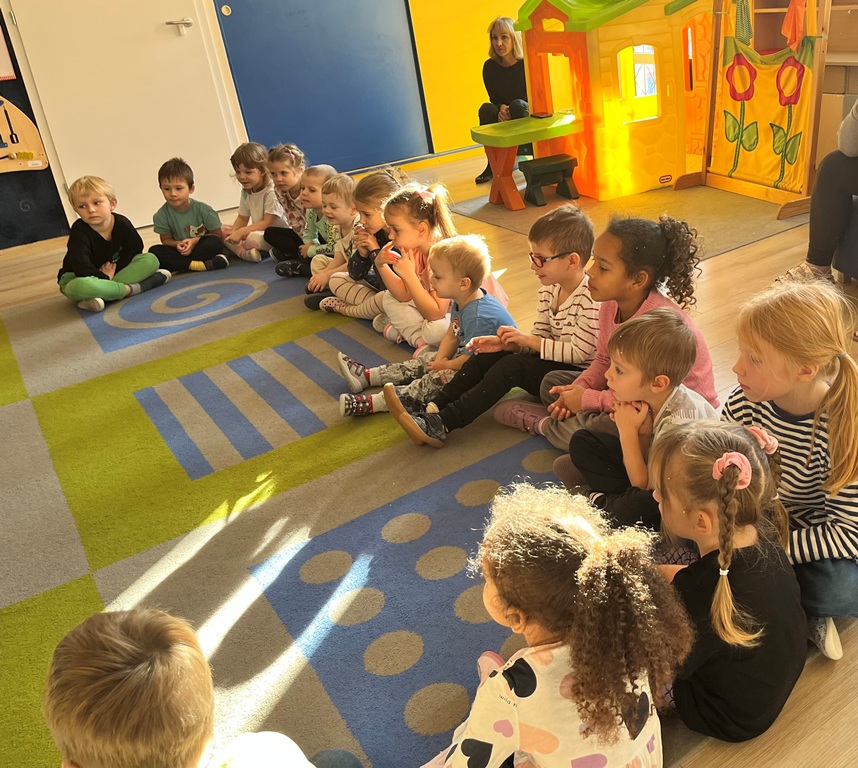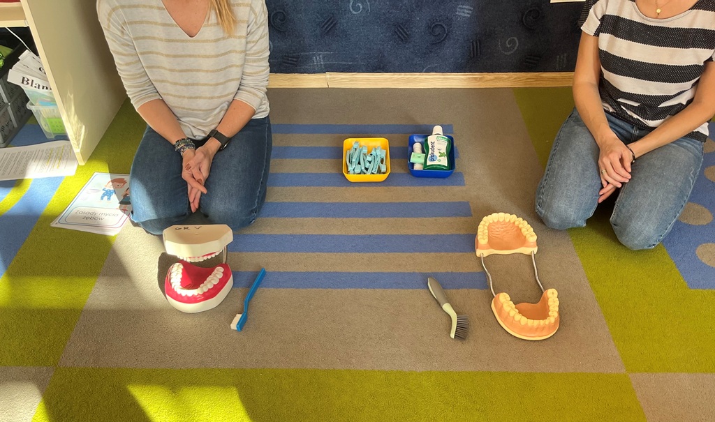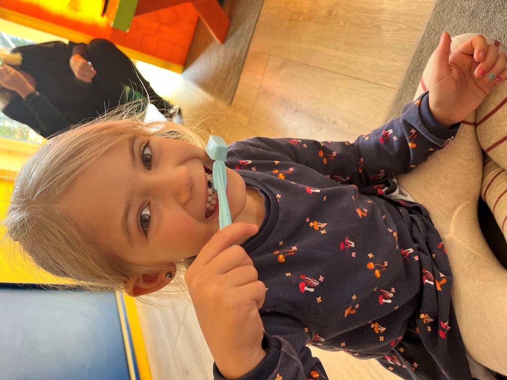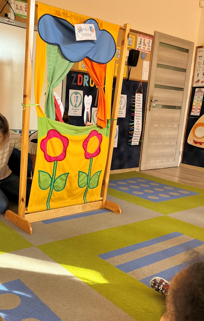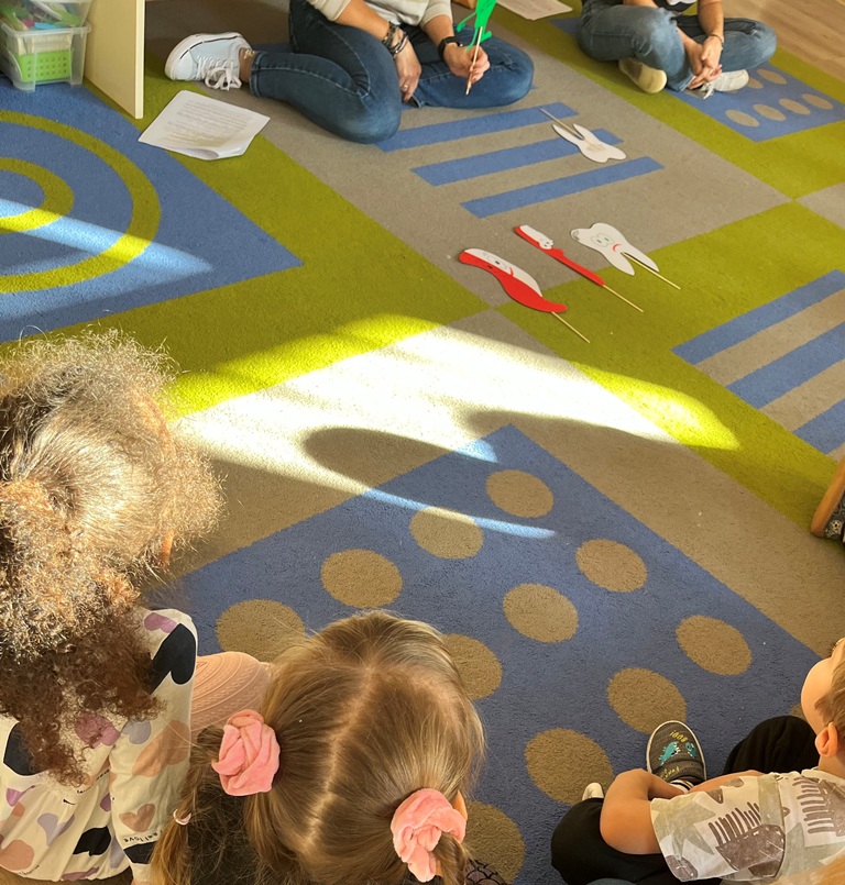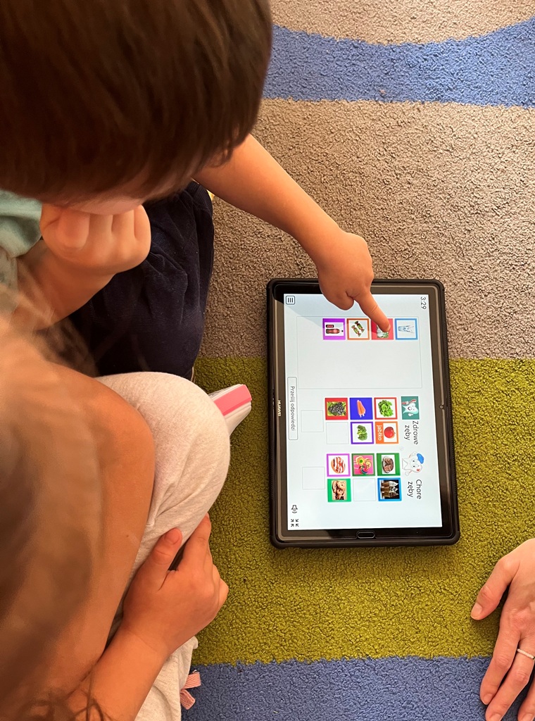 Podczas zajęć, dzieci uczyły się jak dbać o higienę jamy ustnej, doskonaliły technikę prawidłowego mycia zębów używając jednorazowych szczoteczek. Oglądnęły teatrzyk "Przygody Zębusia", który zapomniał umyć zębów, a potem wspólnie leczyły go rzutami do celu. Na koniec zajęć wykonały zadanie na tabletach i otrzymały karty monitorowania mycia zębów w domu.